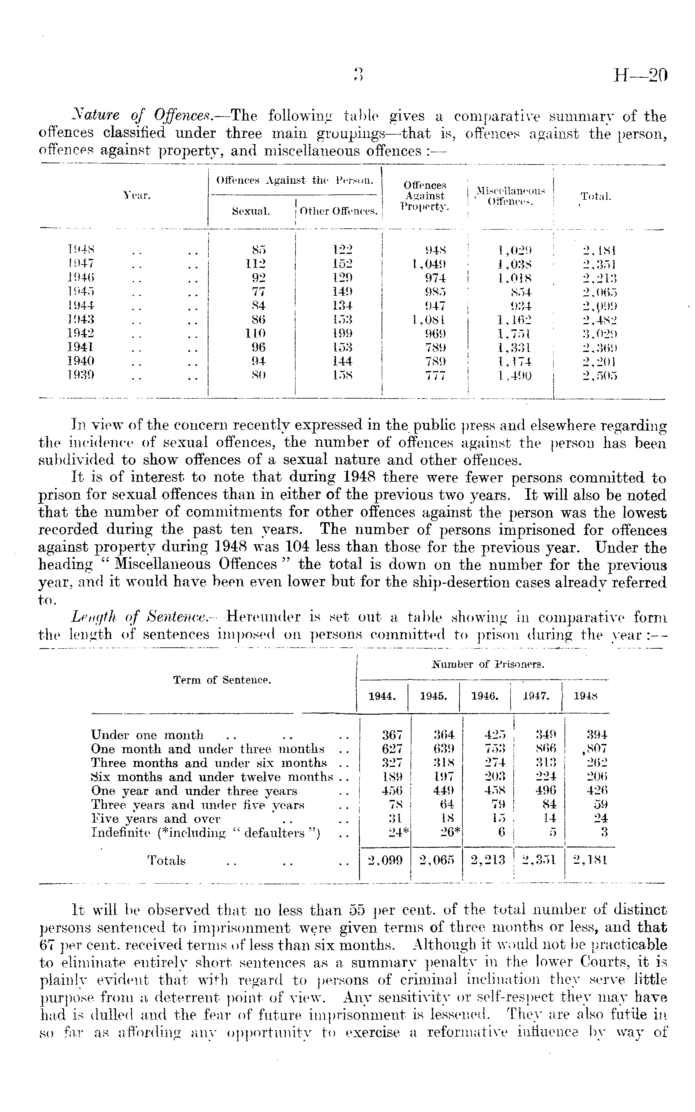In view of the concern recently expressed in the public press and elsewhere regarding the incidence of sexual offences, the number of offences against the person has been subdivided to show offences of a sexual nature and other offences. It is of interest to note that during 1948 there were fewer persons committed to prison for sexual offences than in either of the previous two years. It will also be noted that the number of commitments for other offences against the person was the lowest recorded during the past ten years. The number of persons imprisoned for offences against property during 1948 was 104 less than those for the previous year. Under the heading " Miscellaneous Offences " the total is down on the number for the previous year, and it would have been even lower but for the ship-desertion cases already referred to. Length of Sentence.—Hereunder is set out a table showing in comparative form the length of sentences imposed on persons committed to prison during the year