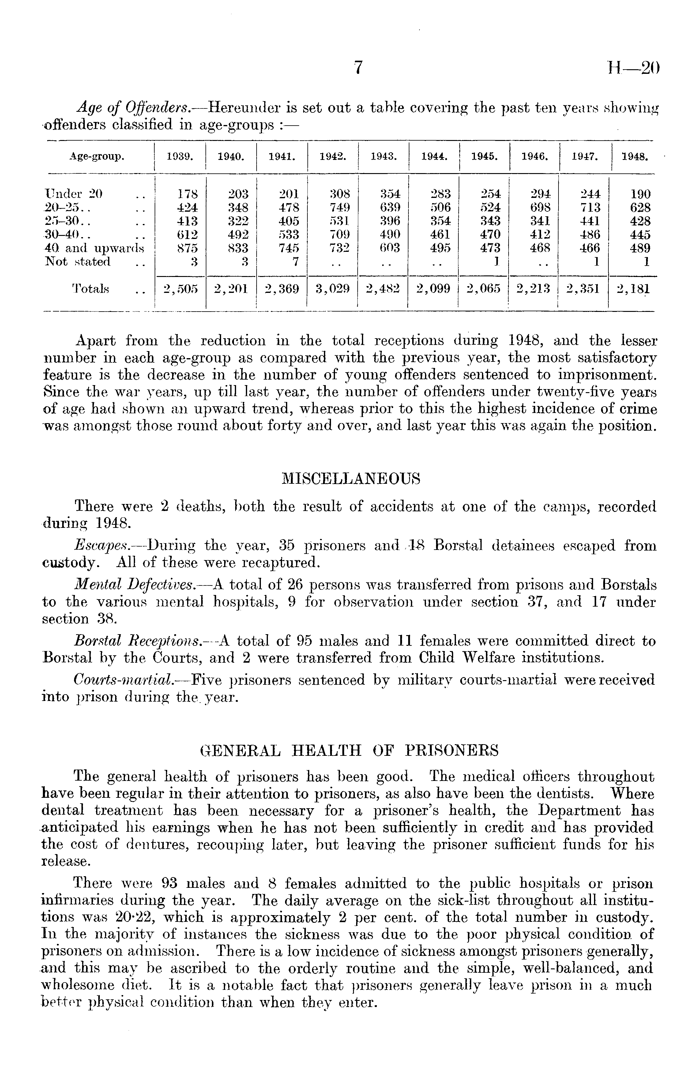 Apart from the reduction in the total receptions during 1948, and the lesser number in each age-group as compared with the previous year, the most satisfactory feature is the decrease in the number of young offenders sentenced to imprisonment. Since the war years, up till last year, the number of offenders under twenty-five years of age had shown an upward trend, whereas prior to this the highest incidence of crime was amongst those round about forty and over, and last year this was again the position. MISCELLANEOUS There were 2 deaths, both the result of accidents at one of the camps, recorded during 1948. Escapes.—During the year, 35 prisoners and -18 Borstal detainees escaped from custody. All of these were recaptured. Mental Defectives. —A total of 26 persons was transferred from prisons and Borstals to the various mental hospitals, 9 for observation under section 37, and 17 under section 38. Borstal Receptions. —A total of 95 males and 11 females were committed direct to Borstal by the Courts, and 2 were transferred from Child Welfare institutions. Courts-martial. —Five prisoners sentenced by military courts-martial were received into prison during the. year. GENERAL HEALTH OF PRISONERS The general health of prisoners has been good. The medical officers throughout have been regular in their attention to prisoners, as also have been the dentists. Where dental treatment has been necessary for a prisoner's health, the Department has .anticipated his earnings when he has not been sufficiently in credit and has provided the cost of dentures, recouping later, but leaving the prisoner sufficient funds for his release. There were 93 males and 8 females admitted to the public hospitals or prison infirmaries during the year. The daily average on the sick-list throughout all institutions was 20-22, which is approximately 2 per cent, of the total number in custody. In the majority of instances the sickness was due to the poor physical condition of prisoners on admission. There is a low incidence of sickness amongst prisoners generally, and this may be ascribed to the orderly routine and the simple, well-balanced, and wholesome diet. It is a notable fact that prisoners generally leave prison in a much better physical condition than when they enter.