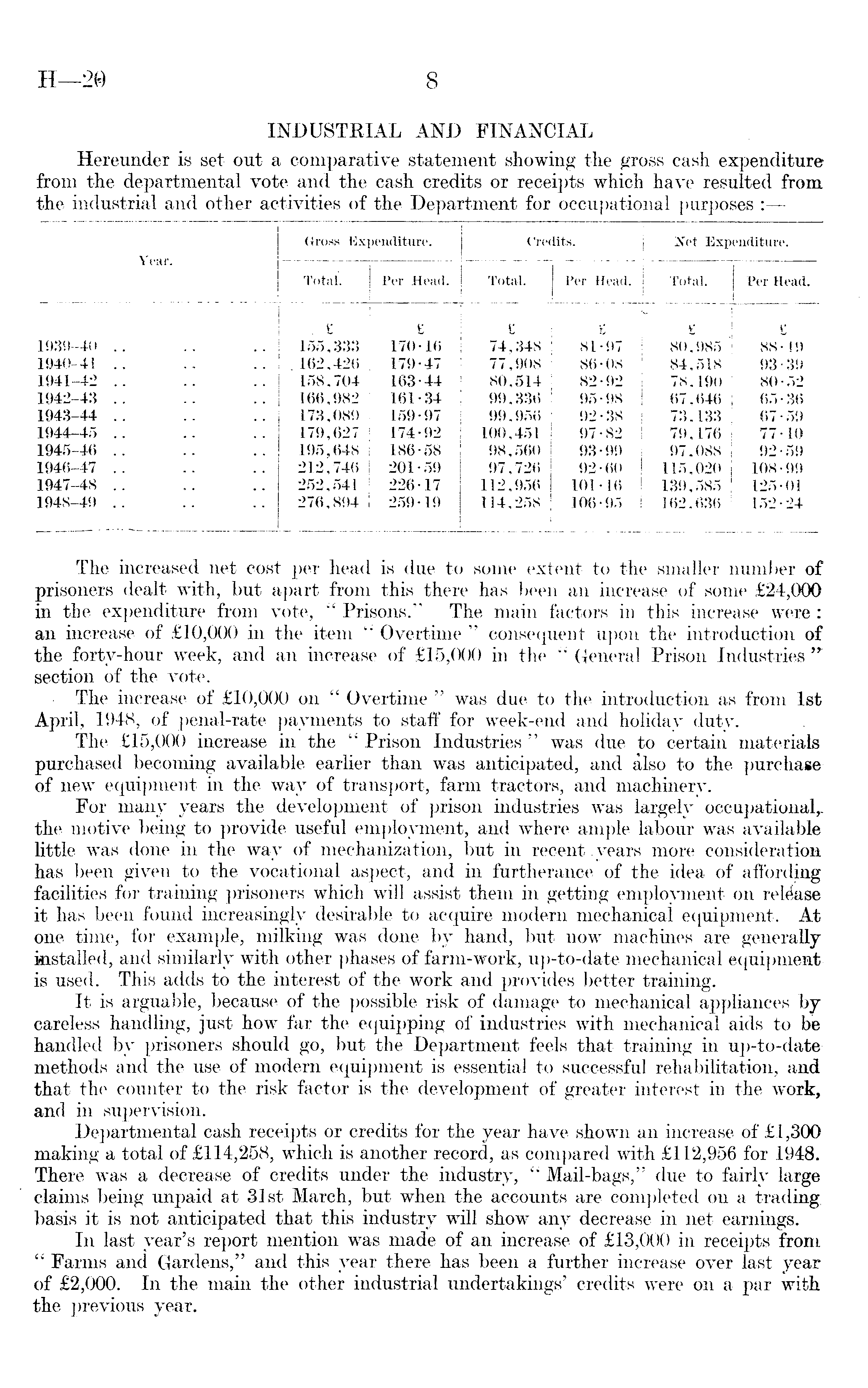 The increased net cost per head is due to some extent to the smaller number of prisoners dealt with, but apart from this there has been an increase of some £24,000 in the expenditure from vote, " Prisons." The main factors in this increase were : an increase of £lO,OOO in the item " Overtime " consequent upon the introduction of the forty-hour week, and an increase of £15,000 in the " General Prison Industries "" section of the vote. The increase of £lO,OOO on " Overtime " was due to the introduction as from Ist April, 1948, of penal-rate payments to staff for week-end and holiday duty. The £15,000 increase in the " Prison Industries " was due to certain materials purchased becoming available earlier than was anticipated, and also to the purchase of new equipment in the way of transport, farm tractors, and machinery. For many years the development of prison industries was largely the motive being to provide useful employment, and where ample labour was available little was done in the way of mechanization, but in recent .years more consideration has been given to the vocational aspect, and in furtherance of the idea of affording facilities for training prisoners which will assist them in getting employment on release it has been found increasingly desirable to acquire modern mechanical equipment. At one time, for example, milking was done by hand, but now machines are generally installed, and similarly with other phases of farm-work, up-to-date mechanical equipment is used. This adds to the interest of the work and provides better training. It is arguable, because of the possible risk of damage to mechanical appliances by careless handling, just how far the equipping of industries with mechanical aids to be handled by prisoners should go, but the Department feels that training in up-to-date methods and the use of modern equipment is essential to successful*rehabilitation, and that the counter to the risk factor is the development of greater interest in the work, and in supervision. Departmental cash receipts or credits for the year have shown an increase of £1,300 making a total of £114,258, which is another record, as compared with £112,956 for 1948. There was a decrease of credits under the industry, " Mail-bags'," due to fairly large claims being unpaid at 31st March, but when the accounts are completed on a trading, basis it is not anticipated that this industry will show any decrease in net earnings. In last year's report mention was made of an increase of £13,000 in receipts from " Farms and Gardens," and this year there has been a further increase over last year of £2,000. In the main the other industrial undertakings' credits were on a par with the previous year.