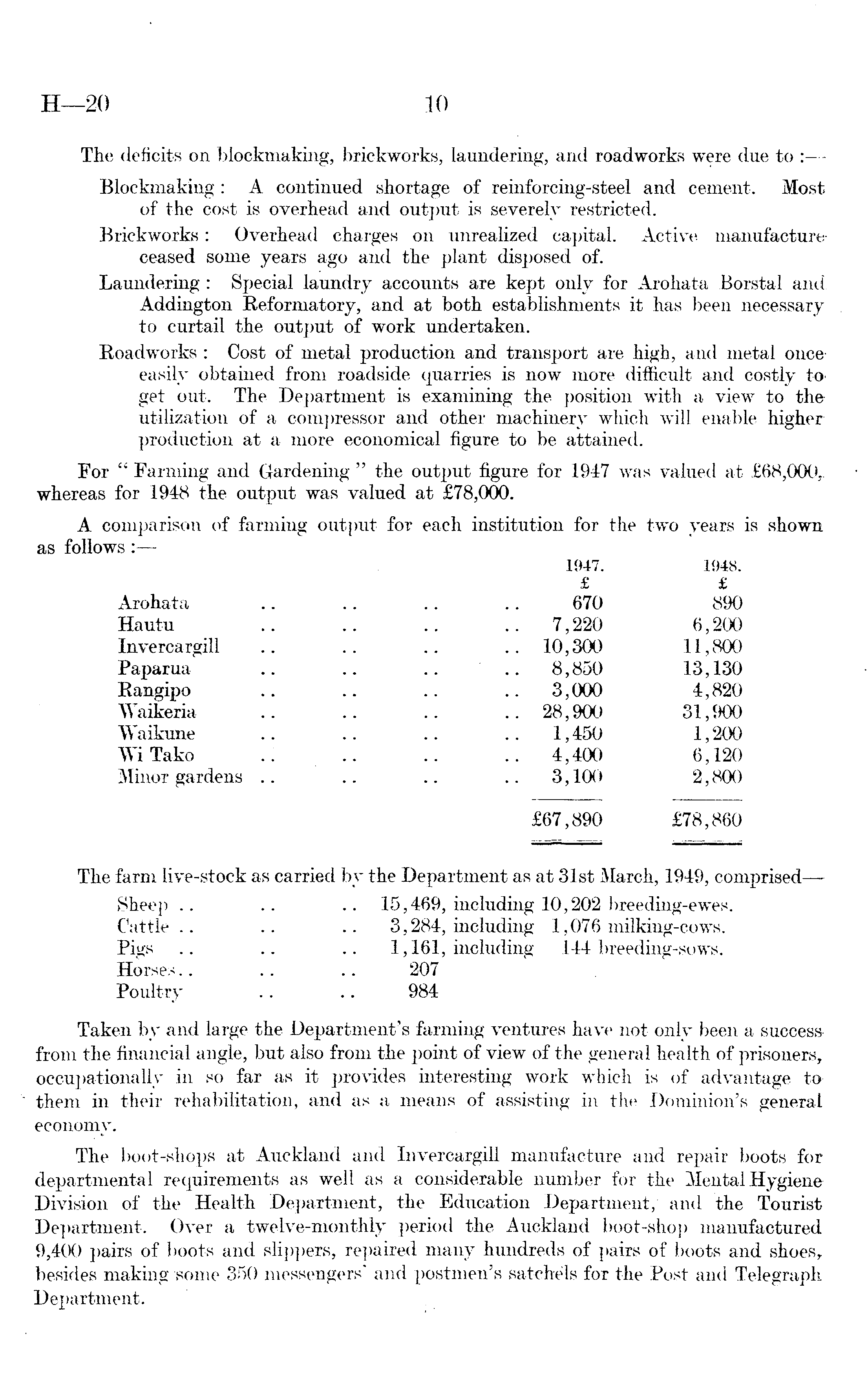 The deficits on blockmaking, brickworks, laundering, and roadworks were due to : Blockmaking : A continued shortage of reinforcing-steel and cement. Most of the cost is overhead and output is severely restricted. Brickworks: Overhead charges on unrealized capital. Active manufactureceased some years ago and the plant disposed of. Laundering : Special laundry accounts are kept only for Arohata Borstal and Addington Reformatory, and at both establishments it has been necessary to curtail the output of work undertaken. Roadworks : Cost of metal production and transport are high, and metal once easily obtained from roadside quarries is now more difficult and costly to> get out. The Department is examining the position with a view to the utilization of a compressor and other machinery which will enable higher production at a more economical figure to be attained. For " Farming and Gardening " the output figure for 1947 was valued at £68,000,. whereas for 1948 the output was valued at £78,000. A comparison of farming output for each institution for the two years is shown as follows : 1947. 1948. £ £ Arohata .. .. .. .. 670 890 Hautu .. .. .. .. 7,220 6,200 Invercargill .. .. .. ..10,300 11,800 Paparua .. .. .. .. 8,850 13,130 Rangipo .. .. .. .. 3,000 4,820 Waikeria .. .. .. .. 28,900 31,900 Waikune .. .. .. .. 1,450 1,200 WiTako .. .. .. .. 4,400 6,120 Minor gardens .. .. .. .. 3,100 2,800 £67,890 £78,860 The farm live-stock as carried by the Department as at 31st March, 1949, comprised— Sheep .. .. .. 15,469, including 10,202 breeding-ewes. Cattle.. .. .. 3,284, including 1,076 milking-cows. Pigs .. .. .. 1,161, including 144 breeding-sows. Horses.. .. .. 207 Poultry .. .. 984 Taken by and large the Department's farming ventures have not only been a successfrom the financial angle, but also from the point of view of the general health of prisoners, occupationally in so far as it provides interesting work which is of advantage to> them in their rehabilitation, and as a means of assisting in the Dominion's general economy. The boot-shops at Auckland and Invercargill manufacture and repair boots for departmental requirements as well as a considerable number for the Mental Hygiene Division of the Health Department, the Education Department, and the Tourist Department. Over a twelve-monthly period the Auckland boot-shop manufactured 9,400 pairs of boots and slippers, repaired many hundreds of pairs of boots and shoes, besides making some 350 messengers' and postmen's satchels for the Post and Telegraph Department.
