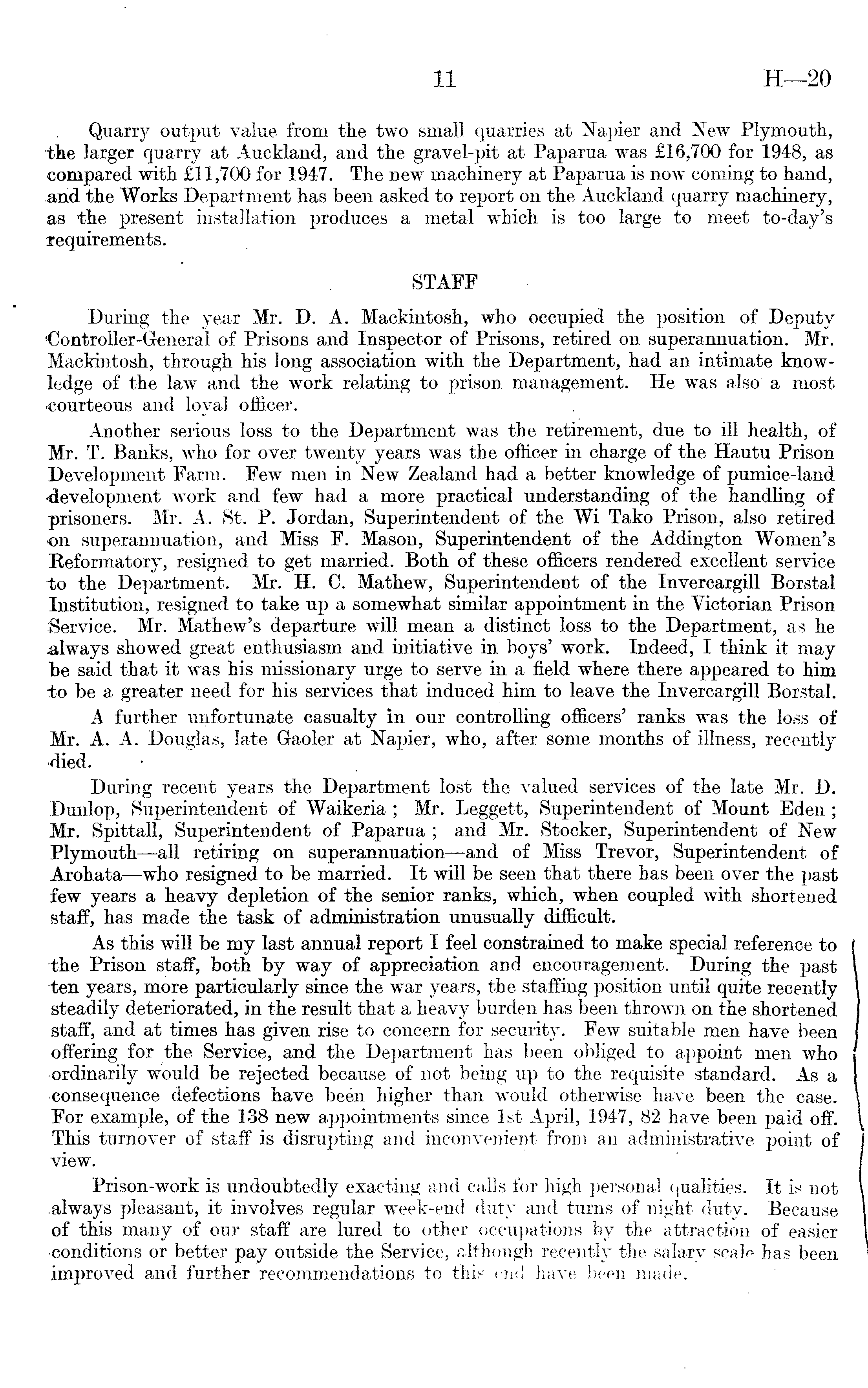 Quarry output value from the two small quarries at Napier and New Plymouth, ■the larger quarry at Auckland, and the gravel-pit at Paparua was £16,700 for 1948, as compared with £11,700 for 1947. The new machinery at Paparua is now coming to hand, and the Works Department has been asked to report on the Auckland quarry machinery, .as the present installation produces a metal which is too large to meet to-day's requirements. STAFF During the year Mr. D. A. Mackintosh, who occupied the position of Deputy 'Controller-General of Prisons and Inspector of Prisons, retired on superannuation. Mr. Mackintosh, through his long association with the Department, had an intimate knowledge of the law and the work relating to prison management. He was also a most •courteous and loyal' officer. Another serious loss to the Department was the retirement, due to ill health, of Mr. T. Banks, who for over twenty years was the officer in charge of the Hautu Prison Development Farm. Few men in New Zealand had a better knowledge of pumice-land •development work and few had a more practical understanding of the handling of prisoners. Mr. A. St. P. Jordan, Superintendent of the Wi Tako Prison, also retired on superannuation, and Miss F. Mason, Superintendent of the Addington Women's Reformatory, resigned to get married. Both of these officers rendered excellent service to the Department. Mr. H. C. Mathew, Superintendent of the Invercargill Borstal Institution, resigned to take up a somewhat similar appointment in the Victorian Prison Service. Mr. Mathew's departure will mean a distinct loss to the Department, as he .always showed great enthusiasm and initiative in boys' work. Indeed, I think it may be said that it was his missionary urge to serve in a field where there appeared to him to be a greater need for his services that induced him to leave the Invercargill Borstal. A further unfortunate casualty in our controlling officers' ranks was the loss of Mr. A. A. Douglas, late Gaoler at Napier, who, after some months of illness, recently died. During recent years the Department lost the valued services of the late Mr. D. Dunlop, Superintendent of Waikeria ; Mr. Leggett, Superintendent of Mount Eden ; Mr. Spittall, Superintendent of Paparua ; and Mr. Stocker, Superintendent of New Plymouth —all retiring on superannuation—and of Miss Trevor, Superintendent of Arohata —who resigned to be married. It will be seen that there has been over the past few years a heavy depletion of the senior ranks, which, when coupled with shortened staff, has made the task of administration unusually difficult. As this will be my last annual report I feel constrained to make special reference to the Prison staff, both by way of appreciation and encouragement. During the past ten years, more particularly since the war years, the staffing position until quite recently steadily deteriorated, in the result that a heavy burden has been thrown on the shortened staff, and at times has given rise to concern for security. Few suitable men have been offering for the Service, and the Department has been obliged to appoint men who •ordinarily would be rejected because of not being up to the requisite standard. As a •consequence defections have been higher than would otherwise have been the case. For example, of the 138 new appointments since Ist April, 1947, 82 have been paid off. This turnover of staff is disrupting and inconvenient from an administrative point of view. Prison-work is undoubtedly exacting and calls for high personal qualities. It is not .always pleasant, it involves regular week-end duty and turns of night duty. Because of this many of our staff are lured to other occupations by the attraction of easier •conditions or better pay outside the Service, although recently the salary scale has been improved and further recommendations to this end have been made.