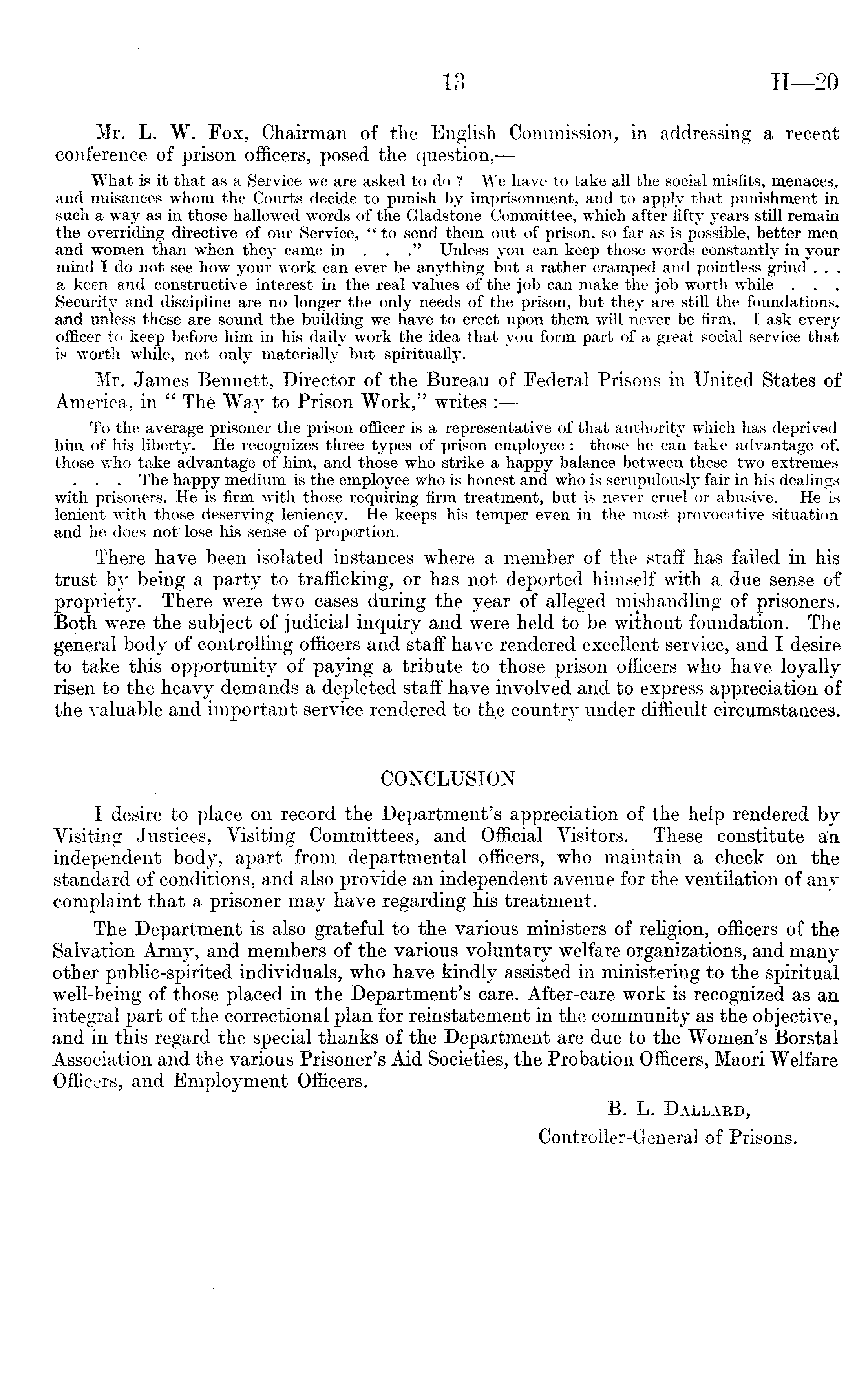 Mr. L. W. Fox, Chairman of the English Commission, in addressing a recent conference of prison officers, posed the question, — What is it that as a Service we are asked to do ? We have to take all the social misfits, menaces, and nuisances whom the Courts decide to punish by imprisonment, and to apply that punishment in such a way as in those hallowed words of the Gladstone Committee, which after fifty years still remain the overriding directive of our Service, " to send them out of prison, so far as is possible, better men and women than when they came in . . Unless you can keep those words constantly in your mind I do not see how your work can ever be anything but a rather cramped and pointless grind . . . a keen and constructive interest in the real values of the job can make the job worth while . . . Security and discipline are no longer the only needs of the prison, but they are still the foundations, and unless these are sound the building we have to erect upon them will never be firm. I ask every officer to keep before him in his daily work the idea that you form part of a great social service that is worth while, not only materially but spiritually. Mr. James Bennett, Director of the Bureau of Federal Prisons in United States of America, in " The Way to Prison Work," writes : To the average prisoner the prison officer is a representative of that authority which has deprived him of his liberty. He recognizes three types of prison employee : those he can take advantage of, those who take advantage of him, and those who strike a happy balance between these two extremes . . . The happy medium is the employee who is honest and who is scrupulously fair in his dealings with prisoners. He is firm with those requiring firm treatment, but is never cruel or abusive. He is lenient with those deserving leniency. He keeps his temper even in the most provocative situation and he does not lose his sense of proportion. There have been isolated instances where a member of the staff has failed in his trust by being a party to trafficking, or has not deported himself with a due sense of propriety. There were two cases during the year of alleged mishandling of prisoners. Both were the subject of judicial inquiry and were held to be without foundation. The general body of controlling officers and staff have rendered excellent service, and I desire to take this opportunity of paying a tribute to those prison officers who have loyally risen to the heavy demands a depleted staff have involved and to express appreciation of the valuable and important service rendered to the country under difficult circumstances. CONCLUSION I desire to place on record the Department's appreciation of the help rendered by Visiting Justices, Visiting Committees, and Official Visitors. These constitute an independent body, apart from departmental officers, who maintain a check on the standard of conditions, and also provide an independent avenue for the ventilation of any complaint that a prisoner may have regarding his treatment. The Department is also grateful to the various ministers of religion, officers of the Salvation Army, and members of the various voluntary welfare organizations, and many other public-spirited individuals, who have kindly assisted in ministering to the spiritual well-being of those placed in the Department's care. After-care work is recognized as an integral part of the correctional plan for reinstatement in the community as the objective, and in this regard the special thanks of the Department are due to the Women's Borstal Association and the various Prisoner's Aid Societies, the Probation Officers, Maori Welfare Officers, and Employment Officers. B. L. Ballard, Controller-General of Prisons.