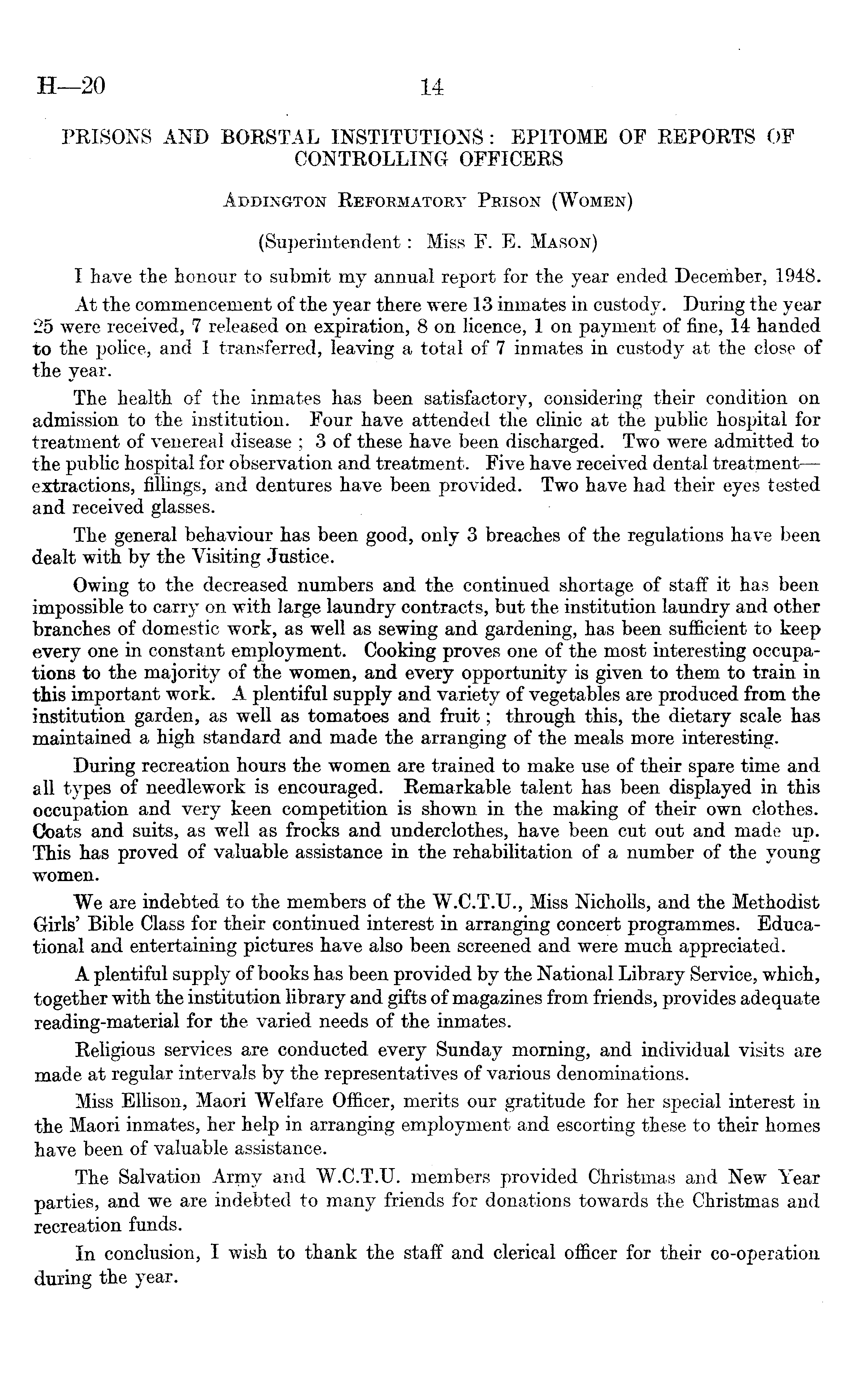 PRISONS AND BORSTAL INSTITUTIONS : EPITOME OF REPORTS OF CONTROLLING OFFICERS Addington Reformatory Prison (Women) (Superintendent: Miss F. E. Mason) I have the honour to submit my annual report for the year ended December, 1948. At the commencement of the year there were 13 inmates in custody. During the year 25 were received, 7 released on expiration, 8 on licence, 1 on payment of fine, 14 handed to the police, and 1 transferred, leaving a total of 7 inmates in custody at the close of the year. The health of the inmates has been satisfactory, considering their condition on admission to the institution. Four have attended the clinic at the public hospital for treatment of venereal disease ; 3of these have been discharged. Two were admitted to the public hospital for observation and treatment. Five have received dental treatment — extractions, fillings, and dentures have been provided. Two have had their eyes tested and received glasses. The general behaviour has been good, only 3 breaches of the regulations have been dealt with by the Visiting Justice. Owing to the decreased numbers and the continued shortage of staff it has been impossible to carry on with large laundry contracts, but the institution laundry and other branches of domestic work, as well as sewing and gardening, has been sufficient to keep every one in constant employment. Cooking proves one of the most interesting occupations to the majority of the women, and every opportunity is given to them to train in this important work. A plentiful supply and variety of vegetables are produced from the institution garden, as well as tomatoes and fruit; through this, the dietary scale has maintained a high standard and made the arranging of the meals more interesting. During recreation hours the women are trained to make use of their spare time and all types of needlework is encouraged. Remarkable talent has been displayed in this occupation and very keen competition is shown in the making of their own clothes. Coats and suits, as well as frocks and underclothes, have been cut out and made up. This has proved of valuable assistance in the rehabilitation of a number of the young women. We are indebted to the members of the W.C.T.U., Miss Nicholls, and the Methodist Girls' Bible Class for their continued interest in arranging concert programmes. Educational and entertaining pictures have also been screened and were much appreciated. A plentiful supply of books has been provided by the National Library Service, which, together with the institution library and gifts of magazines from friends, provides adequate reading-material for the varied needs of the inmates. Religious services are conducted every Sunday morning, and individual visits are made at regular intervals by the representatives of various denominations. Miss Ellison, Maori Welfare Officer, merits our gratitude for her special interest in the Maori inmates, her help in arranging employment and escorting these to their homes have been of valuable assistance. The Salvation Army and W.C.T.U. members provided Christmas and New Year parties, and we are indebted to many friends for donations towards the Christmas and recreation funds. In conclusion, I wish to thank the staff and clerical officer for their co-operation during the year.
