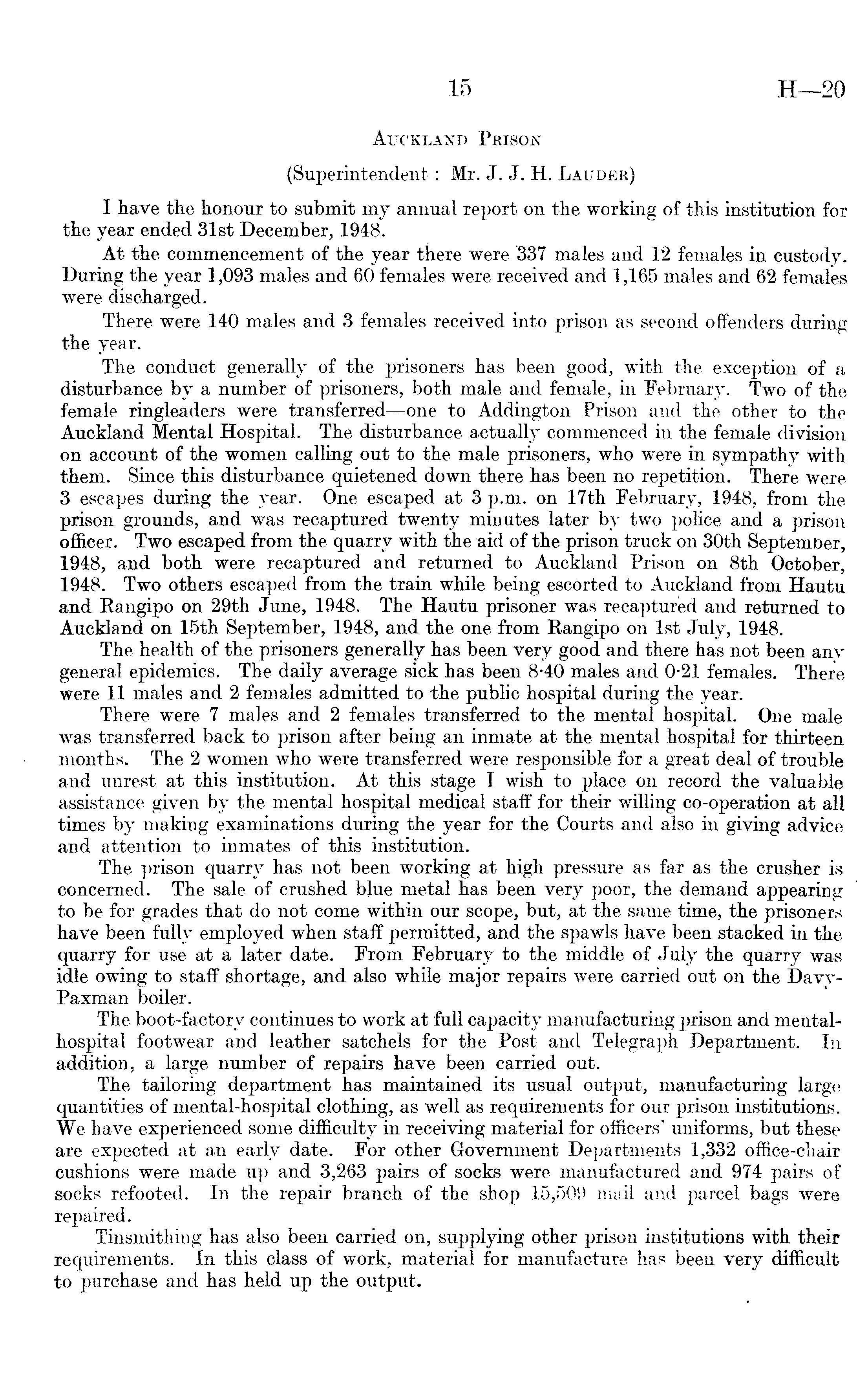 Auckland Prison (Superintendent: Mr. J. J. H. Lauder) I have the honour to submit my annual report on the working of this institution for the year ended 31st December, 1948. At the commencement of the year there were '337 males and 12 females in custody. During the year 1,093 males and 60 females were received and 1,165 males and 62 females were discharged. There were 140 males and 3 females received into prison as second offenders during the year. The conduct generally of the prisoners has' been good, with the exception of a disturbance by a number of prisoners, both male and female, in February. Two of the female ringleaders were transferred —one to Addington Prison and the other to the Auckland Mental Hospital. The disturbance actually commenced in the female division on account of the women calling out to the male prisoners, who were in sympathy with them. Since this disturbance quietened down there has been no repetition. There were 3 escapes during the year. One escaped at 3 p.m. on 17th February, 1948, from the prison grounds, and was recaptured twenty minutes later by two police and a prison officer. Two escaped from the quarry with the aid of the prison truck on 30th September, 1948, and both were recaptured and returned to Auckland Prison on Bth October, 1948. Two others escaped from the train while being escorted to Auckland from Hautu and Rangipo on 29th June, 1948. The Hautu prisoner was recaptured and returned to Auckland on 15th September, 1948, and the one from Rangipo on Ist July, 1948. The health of the prisoners generally has been very good and there has not been any general epidemics. The daily average sick has been 8-40 males and 0-21 females. There were 11 males and 2 females admitted to -the public hospital during the year. There were 7 males and 2 females transferred to the mental hospital. One male was transferred back to prison after being an inmate at the mental hospital for thirteen months. The 2 women who were transferred were responsible for a great deal of trouble and unrest at this institution. At this stage I wish to place on record the valuable assistance given by the mental hospital medical staff for their willing co-operation at all times by making examinations during the year for the Courts and also in giving advice and attention to inmates of this institution. The prison quarry has not been working at high pressure as far as the crusher is concerned. The sale of crushed blue metal has been very poor, the demand appearing to be for grades that do not come within our scope, but, at the same time, the prisoners have been fully employed when staff permitted, and the spa wis have been stacked in the quarry for use at a later date. From February to the middle of July the quarry was idle owing to staff shortage, and also while major repairs were carried out on the DavyPaxman boiler. The boot-factory continues to work at full capacity manufacturing prison and mentalhospital footwear and leather satchels for the Post and Telegraph Department. In addition, a large number of repairs have been carried out. The tailoring department has maintained its usual output, manufacturing large quantities of mental-hospital clothing, as well as requirements for our prison institutions. We have experienced some difficulty in receiving material for officers' uniforms, but these are expected at an early date. For other Government Departments 1,332 office-chair cushions were made up and 3,263 pairs of socks were manufactured and 974 pairs of socks refooted. In the repair branch of the shop 15,509 mail and parcel bags were repaired. Tinsmithing has also been carried on, supplying other prison institutions with their requirements. In this class of work, material for manufacture has been very difficult to purchase and has held up the output.