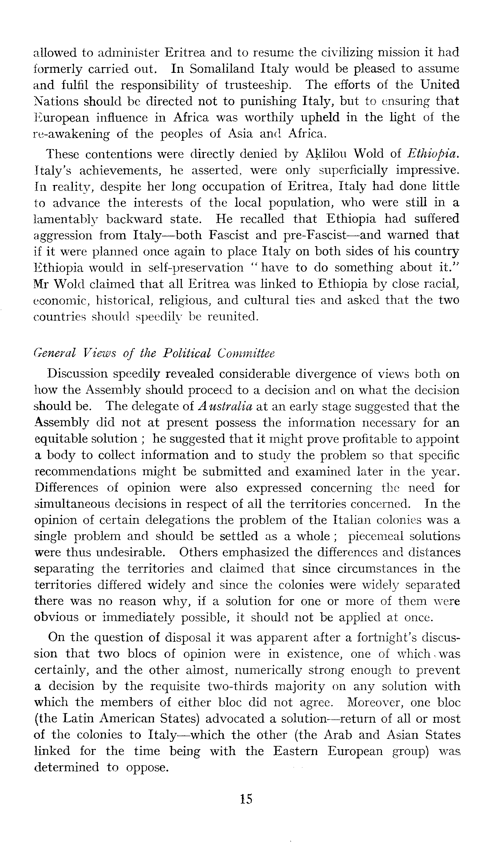 allowed to administer Eritrea and to resume the civilizing mission it had formerly carried out. In Somaliland Italy would be pleased to assume and fulfil the responsibility of trusteeship. The efforts of the United Nations should be directed not to punishing Italy, but to ensuring that European influence in Africa was worthily upheld in the light of the re-awakening of the peoples of Asia and Africa. These contentions were directly denied by Aklilou Wold of Ethiopia. Italy's achievements, he asserted, were only superficially impressive. In reality, despite her long occupation of Eritrea, Italy had done little to advance the interests of the local population, who were still in a lamentably backward state. He recalled that Ethiopia had suffered aggression from Italy—both Fascist and pre-Fascist—and warned that if it were planned once again to place Italy on both sides of his country Ethiopia would in self-preservation " have to do something about it." Mr Wold claimed that all Eritrea was linked to Ethiopia by close racial, economic, historical, religious, and cultural ties and asked that the two countries should speedily be reunited. General Views of the Political Committee Discussion speedily revealed considerable divergence of views both on how the Assembly should proceed to a decision and on what the decision should be. The delegate of A ustralia at an early stage suggested that the Assembly did not at present possess the information necessary for an equitable solution ; he suggested that it might prove profitable to appoint a body to collect information and to study the problem so that specific recommendations might be submitted and examined later in the year. Differences of opinion were also expressed concerning the need for simultaneous decisions in respect of all the territories concerned. In the opinion of certain delegations the problem of the Italian colonies was a single problem and should be settled as a whole; piecemeal solutions were thus undesirable. Others emphasized the differences and distances separating the territories and claimed that since circumstances in the territories differed widely and since the colonies were widely separated there was no reason why, if a solution for one or more of them were obvious or immediately possible, it should not be applied at once. On the question of disposal it was apparent after a fortnight's discussion that two blocs of opinion were in existence, one of which .was certainly, and the other almost, numerically strong enough to prevent a decision by the requisite two-thirds majority on any solution with which the members of either bloc did not agree. Moreover, one bloc (the Latin American States) advocated a solution —return of all or most of the colonies to Italy—which the other (the Arab and Asian States linked for the time being with the Eastern European group) was determined to oppose.
