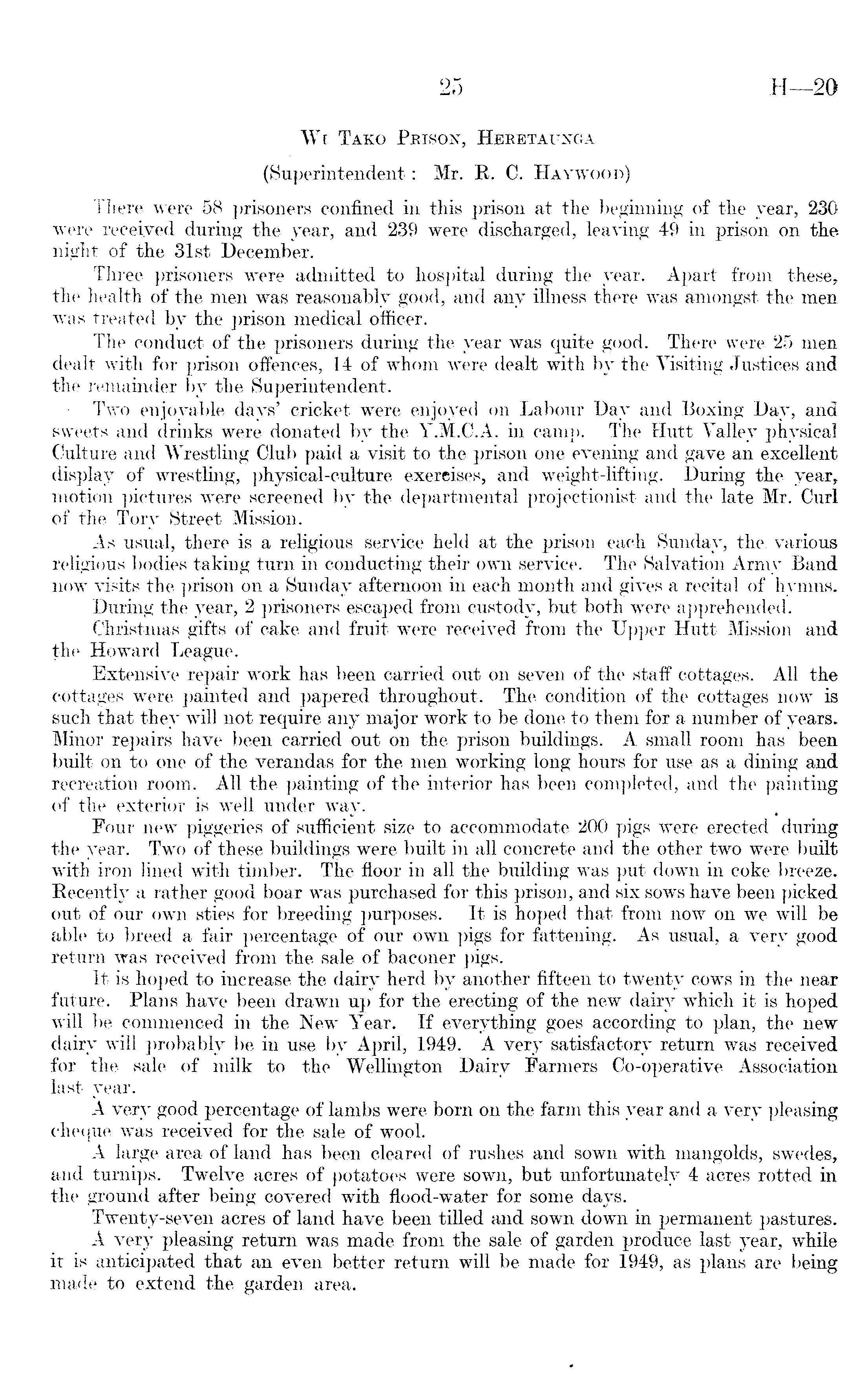 Wi Tako Prison, Heretaunga (Superintendent: Mr. K. C. Haywood) There were 58 prisoners confined in this prison at the beginning of the year, 230 were received during the year, and 239 were discharged, leaving 49 in prison on the night of the 31st December. Three prisoners were admitted to hospital during the year. Apart from these, the health of the men was reasonably good, and any illness there was amongst the men was treated by the prison medical officer. The conduct of the prisoners during the year was quite good. There were 25 men dealt with for prison offences, 14 of whom were dealt with by the Visiting Justices and the remainder by the Superintendent. Two enjoyable days' cricket were enjoyed on Labour Day and Boxing Day, and sweets and drinks were donated by the Y.M.C.A. in camp. The Hutt Valley physical Culture and Wrestling Club paid a visit to the prison one evening and gave an excellent display of wrestling, physical-culture exercises, and weight-lifting. During the year, motion pictures were screened by the departmental projectionist and the late Mr. Curl of the Tory Street Mission. As usual, there is a religious service held at the prison each Sunday, the. various religious bodies taking turn in conducting their own service. The Salvation Army Band now visits the prison on a Sunday afternoon in each month and gives a recital of hymns. During the year, 2 prisoners escaped from custody, but both were apprehended. Christmas gifts of cake and fruit were received from the Upper Hutt Mission and the Howard LeagueExtensive repair work has been carried out on seven of the staff cottages. All the cottages were painted and papered throughout. The condition of the cottages now is such that they will not require any major work to be done to them for a number of years. Minor repairs have been carried out on the prison buildings. A small room has been built on to one of the verandas for the men working long hours for use as a dining and recreation room. All the painting of the interior has been completed, and the painting of the exterior is well under way. Four new piggeries of sufficient size to accommodate 200 pigs were erected during the year. Two of these buildings were built in all concrete and the other two were built with iron lined with timber. The floor in all the building was put down in coke breeze. Recently a rather good boar was purchased for this prison, and six sows have been picked out of our own sties for breeding purposes. It is hoped that from now on we will be able to breed a fair percentage of our own pigs for fattening. As usual, a very good return was received from the sale of baconer pigs. It is hoped to increase the dairy herd by another fifteen to twenty cows in the near future. Plans have been drawn up for the erecting of the new dairy which it is hoped will be commenced in the New Year. If everything goes according to plan, the new dairy will probably be in use by April, 1949. A very satisfactory return was received for the sale of milk to the Wellington Dairy Farmers Co-operative Association last year. A very good percentage of lambs were born on the farm this year and a very pleasing cheque was received for the sale of wool. A large area of land has been cleared of rushes and sown with mangolds, swedes, and turnips. Twelve acres of potatoes were sown, but unfortunately 4 acres rotted in the ground after being covered with flood-water for some days. Twenty-seven acres of land have been tilled and sown down in permanent pastures. A very pleasing return was made from the sale of garden produce last year, while it is anticipated that an even better return will be made for 1949, as plans are being made to extend the garden area.