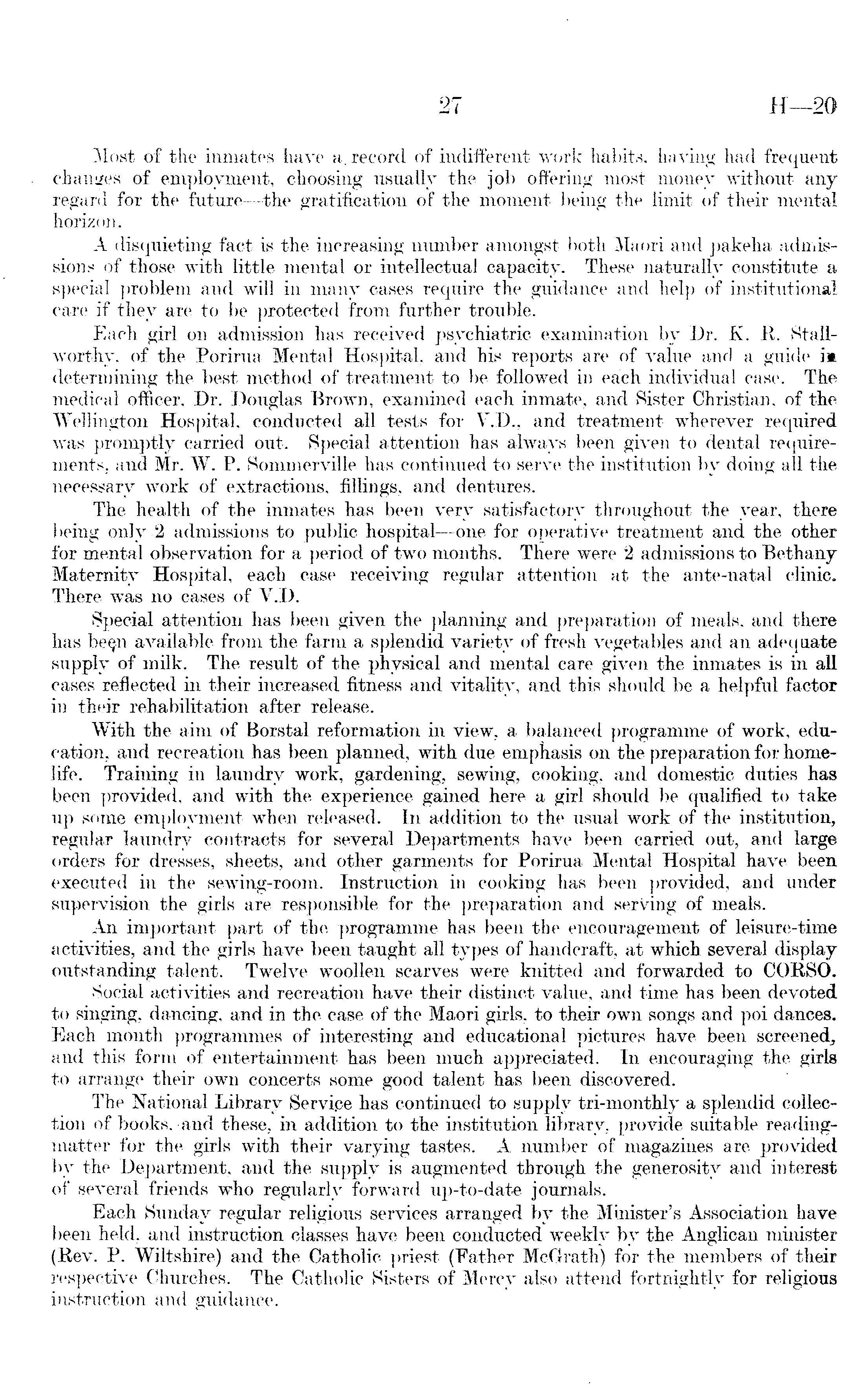 Most of the inmates have a. record of indifferent work habits, having had frequent changes of employment, choosing usually the job offering most money without any regard for the future—the gratification of the moment being the limit of their mental horizon. A disquieting fact is the increasing number amongst both Maori and pakeha admissions of those with little mental or intellectual capacity. These naturally constitute a special problen) and will in many cases require the guidance and help of institutional care if they are to be protected from further trouble. Each girl on admission has received psychiatric examination by Dr. K. R. Stallworthy, of the Porirua Mental Hospital, and his reports are of value and a guide i* determining the best method of treatment to be followed in each individual case. The medical officer, Dr. Douglas Brown, examined each inmate, and Sister Christian, of the Wellington Hospital, conducted all tests for V.D., and treatment wherever required was promptly carried out. Special attention has always been given to dental requirements, and Mr. W. P. Sommerville has continued to serve the institution by doing all the necessary work of extractions, fillings, and dentures. The health of the inmates has been very satisfactory throughout the year, there being only 2 admissions to public hospital—one for operative treatment and the other for mental observation for a period of two months. There were 2 admissions to Bethany Maternity Hospital, each case receiving regular attention at the ante-natal clinic. There was no cases of Y.D. Special attention has been given the planning and preparation of meals, and there has besn available from the farm a splendid variety of . fresh vegetables and an adequate supply of milk. The result of the physical and mental care given the inmates is in all cases reflected in their increased fitness and vitality, and this should be a helpful factor in their rehabilitation after release. With the aim of Borstal reformation in view, a balanced programme of work, education, and recreation has been planned, with due emphasis on the preparation for homelife. Training in laundry work, gardening, sewing, cooking, and domestic duties has been provided, and with the experience gained here a girl should be qualified to take up some employment when released. In addition to the usual work of the institution, regular laundry contracts for several Departments have been carried out, and large orders for dresses, sheets, and other garments for Porirua Mental Hospital have been executed in the sewing-room. Instruction in cooking has been provided, and under supervision the •girls are responsible for the preparation and serving of meals. An important part of the programme has been the encouragement of leisure-time activities, and the girls have been taught all types of handcraft, at which several display outstanding talent. Twelve woollen scarves were knitted and forwarded to CORSO. Social activities and recreation have their distinct value, and time has been devoted to singing, dancing, and in the case of the Maori girls, to their own songs and poi dances. Each month programmes of interesting and educational pictures have been and this form of entertainment has been much appreciated. In encouraging the girls to arrange their own concerts some good talent has been discovered. The National Library Service has continued to supply tri-monthly a splendid collection of books, and these, in addition to the institution library, provide suitable readingmatter for the girls with their varying tastes. A number of magazines are provided by the Department, and the supply is augmented through the generosity and interest of several friends who regularly forward up-to-date journals. Each Sunday regular religious services arranged by the Minister's Association have been held, and instruction classes have been conducted weekly by the Anglican minister (Rev. P. Wiltshire) and the Catholic priest (Father McGrrath) for the members of their respective Churches. The Catholic Sisters of Mercy also attend fortnightly for religious instruction and guidance.