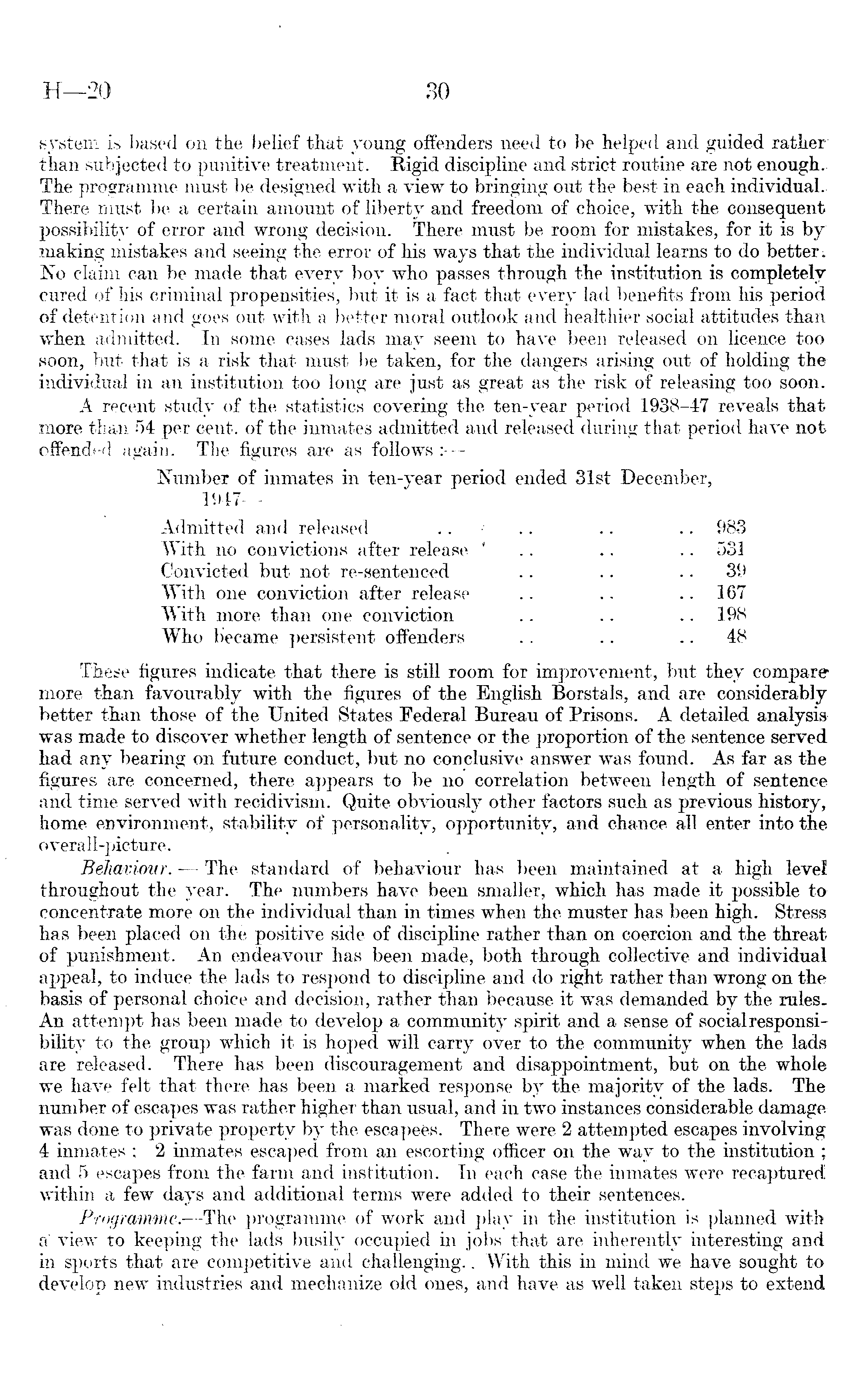 system is based on the belief that young offenders need to be helped and guided rather than subjected to punitive treatment. Rigid discipline and strict routine are not enough. The programme must be designed with a view to bringing out the best in each individual. There must be a certain amount of liberty and freedom of choice, with the consequent possibility of error and wrong decision. There must be room for mistakes, for it is by making mistakes and seeing the error of his ways that the individual learns to do better. No claim can be made that every boy who passes through the institution is completely cured of his criminal propensities, but it is a fact that every lad benefits from his period of detention and goes out with a better moral outlook and healthier social attitudes than when admitted. In some cases lads may seem to have been released on licence too soon, but that is a risk that must be taken, for the dangers arising out of holding the individual in an institution too long are just as great as the risk of releasing too soon. A recent study of the statistics covering the ten-year period 1938-47 reveals that more than 54 per cent, of the inmates admitted and released during that period have not offended again. The figures are as follows : Number of inmates in ten-year period ended 31st December, 1947 Admitted and released .. • .. .. .. 983 With no convictions after release ' .. .. .. 533 Convicted but not re-sentenced .. .. 39 With one conviction after release .. .. .. 167 With more than one conviction .. .. .. 198 Who became persistent offenders .. .. 48 These figures indicate that there is still room for improvement, but they compare more than favourably with the figures of the English Borstals, and are considerably better than those of the United States Federal Bureau of Prisons. A detailed analysis was made to discover whether length of sentence or the proportion of the sentence served had any bearing on future conduct, but no conclusive answer was found. As far as the figures are concerned, there appears to be no correlation between length of sentence and time served with recidivism. Quite obviously other factors such as previous history, home environment, stability of personality, opportunity, and chance all enter into the overall-picture. Behaviour. The. standard of behaviour has been maintained at a high level throughout the year. The numbers have been smaller, which has made it possible to concentrate more on the individual than in times when the muster has been high. Stress has been placed on the positive side of discipline rather than on coercion and the threat of punishment. An endeavour has been made, both through collective and individual appeal, to induce the lads to respond to discipline and do right rather than wrong on the basis of personal choice and decision, rather than because it was demanded by the rules. An attempt has been made to develop a community spirit and a sense of social responsibility to the group which it is hoped will carry over to the community when the lads are released. There has been discouragement and disappointment, but on the whole we have felt that there has been a marked response by the majority of the lads. The number of escapes was rather higher than usual, and in two instances considerable damage was done to private property by the escapees. There were 2 attempted escapes involving 4 inmates ; 2 inmates escaped from an escorting officer on the way to the institution ; and 5 escapes from the farm and institution. In each case the inmates were recaptured within a few days and additional terms were added to their sentences. Programme. —The programme of work and play in the institution is planned with a view to keeping the lads busily occupied in jobs that are inherently interesting and in sports that are competitive and challenging.. With this in mind we have sought to develop new industries and mechanize old ones, and have as well taken steps to extend