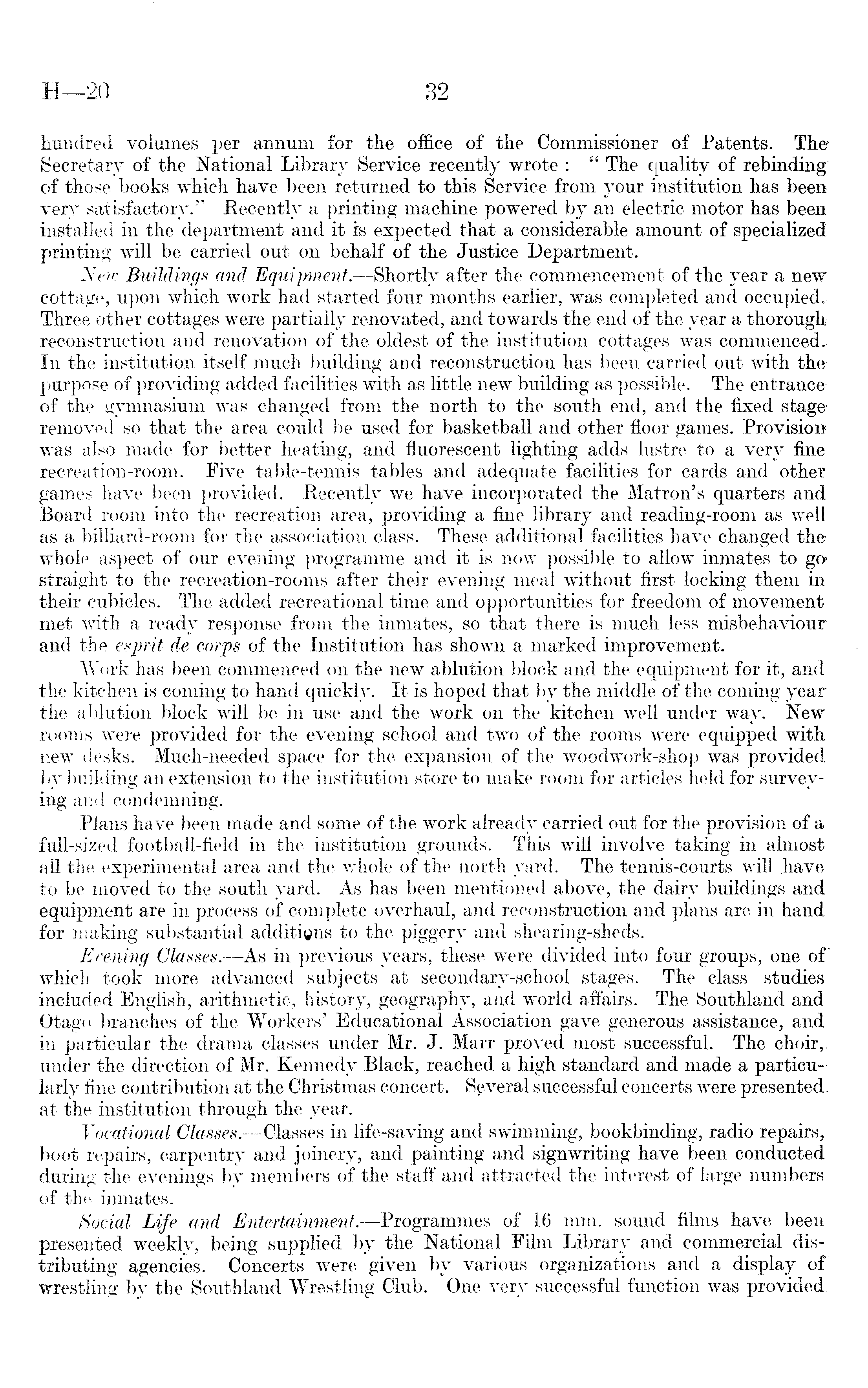 hundred volumes per annum for the office of the Commissioner of Patents. The? Secretary of the National Library Service recently wrote : " The quality of rebinding of those books which have been returned to this Service from your institution has been very satisfactory." Recently a printing machine powered by an electric motor has been installed in the department and it is expected that a considerable amount of specialized printing will be carried out on behalf of the Justice Department. New Buildings and Equipment.—Shortly after the commencement of the year a new cottage, upon which work had started four months earlier, was completed and occupied. Three other cottages were partially renovated, and towards the end of the year a thorough reconstruction and renovation of the oldest of the institution cottages was commenced. In the institution itself much building and reconstruction has been carried out with the purpose of providing added facilities with as little new building as possible. The entrance of the gymnasium was changed from the north to the south end, and the fixed stage removed so that the area could be used for basketball and other floor games. Provision was also made for better heating, and fluorescent lighting adds lustre to a very fine recreation-room. Five table-tennis tables and adequate facilities for cards and other games have been provided. Recently we have incorporated the Matron's quarters and Board room into the recreation area, providing a fine library and reading-room as well as a billiard-room for the association class. These additional facilities have changed the whole aspect of our evening programme and it is now possible to allow inmates to gostraight to the recreation-rooms after their evening meal without first locking them in their cubicles. The added recreational time and opportunities for freedom of movement met with a ready response from the inmates, so that there is much less misbehaviour and the esprit de corps of the Institution has shown a marked improvement. Work has been commenced on the new ablution block and the equipment for it, and the kitchen is coming to hand quickly. It is hoped that by the middle of the coming year the ablution block will be in use and the work on the kitchen well under way. New rooms were provided for the evening school and two of the rooms were equipped with new desks. Much-needed space for the expansion of the woodwork-shop was provided by building an extension to the institution store to make room for articles held for surveying and condemning. Plans have been made and some of the work already carried out for the provision of a-fall-sized football-field in the institution grounds. This will involve taking in almost all the experimental area and the whole of the north yard. The tennis-courts will have to be moved to the south yard. As has been mentioned above, the dairy buildings and equipment are in process of complete overhaul, and reconstruction and plans are in hand for making substantial additions to the piggery and shearing-sheds. Evening Classes. —As in previous years, these were divided into four groups, one of which took more advanced subjects at secondary-school stages. The class studiesincluded English, arithmetic, history, geography, and world affairs. The Southland and Otago branches of the Workers' Educational Association gave generous assistance, and in particular the drama classes under Mr. J. Marr proved most successful. The choir,, under the direction of Mr. Kennedy Black, reached a high standard and made a particularly fine contribution at the Christmas concert. Several successful concerts were presented, at the institution through the year. Vocational Classes. —Classes in life-saving and swimming, bookbinding, radio repairs, boot repairs, carpentry and joinery, and painting and sign writing have been conducted during the evenings by members of the staff and attracted the interest of large numbers of the inmates. Social Life and Entertainment. —Programmes of 16 mm. sound films have been presented weekly, being supplied by the National Film Library and commercial distributing agencies. Concerts were given by various organizations and a display of wrestling by the Southland Wrestling Club. One very successful function was provided.