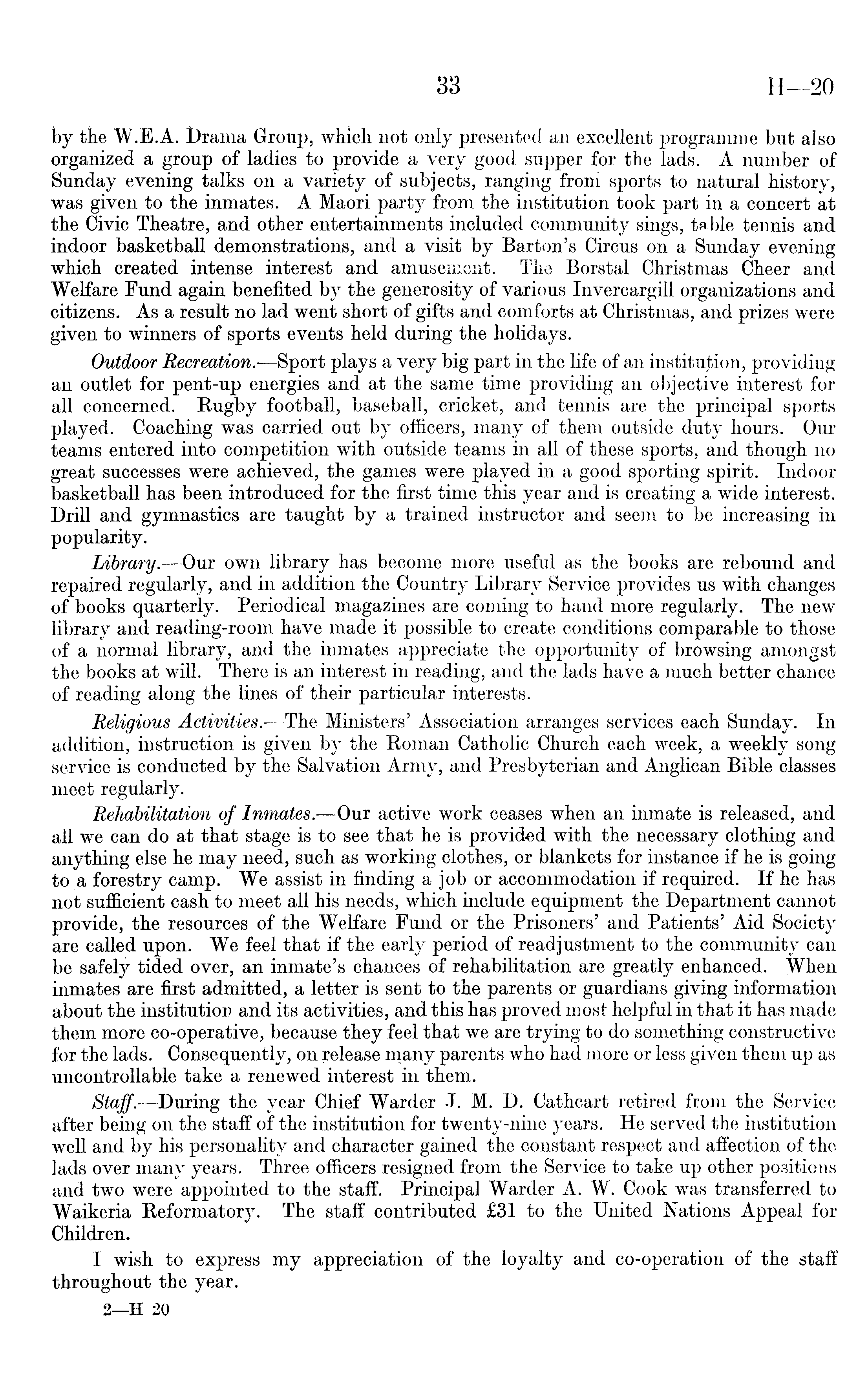 by the W.E.A. Drama Croup, which not only presented an excellent programme but also organized a group of ladies to provide a very good supper for the lads. A number of Sunday evening talks on a variety of subjects, ranging froni sports to natural history, was given to the inmates. A Maori party from the institution took part in a concert at the Civic Theatre, and other entertainments included community sings, table tennis and indoor basketball demonstrations, and a visit by Barton's Circus on a Sunday evening which created intense interest and amusement. The Borstal Christmas Cheer and Welfare Fund again benefited by the generosity of various Invercargill organizations and citizens. As a result no lad went short of gifts and comforts at Christmas, and prizes were given to winners of sports events held during the holidays. Outdoor Recreation.—Sport plays a very big part in the life of an institution, providing an outlet for pent-up energies and at the same time providing an objective interest for all concerned. Rugby football, baseball, cricket, and tennis are the principal sports played. Coaching was carried out by officers, many of them outside duty hours. Our teams entered into competition with outside teams in all of these sports, and though 110 great successes were achieved, the games were played in a good sporting spirit. Indoor basketball has been introduced for the first time this year and is creating a wide interest. Drill and gymnastics are taught by a trained instructor and seem to be increasing in popularity. Library.—Our own library has become more useful as the books are rebound and repaired regularly, and in addition the Country Library Service provides us with changes of books quarterly. Periodical magazines are coming to hand more regularly. The new library and reading-room have made it possible to create conditions comparable to those of a normal library, and the inmates appreciate the opportunity of browsing amongst the books at will. There is an interest in reading, and the lads have a much better chance of reading along the lines of their particular interests. Religious Activities.—The Ministers' Association arranges services each Sunday. In addition, instruction is given by the Roman Catholic Church each week, a weekly song service is conducted by the Salvation Army, and Presbyterian and Anglican Bible classes meet regularly. Rehabilitation of Inmates. —Our active work ceases when an inmate is released, and all we can do at that stage is to see that he is provided with the necessary clothing and anything else he may need, such as working clothes, or blankets for instance if he is going to a forestry camp. We assist in finding a job or accommodation if required. If he has not sufficient cash to meet all his needs, which include equipment the Department cannot provide, the resources of the Welfare Fund or the Prisoners' and Patients' Aid Society are called upon. We feel that if the early period of readjustment to the community can be safely tided over, an inmate's chances of rehabilitation are greatly enhanced. When inmates are first admitted, a letter is sent to the parents or guardians giving information about the institution and its activities, and this has proved most helpful in that it has made them more co-operative, because they feel that we are trying to do something constructive for the lads. Consequently, on release many parents who had more or less given them up as uncontrollable take a renewed interest in them. Staff. —During the year Chief Warder J. M. D. Cathcart retired from the Service after being 011 the staff of the institution for twenty-nine years. He served the institution well and by his personality and character gained the constant respect and affection of the lads over many years. Three officers resigned from the Service to take up other positions and two were appointed to the staff. Principal Warder A. W. Cook was transferred to Waikeria Reformatory. The staff contributed £3l to the United Nations Appeal for Children. I wish to express my appreciation of the loyalty and co-operation of the .staff throughout the year.