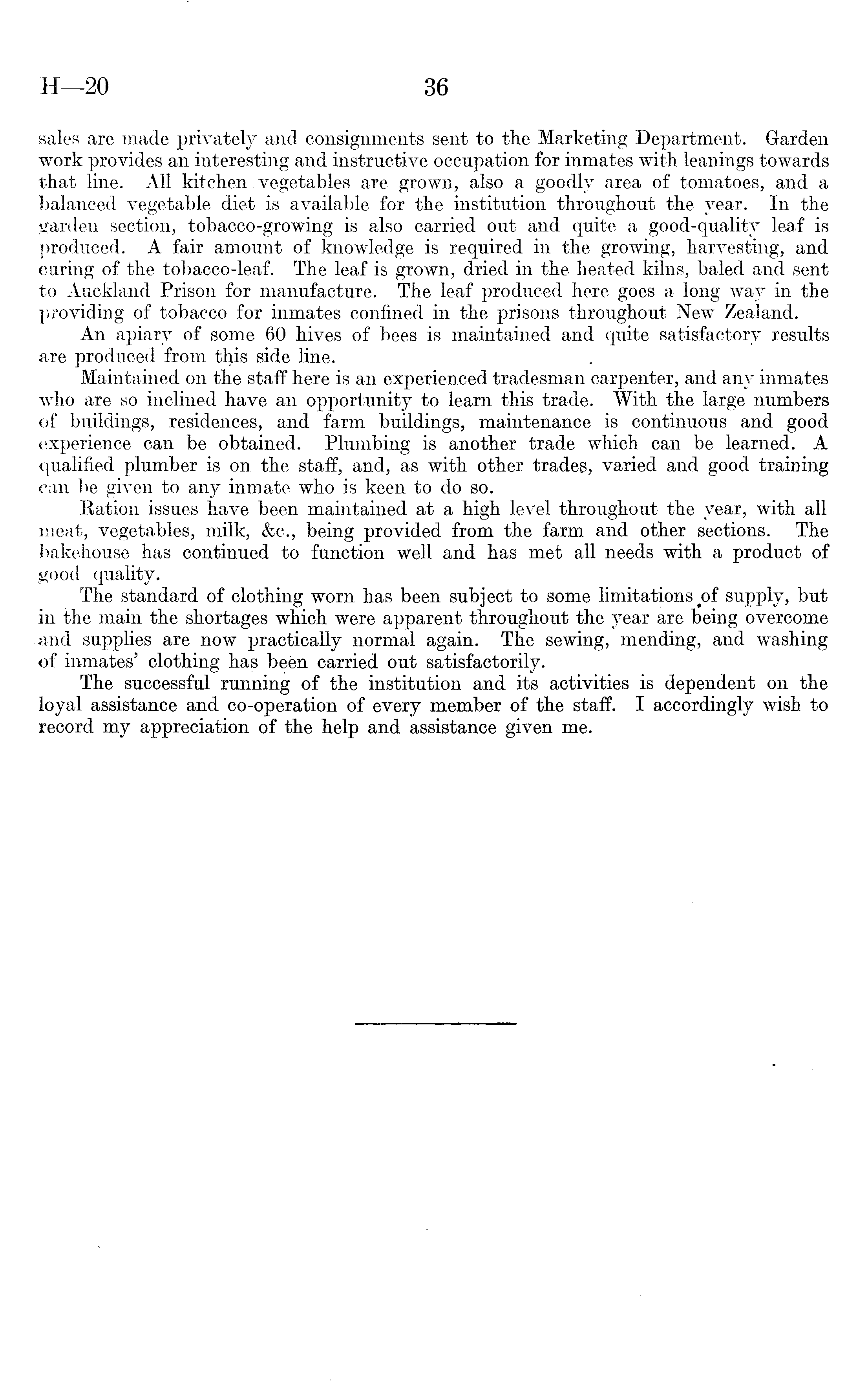 sales are made privately and consignments sent to the Marketing Department. Garden work provides an interesting and instructive occupation for inmates with leanings towards that line. All kitchen vegetables are grown, also a goodly area of tomatoes, and a balanced vegetable diet is available for the institution throughout the year. In the garden section, tobacco-growing is also carried out and quite a good-quality leaf is produced. A fair amount of knowledge is required in the growing, harvesting, and curing of the tobacco-leaf. The leaf is grown, dried in the heated kilns, baled and sent to Auckland Prison for manufacture. The leaf produced here goes a long way in the providing of tobacco for inmates confined in the prisons throughout New Zealand. An apiary of some 60 hives of bees is maintained and quite satisfactory results are produced from this side line. Maintained on the staff here is an experienced tradesman carpenter, and any inmates who are so inclined have an opportunity to learn this trade. With the large numbers of buildings, residences, and farm buildings, maintenance is continuous and good experience can be obtained. Plumbing is another trade which can be learned. A qualified plumber is on the staff, and, as with other trades, varied and good training can be given to any inmate who is keen to do so. Ration issues have been maintained at a high level throughout the year, with all meat, vegetables, milk, &c, being provided from the farm and other sections. The bakehouse has continued to function well and has met all needs with a product of good quality. The standard of clothing worn has been subject to some limitations # of supply, but in the main the shortages which were apparent throughout the year are being overcome and supplies are now practically normal again. The sewing, mending, and washing of inmates' clothing has been carried out satisfactorily. The successful running of the institution and its activities is dependent on the loyal assistance and co-operation of every member of the staff. I accordingly wish to record my appreciation of the help and assistance given me.