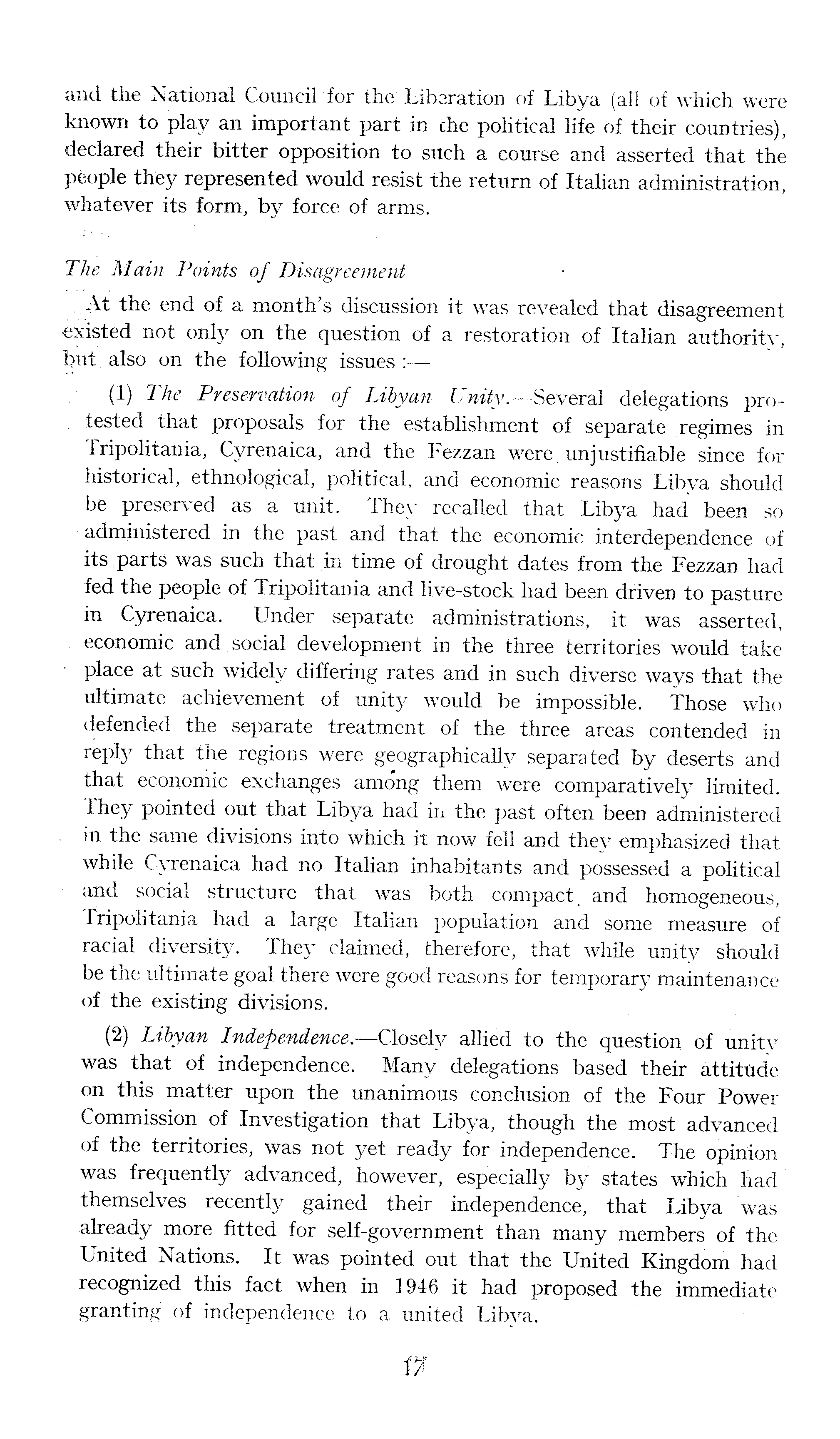 and the National Council for the Liberation of Libya (all'of which were known to play an important part in che political life of their countries), declared their bitter opposition to such a course and asserted that the people they represented would resist the return of Italian administration, whatever its form, by force of arms. The Main Points of Disagreement At the end of a month's discussion it was revealed that disagreement existed not only on the question of a restoration of Italian authority, but also on the following issues : (1) The Preservation of Libyan Unity.—Several delegations protested that proposals for the establishment of separate regimes in Tripolitania, Cyrenaica, and the Fezzan were unjustifiable since for historical, ethnological, political, and economic reasons Libya should be preserved as a unit. They recalled that Libya had been so administered in the past and that the economic interdependence of its parts was such that in time of drought dates from the Fezzan had fed the people of Tripolitania and live-stock had been driven to pasture in Cyrenaica. Under separate administrations, it was asserted, economic and social development in the three territories would take place at such widely differing rates and in such diverse ways that the ultimate achievement of unity would be impossible. Those who defended the separate treatment of the three areas contended in reply that the regions were geographically separated by deserts and that economic exchanges among them were comparatively limited. They pointed out that Libya had in'the past often been administered . in the same divisions into which it now fell and they emphasized that while Cyrenaica had no Italian inhabitants and possessed a political and social structure that was both compact, and homogeneous, Tripolitania had a large Italian population and some measure of racial diversity. They claimed, therefore, that while unity should be the ultimate goal there were good reasons for temporary maintenance of the existing divisions. (2) Libyan Independence.—Closely allied to the question of unity was that of independence. Many delegations based their attitude on this matter upon the unanimous conclusion of the Four Power Commission of Investigation that Libya, though the most advanced of the territories, was not yet ready for independence. The opinion was frequently advanced, however, especially by states which had themselves recently gained their independence, that Libya was already more fitted for self-government than many members of the United Nations. It was pointed out that the United Kingdom had recognized this fact when in 1946 it had proposed the immediate granting of independence to a united Libva.