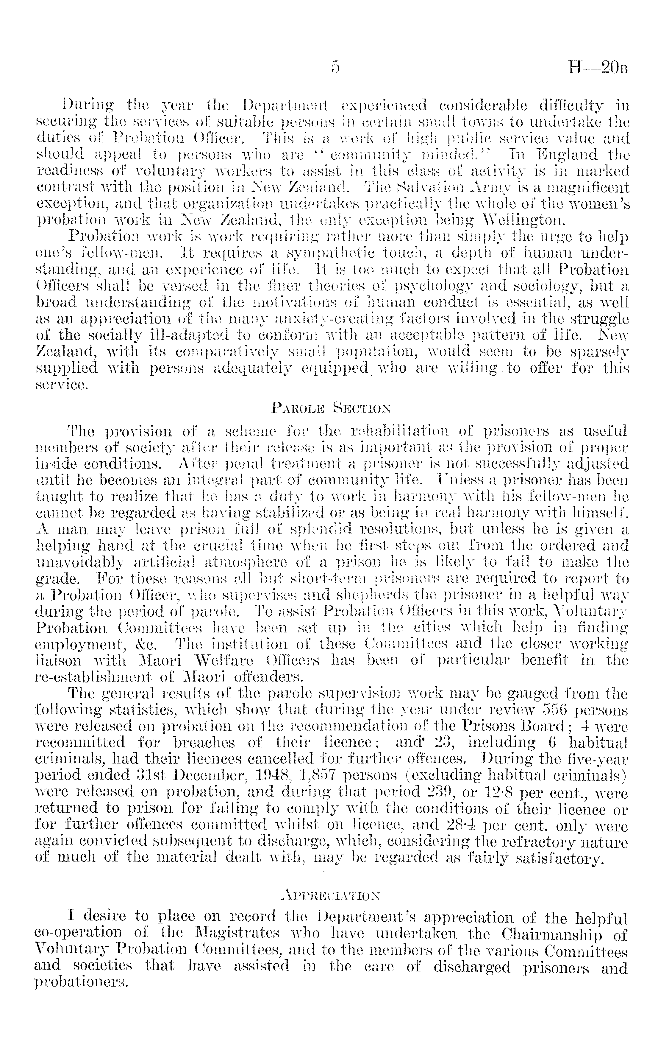 During the year the Department experienced considerable difficulty in securing the services of suitable persons in certain small towns to undertake the duties of Probation Officer. This is a work of high public service value and should appeal to persons who are " community minded. " In England the readiness of voluntary workers to assist in this class of activity is in marked contrast with the position in New Zealand. The Salvation Army is a magnificent exception, and that organization undertakes practically the whole of the women's probation work in New Zealand, the only exception being Wellington. Probation work is work requiring rather more than simply the urge to help one's fellow-men. It requires a sympathetic touch, a depth of human understanding, and an experience of life. It is too much to expect that all Probation Officers shall be versed in the finer theories of psychology and sociology,' but a broad understanding of the motivations of human conduct is essential, as well as an appreciation of the many anxiety-creating factors involved in the struggle of the socially ill-adapted to conform with an acceptable pattern of life. New Zealand, with its comparatively small population, would seem to be sparsely supplied with persons adequately equipped who are willing.to offer for this service. Parole Section The provision of a scheme for the rehabilitation of prisoners as useful members of society after their release is as important as the provision of proper inside conditions. After penal treatment a prisoner is not successfully adjusted until he becomes an integral part of community life. Unless a prisoner has been taught to realize that he has a duty to work in harmony with his fellow-men he cannot be regarded as having stabilized or as being in real harmony with himself. A man may leave prison full of splendid resolutions, but unless he is given a helping hand at the crucial time when he first steps out from the ordered and unavoidably artificial atmosphere of a prison he is likely to fail to make the grade. For these reasons all but short-term prisoners are required to report to a Probation Officer, who supervises and shepherds the prisoner in a helpful way during the period of parole. To assist Probation Officers in this work, Voluntary Probation Committees have been set up in the cities which help in finding employment, &c. The institution of these Committees and the closer working liaison with Maori Welfare Officers has been of particular benefit in the re-establishment of Maori offenders. The general results of the parole supervision work may be gauged from the following statistics, which show that during the year under review 556 persons were released on probation on the recommendation of the Prisons Board; 4 were recommitted for breaches of • their licence; and' 23, including 6 habitual criminals, had their licences cancelled for further offences. During the five-year period ended 31st December, 1948, 1,857 persons (excluding habitual criminals) were released on probation, and during that period 239, or 12-8 per cent., were returned to prison for failing to comply with the conditions of their licence or for further offences committed whilst on licence, and 28-4 per cent, only were again convicted subsequent to discharge, which, considering the refractory nature of much of the material dealt with, may be regarded as fairly satisfactory. Appreciation I desire to place on record the Department's appreciation of the helpful co-operation of the Magistrates who have undertaken the Chairmanship of Voluntary Probation Committees, and to the members of the various Committees and societies that have assisted in the care of discharged prisoners and probationers.