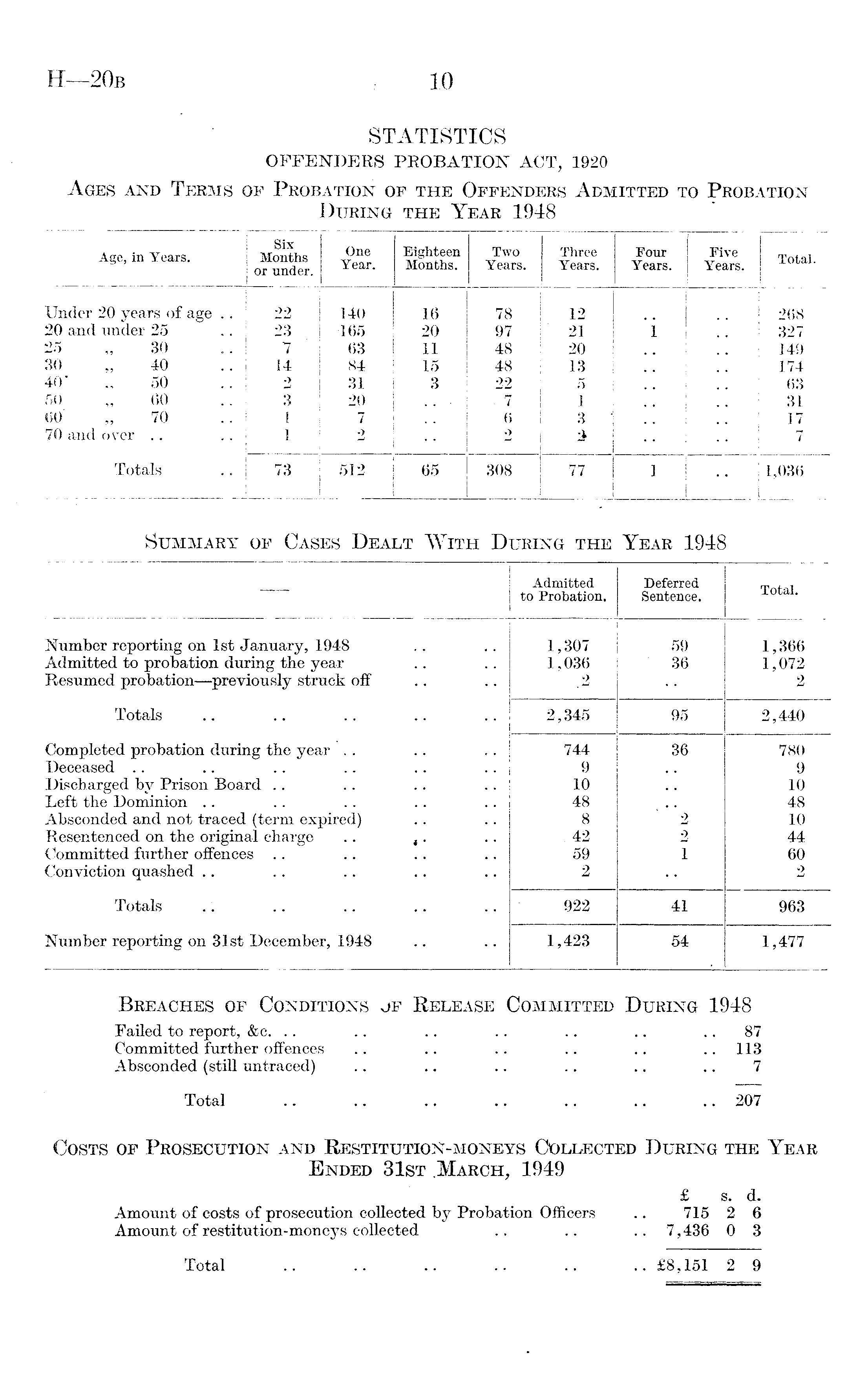 Breaches of Conditions jf Release Committed During 1948 Failed to report, &c. .. .. .. .. .. .. 87 Committed further offences .. .. .. .. .. ..113 Absconded (still untraced) .. .. .. .. .. .. 7 Total .. .. .. .. .. .. ..207 Costs of Prosecution and Restitution-moneys Collected During the Year Ended 31st March, 1949 £ s. d. Amount of costs of prosecution collected by Probation Officers .. 715 2 6 Amount of restitution-moneys collected .. .. .. 7,436 0 3 Total .. .. .. .. .. .. £8,151 2 9