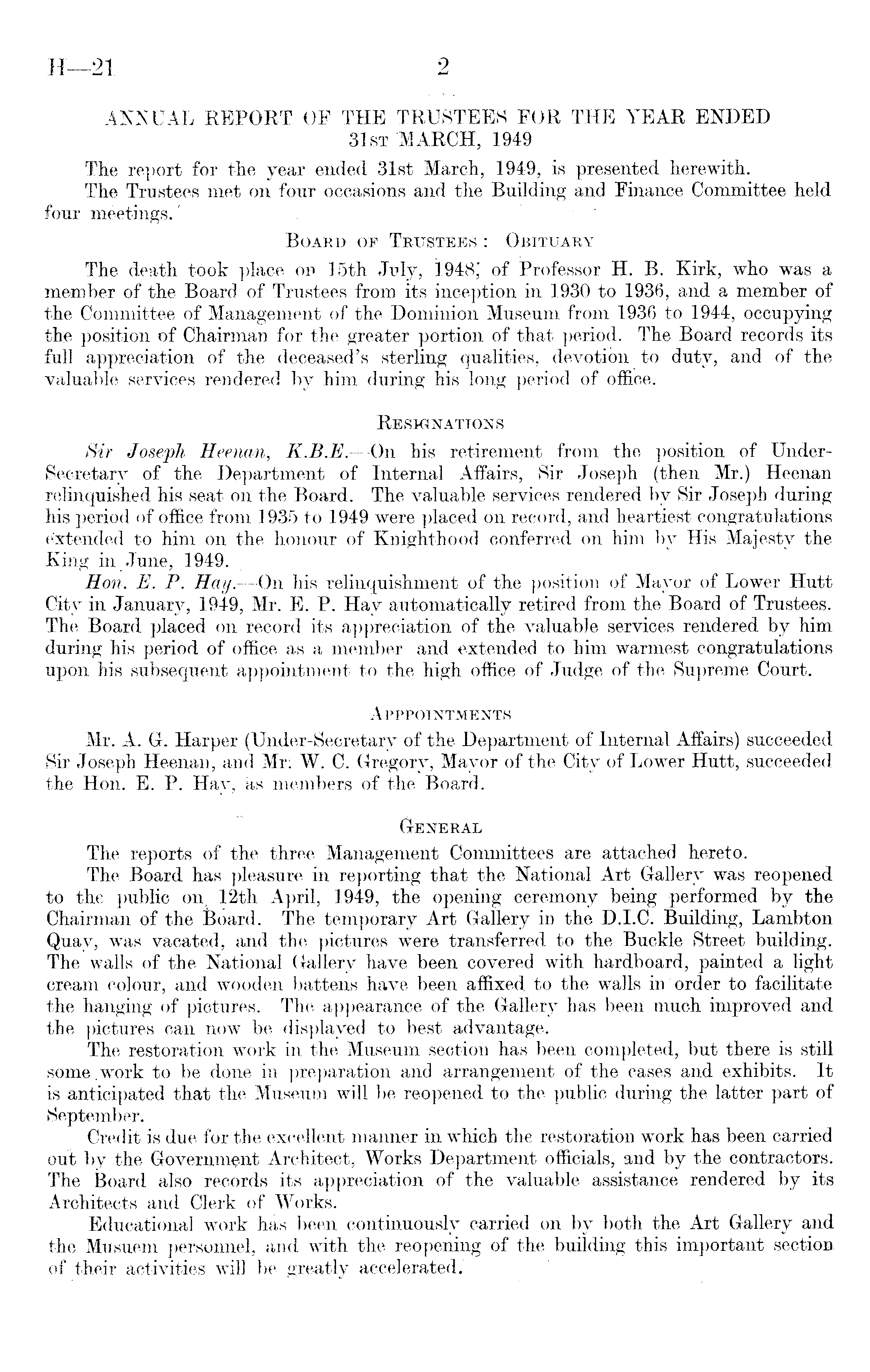 ANNUAL REPORT OF THE TRUSTEES FOR THE YEAR ENDED 31st MARCH, 1949 The report for the year ended 31st March, 1949, is presented herewith. The Trustees met on four occasions and the Building and Finance Committee held four meetings. ' Board of Trustees : Obituary The death took place op 15th July, 1948,' of Professor H. B. Kirk, who was a member of the Board of Trustees from its inception in 1930 to 1936, and a member of the Committee of Management of the Dominion Museum from 1936 to 1944, occupying th,e position of Chairman for the greater portion of that period. The Board records its full appreciation of the deceased's sterling qualities, devotion to duty, and of the valuable services rendered by him during his long period of office. Resignations Sir Joseph Heenan, K.B.E. —On his retirement from the position of UnderSecretary of the Department of Internal Affairs, Sir Joseph (then Mr.) Heenan relinquished his seat on the Board. The valuable services rendered by Sir Joseph during his period of office from 1935 to 1949 were placed on record, and heartiest congratulations extended to him on the honour of Knighthood conferred on him by His Majesty the King in June, 1949. Hon. E. P. Hay. —On his relinquishment of the position of Mayor of Lower Hutt City in January, 1949, Mr. E. P. Hay automatically retired from the Board of Trustees. The Board placed on record its appreciation of the valuable services rendered by him during his period of office as a member and extended to him warmest congratulations upon his subsequent appointment to the high office of Judge of the Supreme Court. Apppointments Mr. A. G. Harper (Under-Secretary of the Department of Internal Affairs) succeeded Sir Joseph Heenan, and Mr: W. C. Gregory, Mayor of the City of Lower Hutt, succeeded the Hon. E. P. Hay, as members of the Board. General The reports of the three Management Committees are attached hereto. The Board has pleasure in reporting that the National Art Gallery was reopened to the public on, 12th April, 1949, the opening ceremony being performed by the Chairman of the Board. The temporary Art Gallery in the D.I.C. Building, Lambton Quay, was vacated, and the pictures were transferred to the Buckle Street building. The walls of the National Gallery have been covered with hardboard, painted a light cream colour, and wooden battens have been affixed to the walls in order to facilitate the hanging of pictures. The appearance of the Gallery has been much improved and the pictures can now be displayed to best advantage. The restoration work in the Museum section has been completed, but there is still some .work to be done in preparation and arrangement of the cases and exhibits. It is anticipated that the Museum will be reopened to the public during the latter part of September. Credit is due for the excellent manner in which the restoration work has been carried out by the Government Architect, Works Department officials, and by the contractors. The Board also records its appreciation of the valuable assistance rendered by its Architects and Clerk of Works. Educational work has been continuously carried on by both the Art Gallery and the Musuem personnel, and with the reopening of the building this important section of their activities will be greatly accelerated.