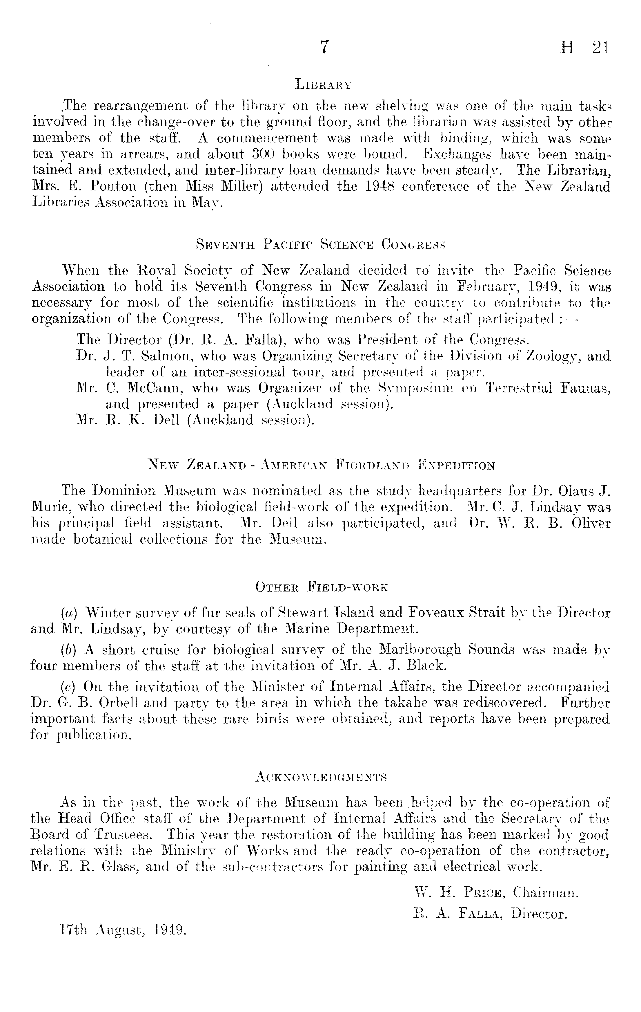 Library The rearrangement of the library on the new shelving was one of the main tasks involved in the change-over to the ground floor, and the librarian was assisted by other members of the staff. A commencement was made with binding, which was some ten years in arrears, and about 300 books were bound. Exchanges have been maintained and extended, and inter-library loan demands have been steady. The Librarian, Mrs. E. Ponton (then Miss Miller) attended the 1948 conference of the New Zealand Libraries Association in May. Seventh Pacific Science Congress When the Royal Society of New Zealand decided to' invite the Pacific Science Association to hold its Seventh Congress in New Zealand in February, 1949, it was necessary for most of the scientific institutions in the country to contribute to the organization of the Congress. The following members of the staff participated : The Director (Dr. R. A. Falla), who was President of the Congress. Dr. J. T. Salmon, who was Organizing Secretary of the Division of Zoology, and leader of an inter-sessional tour, and presented a paper. Mr. C. McCann, who was Organizer of the Symposium on Terrestrial Faunas, and presented a paper (Auckland session). Mr. R. K. Dell (Auckland session). New Zealand - American Fiordland Expedition The Dominion Museum was nominated as the study headquarters for Dr. Olaus J. Murie, who directed the biological field-work of the expedition. Mr. C. J. Lindsay was his principal field assistant. Mr. Dell also participated, and Dr. W. R. B. Oliver made botanical collections for the Museum. Other Field-work (a) Winter survey of fur seals of Stewart Island and Foveaux Strait by the Director and Mr. Lindsay, by courtesy of the Marine Department. (b) A short cruise for biological survey of the Marlborough Sounds was made by four members of the staff at the invitation of Mr. A. J. Black. (c) On the invitation of the Minister of Internal Affairs, the Director accompanied Dr. G-. B. Orbell and party to the area in which the takahe was rediscovered. Further important facts about these rare birds were obtained, and reports have been prepared for publication. Acknowledgments As in the past, the work of the Museum has been .helped by the co-operation of the Head Office staff of the Department of Internal Affairs and the Secretary of the Board of Trustees. This year the restoration of the building has been marked by good relations with the Ministry of Works and the ready co-operation of the contractor, Mr. E. R. Glass, and of the sub-contractors for painting and electrical work. W. H. Price, Chairman. R. A. Falla, Director. 17th August, 1949.