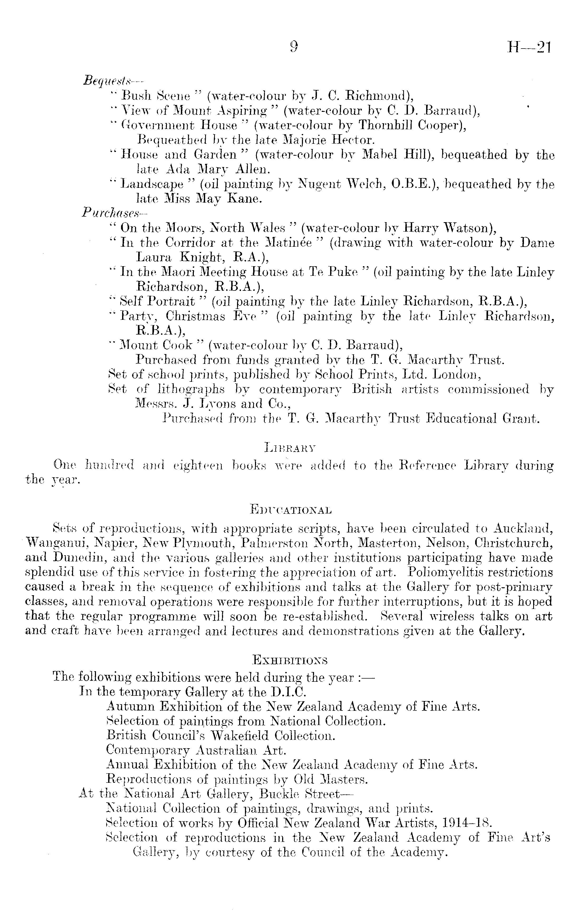 Bequests — " Bush Scene " (water-colour by J. C. Richmond), " View of Mount Aspiring " (water-colour by C. D. Barraud), " Government House " (water-colour by Thornhill Cooper), Bequeathed by the late Majorie Hector. " House and Garden " (water-colour by Mabel Hill), bequeathed by the late Ada Mary Allen. " Landscape " (oil painting by Nugent Welch, 0.8. E.), bequeathed by the late Miss May Kane. Purchases — " On the Moors, North Wales " (water-colour by Harry Watson), " In the Corridor at the Matinee " (drawing with water-colour by Dame Laura Knight, R.A.), " In the Maori Meeting House at Te Puke " (oil painting by the late Linley Richardson, R.8.A.), " Self Portrait " (oil painting by the late Linley Richardson, R.8.A.), " Party, Christmas Eve " (oil painting by the late Linley Richardson, R.8.A.), " Mount Cook " (water-colour by C. D. Barraud), Purchased from funds granted by the T. G. Macarthy Trust. Set of school prints, published by School Prints, Ltd. London, Set of lithographs by contemporary British artists commissioned by Messrs. J. Lyons and Co., Purchased from the T. G. Macarthy Trust Educational Grant. Library One hundred and eighteen books were added to the Reference Library during the year. Educational Sets of reproductions, with appropriate scripts, have been circulated to Auckland, Wanganui, Napier, New Plymouth, Palmerston North, Masterton, Nelson, Christchurch, and Dunedin, and the various galleries and other institutions participating have made splendid use of this service in fostering the appreciation of art. Poliomyelitis restrictions caused a break in the sequence of exhibitions and talks at the Gallery for post-primary classes, and removal operations were responsible for further interruptions, but it is hoped that the regular programme will soon be re-established. Several wireless talks on art and craft have been arranged and lectures and demonstrations given at the Gallery. Exhibitions The following exhibitions were held during the year : In the temporary Gallery at the D.I.C. Autumn Exhibition of the New Zealand Academy of Fine Arts. Selection of paintings from National Collection. British Council's Wakefield Collection. Contemporary Australian Art. Annual Exhibition of the New Zealand Academy of Fine Arts. Reproductions of paintings by Old Masters. At the National Art Gallery, Buckle Street — National Collection of paintings, drawings, and prints. Selection of works by Official New Zealand War Artists, 1914-18. Selection of reproductions in the New Zealand Academy of Fine Art's Gallery, by courtesy of the Council of the Academy.