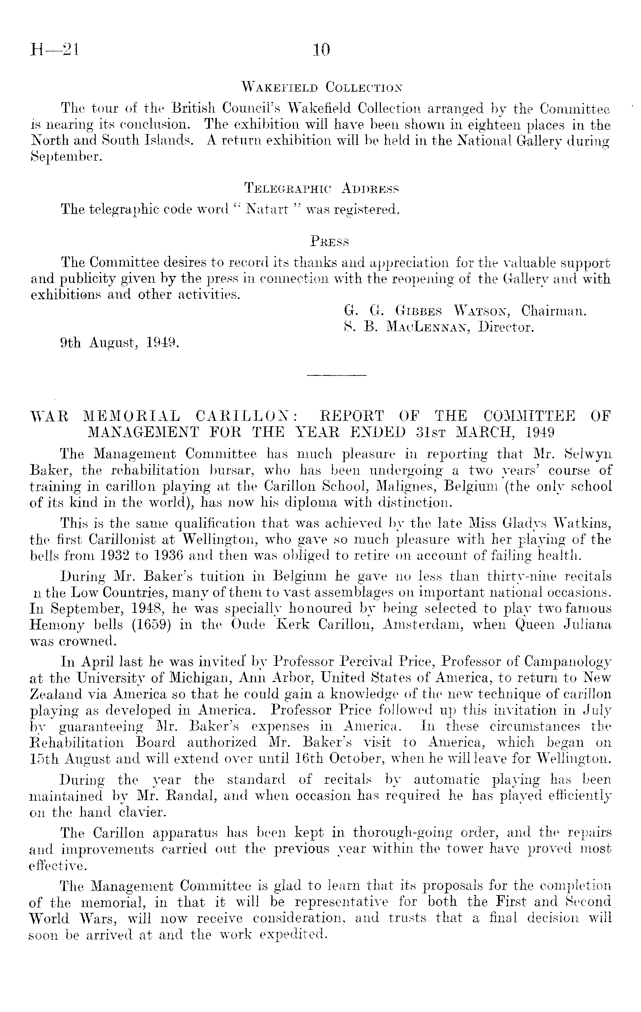 Wakefield Collection The tour of the British Council's Wakefield Collection arranged by the Committee is nearing its conclusion. The exhibition will have been shown in eighteen places in the North and South Islands. A return exhibition will be held in the National Gallery during September. Telegraphic Address The telegraphic code word " Natart " was registered. Press The Committee desires to record its thanks and appreciation for the valuable support and publicity given by the press in connection with the reopening of the Gallery and with exhibitions and other activities. G. G. Gibbes Watson, Chairman. S. B. MacLennan, Director. 9th August, 1949.