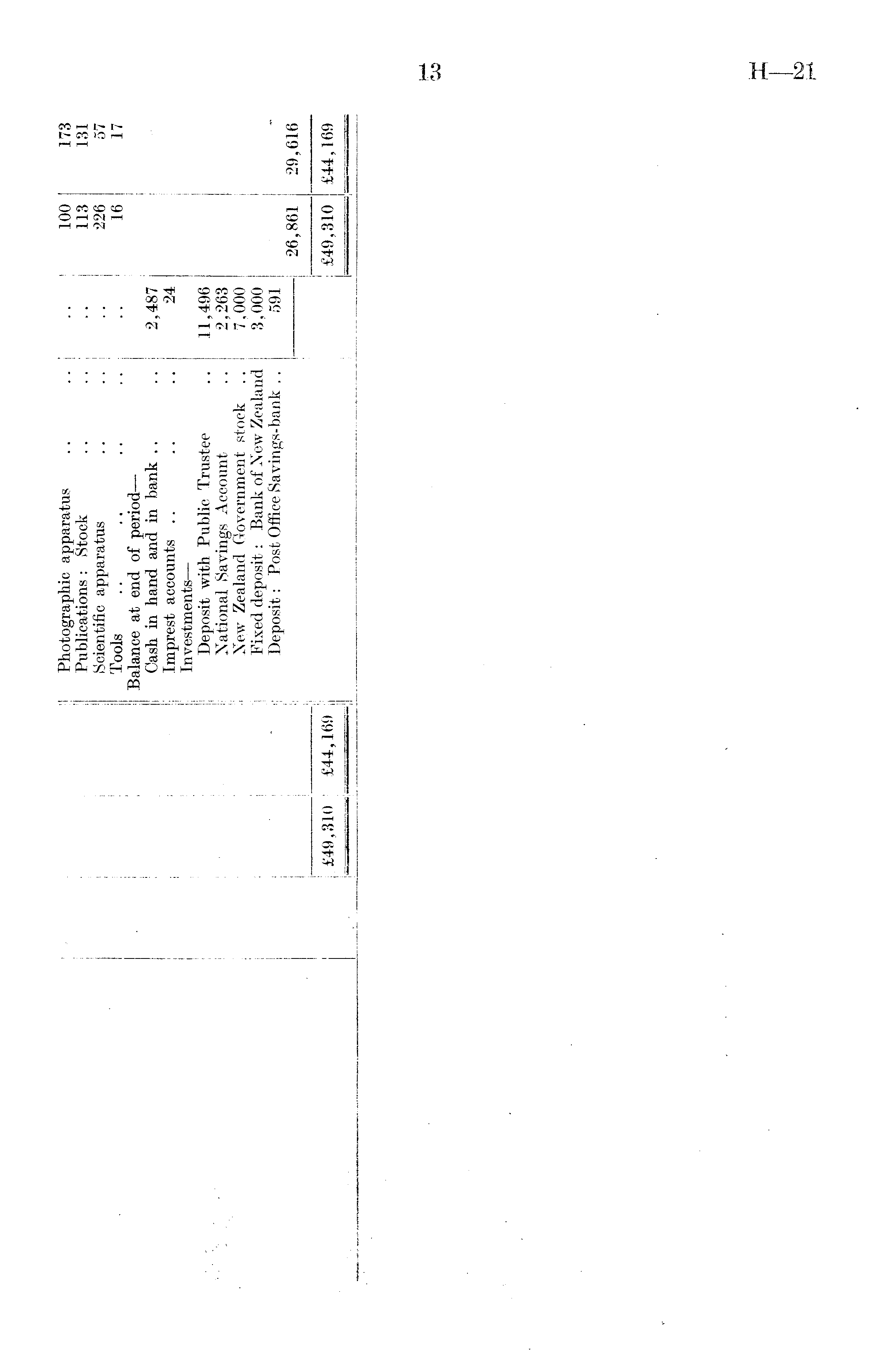 1 ' Photographic apparatus 100 173 Publications : Stock 113 131 Scientific apparatus 226 57 Tools 16 17 Balance at end of period — Cash in hand and in bank 2,487 Imprest accounts 24 Investments — Deposit with Public Trustee 11,496 ' National Savings Account 2,263 1 New Zealand Government stock 7,000 Fixed deposit: Bank of New Zealand 3,000 ' Deposit: Post Office Savings-bank .. 591 ... 26,861 29,616 £49,810 £44,169 £49,310 £44,169 1