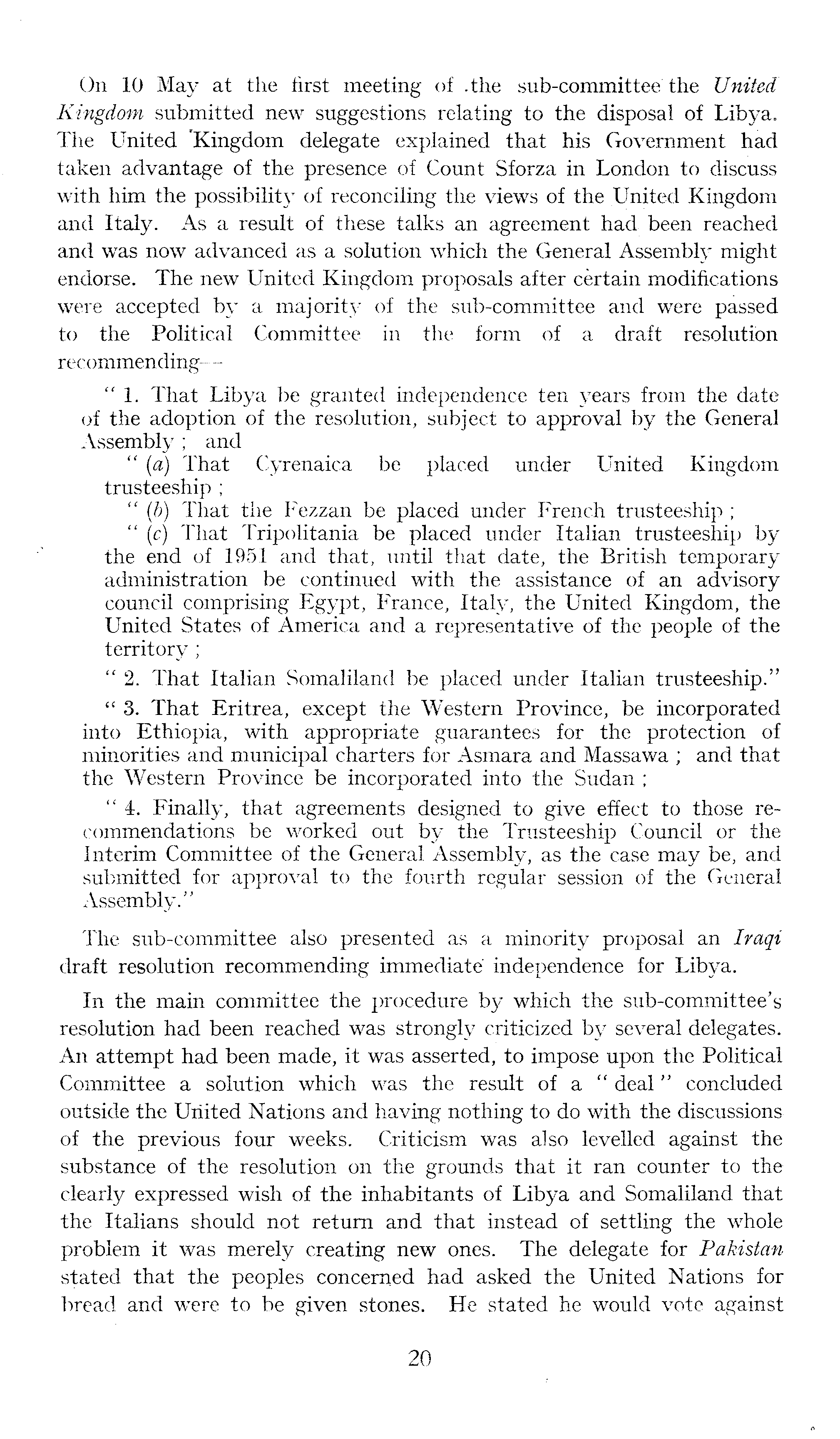On 10 May at the first meeting of .the sub-committee the United Kingdom submitted new suggestions relating to the disposal of Libya. The United 'Kingdom delegate explained that his Government had taken advantage of the presence of Count Sforza in London to discuss with him the possibility of reconciling the views of the United Kingdom and Italy. As a result of these talks an agreement had. been reached and was now advanced as a solution which the General Assembly might endorse. The new United Kingdom proposals after certain modifications were accepted by a majority of the sub-committee and were passed to the Political Committee in the form of a draft resolution recommending — " 1. That Libya be granted independence ten years from the date of the adoption of the resolution, subject to approval by the General Assembly ; and " (a) That Cyrenaica be placed under United Kingdom trusteeship ; " (b) That the Fezzan be placed under French trusteeship ; " (c) That Tripolitania be placed under Italian trusteeship by the end of 1951 and that, until that date, the British temporary administration be continued with the assistance of an advisory council comprising Egypt, France, Italy, the United Kingdom, the United States of America and a representative of the people of the territory; " 2. That Italian Somaliland be placed under Italian trusteeship." " 3. That Eritrea, except the Western Province, be incorporated into Ethiopia, with appropriate guarantees for the protection of minorities and municipal charters for Asmara and Massawa ; and that the Western Province be incorporated into the Sudan ; "4. Finally, that agreements designed to give effect to those recommendations be worked out by the Trusteeship Council or the Interim Committee of the General Assembly, as the case may be, and submitted for approval to the fourth regular session of the General Assembly." The sub-committee also presented as a minority proposal an Iraqi draft resolution recommending immediate independence for Libya. In the main committee the procedure by which the sub-committee's resolution had been reached was strongly criticized by several delegates. An attempt had been made, it was asserted, to impose upon the Political Committee a solution which was the result of a " deal" concluded outside the United Nations and having nothing to do with the discussions of the previous four weeks. Criticism was also levelled against the substance of the resolution on the grounds that it ran counter to the clearly expressed wish of the inhabitants of Libya and Somaliland that the Italians should not return and that instead of settling the whole problem it was merely creating new ones. The delegate for Pakistan stated that the peoples concerned had asked the United Nations for bread and were to be given stones. He stated he would vote against