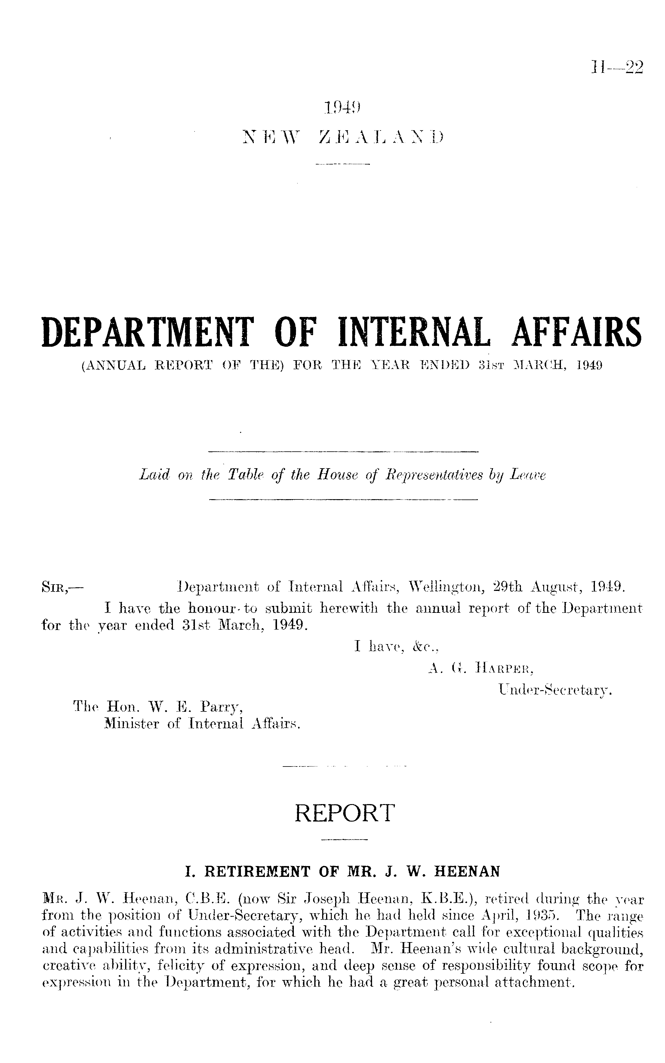Sib, — Department of Internal Affairs, Wellington, 29th August, 1949. I have the honour - to submit herewith the annual report of the Department for the year ended 31st March, 1949. I have, &c., A. G. Harper, Under-Secretary. The Hon. W. E. Parry, Minister of Internal Affairs.