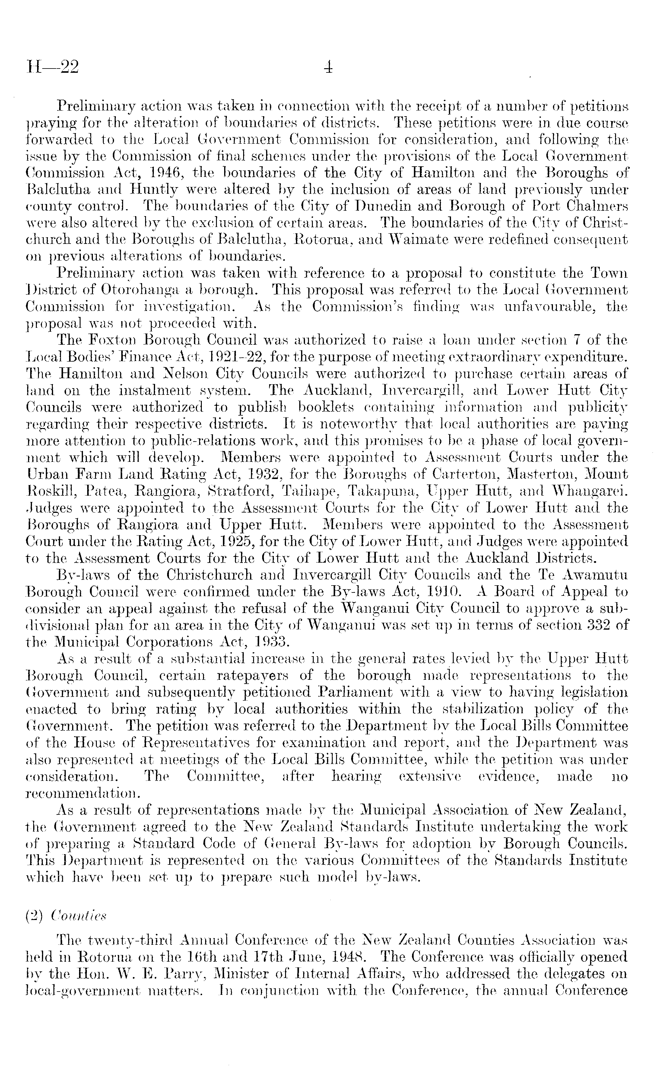 Preliminary action was taken in connection with the receipt of a number of petitions praying for the alteration of boundaries of districts. These petitions were in due course forwarded to the Local Government Commission for consideration, and following the issue by the Commission of final schemes under the provisions of the Local Government Commission Act, 1946, the boundaries of the City of Hamilton and the Boroughs of Balclutha and Huntly were altered by the inclusion of areas of land previously under county control. The boundaries of the City of Dunedin and Borough of Port Chalmers were also altered by the exclusion of certain areas. The boundaries of the City of Christchurch and the Boroughs of Balclutha, Rotorua, and Waimate were redefined consequent on previous alterations of boundaries. Preliminary action was taken with reference to a proposal to constitute the Town District of Otorohanga a borough. This proposal was referred to the Local Government Commission for investigation. As the Commission's finding was unfavourable, the proposal was not proceeded with. The Foxton Borough Council was authorized to raise a loan under section 7 of the Local Bodies' Finance Act, 1921-22, for the purpose of meeting extraordinary expenditure. The Hamilton and Nelson City Councils were authorized to purchase certain areas of land on the instalment system. The Auckland, Invercargill, and Lower Hutt City Councils were authorized to publish booklets containing information and publicity regarding their respective districts. It is noteworthy that local authorities are paying more attention to public-relations work, and this promises to be a phase of local government which will develop. Members were appointed to Assessment Courts under the Urban Farm Land Rating Act, 1932, for the Boroughs of Carterton, Masterton, Mount Roskill, Patea, Rangiora, Stratford, Taihape, Takapuna, Upper Hutt, and Whangarei. Judges were appointed to the Assessment Courts for the City of Lower Hutt and the Boroughs of Rangiora and Upper Hutt. Members were appointed to the Assessment Court under the Rating Act, 1925, for the City of Lower Hutt, and Judges were appointed to the Assessment Courts for the City of Lower Hutt and the Auckland Districts. By-laws of the Christchurch and Invercargill City Councils and the Te Awamutu Borough Council were confirmed under the By-laws Act, 1910. A Board of Appeal to consider an appeal against the refusal of the Wanganui City Council to approve a subdivisional plan for an area in the City of Wanganui was set up in terms of section 332 of the Municipal Corporations Act, 1933. As a result of a substantial increase in the general rates levied by the Upper Hutt Borough Council, certain ratepayers of the borough made representations to the Government and subsequently petitioned Parliament with a view to having legislation enacted to bring rating by local authorities within the stabilization policy of the Government. The petition was referred to the Department by the Local Bills Committee of the House of Representatives for examination and report, and the Department was also represented at meetings of the Local Bills Committee, while the petition was under consideration. The Committee,, after hearing extensive evidence, made no recommendation. As a result of representations made by the Municipal Association of New Zealand, the Government agreed to the New Zealand Standards Institute undertaking the work of preparing a Standard Code of General By-laws for adoption by Borough Councils. This Department is represented on the various Committees of the Standards Institute which have been set up to prepare such model by-laws. (2) Counties The twenty-third Annual Conference of the New Zealand Counties Association was held in Rotorua on the 16th and 17th June, 1948. The Conference was officially opened by the Hon. W. E. Parry, Minister of Internal Affairs, who addressed the delegates on local-government matters. In conjunction with the Conference, the annual Conference