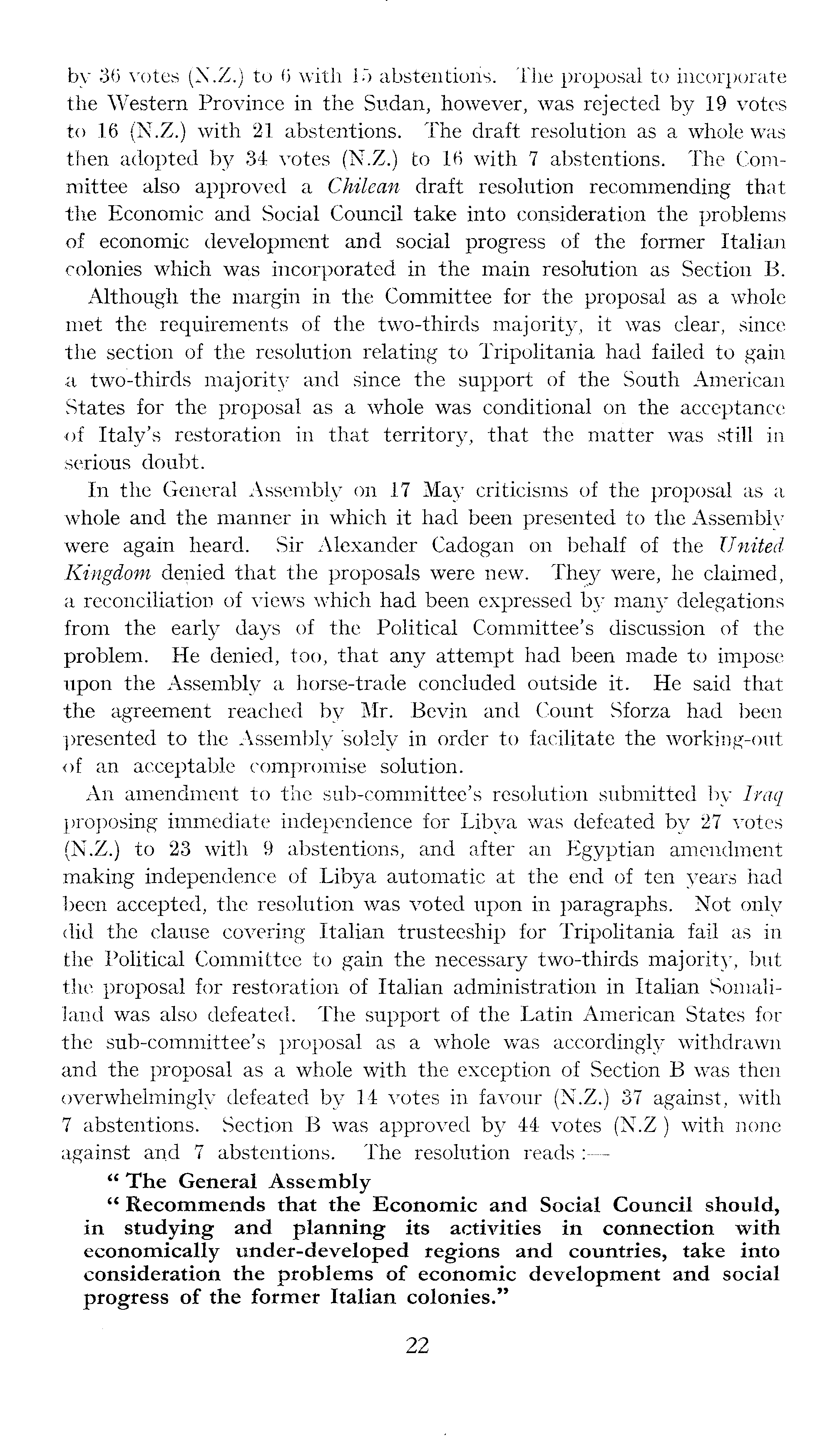 by 36 votes (N.Z.) to 6 with 15 abstentions. The proposal to incorporate the Western Province in the Sudan, however, was rejected by 19 votes to 16 (N.Z.) with 21 The draft resolution as a whole was then adopted by 34 votes (N.Z.) to 16 with 7 abstentions. The Committee also approved a Chilean draft resolution recommending that the Economic and Social Council take into consideration the problems of economic development and social progress of the former Italian colonies which was incorporated in the main resolution as Section B. Although the margin in the Committee for the proposal as a whole met the requirements of the two-thirds majority, it was clear, since the section of the resolution relating to Tripolitania had failed to gain a two-thirds majority and since the support of the South American States for the proposal as a whole was conditional on the acceptance of Italy's restoration in that territory, that the matter was still in serious doubt. In the General Assembly on 17 May criticisms of the proposal as a whole and the manner in which it had been presented to the Assembly were again heard. Sir Alexander Cadogan on behalf of the United Kingdom denied that the proposals were new. They were, he claimed, a reconciliation of views which had been expressed by many delegations from the early days of the Political Committee's discussion of the problem. He denied, too, that any attempt had been made to impose upon the Assembly a horse-trade concluded outside it. He said that the agreement reached by Mr. Bevin and Count Sforza had been presented to the Assembly solely in order to facilitate the working-out of an acceptable compromise solution. An amendment to the sub-committee's resolution submitted by Iraq proposing immediate independence for Libya was defeated by 27 votes (N.Z.) to 23 with 9 abstentions, and after an Egyptian amendment making independence of Libya automatic at the end of ten years had been accepted, the resolution was voted upon in paragraphs. Not only did the clause covering Italian trusteeship for Tripolitania fail as in the Political Committee to gain the necessary two-thirds majority, but the proposal for restoration of Italian administration in Italian Somaliland was also defeated. The support of the Latin American States for the sub-committee's proposal as a whole was accordingly withdrawn and the proposal as a whole with the exception of Section B was then overwhelmingly defeated by 14 votes in favour (N.Z.) 37 against, with 7 abstentions. Section B was approved by 44 votes (N.Z) with none against and 7 abstentions. The resolution reads : " The General Assembly " Recommends that the Economic and Social Council should, in studying and planning its activities in connection with economically under-developed regions and countries, take into consideration the problems of economic development and social progress of the former Italian colonies."