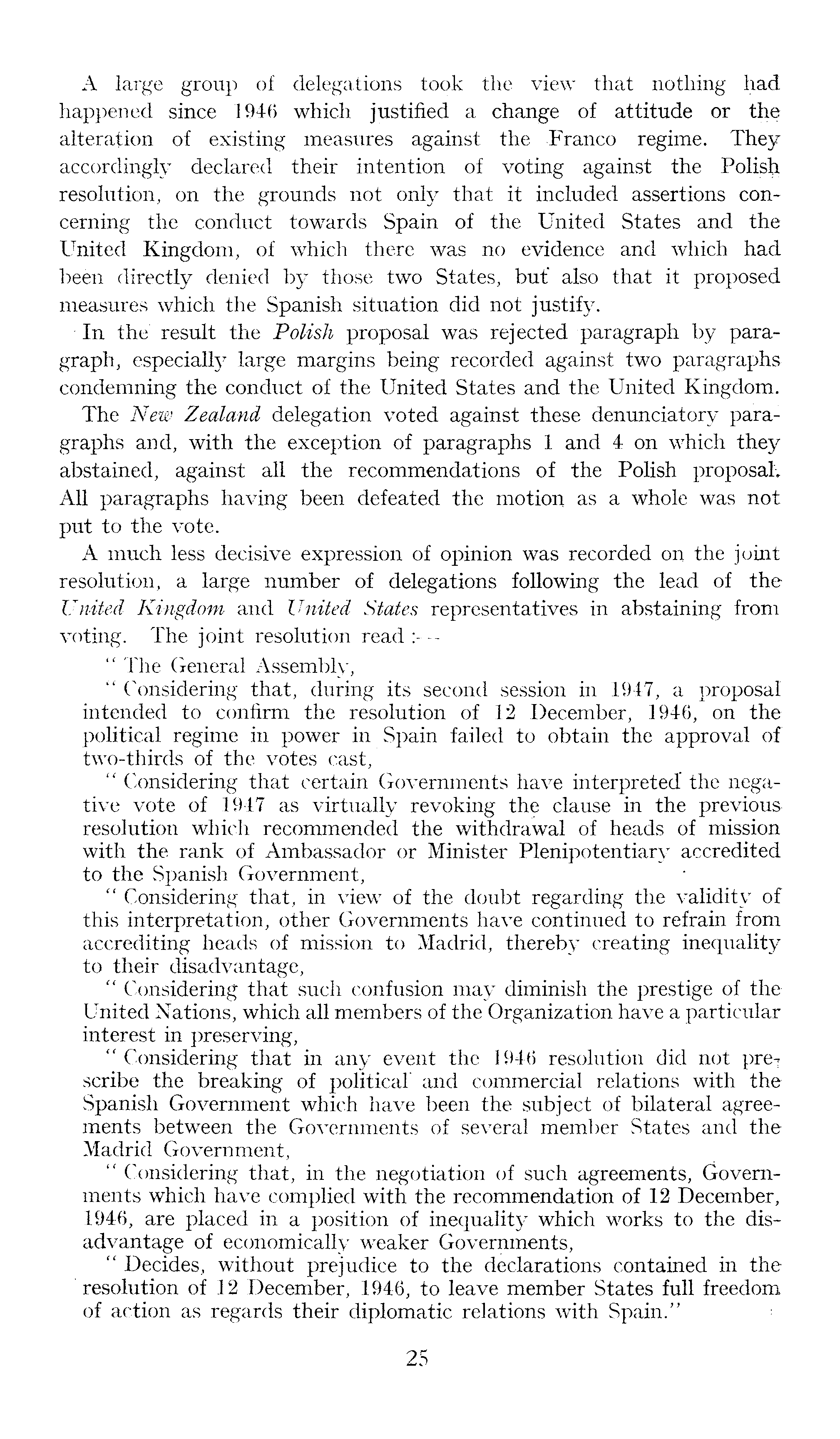 A large group of delegations took the view that nothing had happened since 1946 which justified a change of attitude or the alteration of existing measures against the Franco regime. They accordingly declared their intention of voting against the Polish resolution, on the grounds not only that it included assertions concerning the conduct towards Spain of the United States and the United Kingdom, of which there was no evidence and which had been directly denied by those two States, but' also that it proposed measures which the Spanish situation did not justify. In the result the Polish proposal was rejected paragraph by paragraph, especially large margins being recorded against two paragraphs condemning the conduct of the United States and the United Kingdom. The New Zealand delegation voted against these denunciatory paragraphs and, with the exception of paragraphs 1 and 4 on which they abstained, against all the recommendations of the Polish proposalv All paragraphs having been defeated the motion as a whole was not put to the vote. A much less decisive expression of opinion was recorded on the joint resolution, a large number of delegations following the lead of the United Kingdom and United States representatives in abstaining from voting. The joint resolution read : " The General Assembly, " Considering that, during its second session in 1947, a proposal intended to confirm the resolution of 12 December, 1946, on the political regime in power in Spain failed to obtain the approval of two-thirds of the votes cast, " Considering that certain Governments have interpreted the negative vote of 1947 as virtually revoking the clause in the previous resolution which recommended the withdrawal of heads of mission with the rank of Ambassador or Minister Plenipotentiary accredited to the Spanish Government, " Considering that, in view of the doubt regarding the validity of this interpretation, other Governments have continued to refrain from accrediting heads of mission to Madrid, thereby creating inequality to their disadvantage, " Considering that such confusion may diminish the prestige of the United Nations, which all members of the Organization have a particular interest in preserving, " Considering that in any event the 1946 resolution did not prescribe the breaking of political and commercial relations with the Spanish Government which have been the subject of bilateral agreements between the Governments of several member States and the Madrid Government, " Considering that, in the negotiation of such agreements, Governments which have complied with the recommendation of 12 December, 1946, are placed in a position of inequality which works to the disadvantage of economically weaker Governments, " Decides, without prejudice to the declarations contained in the resolution of 12 December, 1946, to leave member States full freedom of action as regards their diplomatic relations with Spain."