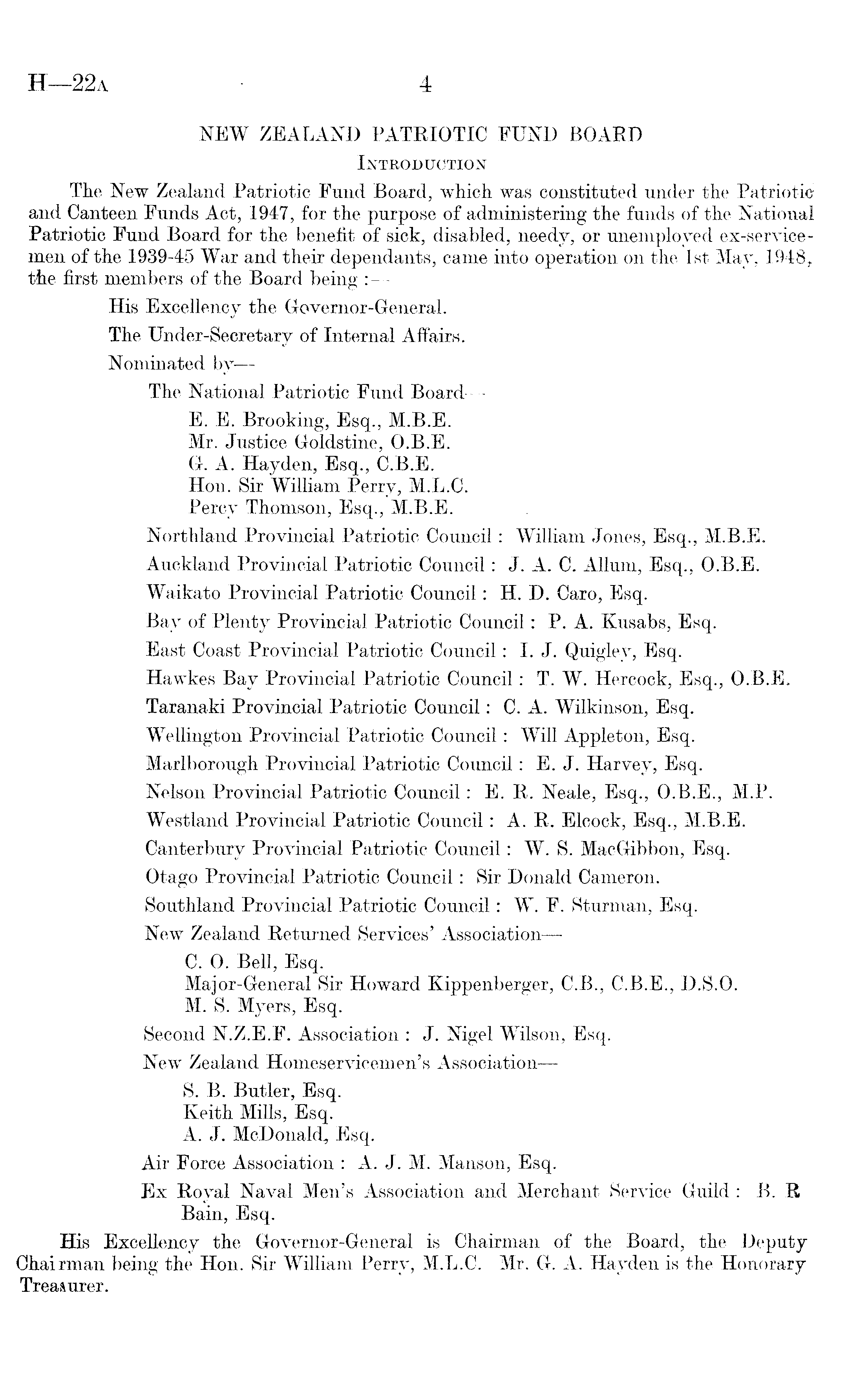 NEW ZEALAND PATRIOTIC FUND BOARD Introduction The New Zealand Patriotic Fund Board, which was constituted under the Patriotic and Canteen Funds Act, 1947, for the purpose of administering the funds'of the National Patriotic Fund Board for the benefit of sick, disabled, needy, or unemployed ex-service-men of the 1939-45 War and their dependants, came into operation on the Ist May, 1948 r the first members of the Board being : His Excellency the Governor-General. The Under-Secretary of Internal Affairs. Nominated by— The National Patriotic Fund Board — E. E. Brooking, Esq., M.B.E. Mr. Justice Goldstine, 0.8. E. G. A. Hayden, Esq., C.B.E. Hon. Sir William Perry, M.L.C. Percy Thomson, Esq., M.B.E. Northland Provincial Patriotic Council: William Jones, Esq., M.B.E. Auckland Provincial Patriotic Council: J. A. C. Allum, Esq., 0.8. E. Waikato Provincial Patriotic Council: H. D. Caro, Esq. Bay of Plenty Provincial Patriotic Council: P. A. Kusabs, Esq. East Coast Provincial Patriotic Council: I. J. Quigley, Esq. Hawkes Bay Provincial Patriotic Council: T. W. Hercock, Esq., 0.8. E. Taranaki Provincial Patriotic Council: C. A. Wilkinson, Esq. Wellington Provincial Patriotic Council: Will Appleton, Esq. Marlborough Provincial Patriotic Council: E. J. Harvey, Esq. Nelson Provincial Patriotic Council: E. R. Neale, Esq., 0.8. E., M.P. Westland Provincial Patriotic Council: A. R. Elcock, Esq., M.B.E. Canterbury Provincial Patriotic Council: W. S. Mac Gibbon, Esq. Otago Provincial Patriotic Council: Sir Donald Cameron. Southland Provincial Patriotic Council: W. F. Sturman, Esq. New Zealand Returned Services' Association— C. 0. Bell, Esq. Major-General Sir Howard Kippenberger, C.8., C.8.E., D.S.O. M. S. Myers, Esq. Second N.Z.E.F. Association : J. Nigel Wilson, Esq. New Zealand Homeservicemen's Association — S. B. Butler, Esq. Keith Mills, Esq. A. J. McDonald, Esq. Air Force Association : A. J. M. Manson, Esq. Ex Royal Naval Men's Association and Merchant Service Guild : B. R Bain, Esq. His Excellency the Governor-General is Chairman of the Board, the Deputy Chairman being the Hon. Sir William Perry, M.L.C. Mr. G. A. Hayden is the Honorary Trea&urer.