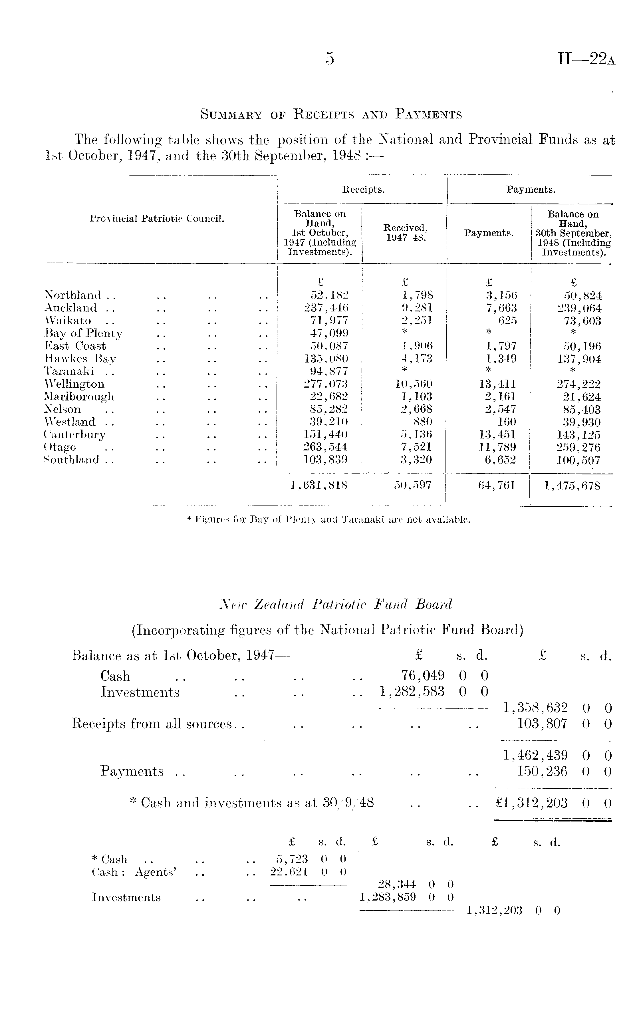 Receipts. Payments. Provincial Patriotic Council. Balance on Hand, 1st October, 1947 (Including Investments). Received, 1947-48. Payments. Balance on Hand, 30th September, 1948 (Including Investments). Northland .. Auckland .. Waikato Bay of Plenty East Coast Hawkes Bay Taranaki .. Wellington Marlborough Nelson Westland .. Canterbury Otago Southland .. £ 52,182 237,446 71,977 47,099 50,087 135,080 94,877 277,073 22,682 85,282 39,210 151,440 | 263,544 103,839 ; £ 1,798 9,281 2,251 * 1,906 4,173 * 10,560 1,103 2,668 880 5,136 7,521 3,320 £ 3,156 7,663 625 * 1,797 1,349 * 13,411 2,161 2,547 160 13,451 11,789 6,652 £ 50,824 239,064 73,603 * 50,196 137,904 * 274,222 21,624 85,403 39,930 143,125 259,276 100,507 1,631,818 50,597 64,761 1,475,678 * Figures for Bay of Plenty and Taranaki are not available.
