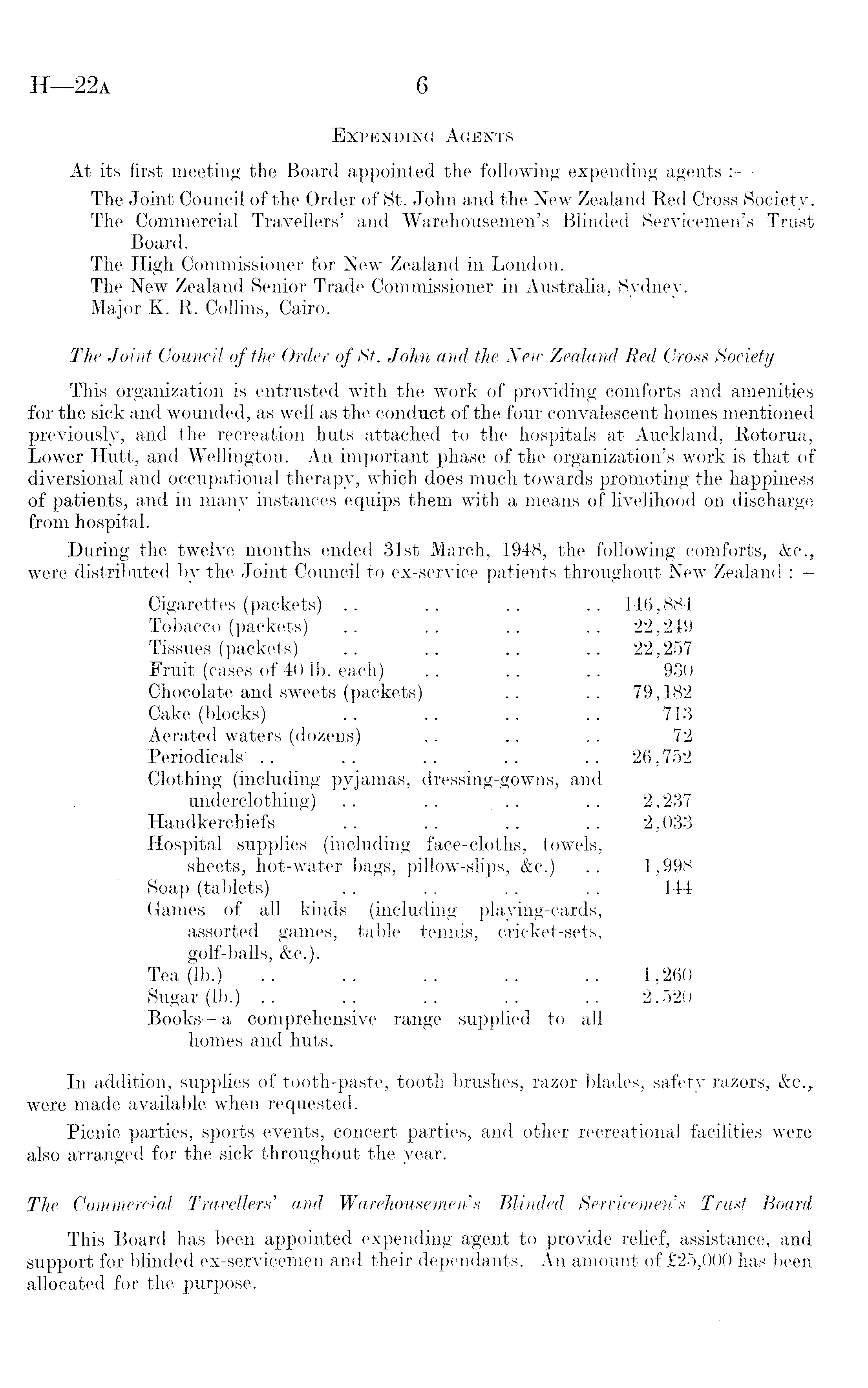 Expending Agents At its first meeting the Board appointed the following expending agents : The Joint Council of the Order of St. John and the New Zealand Red Cross Society. The Commercial Travellers' and Warehousemen's Blinded Servicemen's TrustBoard. The High Commissioner for New Zealand in London. The New Zealand Senior Trade Commissioner in Australia, Sydney. Major K. R. Collins, Cairo. The Joint Council of the Order of St. John and the New Zealand Red Cross Society This organization is entrusted with the work of providing comforts and amenities for the sick and wounded, as well as the conduct of the four convalescent homes mentioned previously, and the recreation huts attached to the hospitals at Auckland, Rotorua, Lower Hutt, and Wellington. An important phase of the organization's work is that of diversional and occupational therapy, which does much towards promoting the happiness of patients, and in many instances equips them with a means of livelihood on discharge from hospital. During the twelve months ended 31st March, 1948, the following comforts, &c., were distributed by the Joint Council to ex-service patients throughout New Zealand Cigarettes (packets) . . .. .. .. 146,884 Tobacco(packets) .. .. .. .. 22,249 Tissues (packets) .. .. .. .. 22,257 Fruit (cases of 40 lb. each) ~ .. .. 930 Chocolate and sweets (packets) .. .. 79,182 Cake (blocks) .. .. .. .. 713 Aerated waters (dozens) .. .. .. 72 Periodicals .. .. .. .. .. 26,752 Clothing (including pyjamas, dressing-gowns, and underclothing) .. .. .. .. 2,237 Handkerchiefs .. . . .. .. 2,033 Hospital supplies (including face-cloths, towels, sheets, hot-water bags, pillow-slips, &c.) .. 1,99^ Soap (tablets) .. .. .. .. 144 Games of all kinds (including playing-cards, assorted games, table tennis, cricket-sets, golf-balls, &c.). Tea (lb.) .. .. .. .. .. 1,260 Sugar (lb.) .. .. .. .. .. 2.520 Books—a comprehensive range supplied to all homes and huts. In addition, supplies of tooth-paste, tooth brushes, razor blades, safety razors, &c. r were made available when requested. Picnic parties, sports events, concert parties, and other recreational facilities were also arranged for the sick throughout the year. The Commercial Travellers' and Warehousemen's Blinded Servicemen's Trust Board This Board has been appointed expending agent to provide relief, assistance, and support for blinded ex-servicemen and their dependants. An amount of £25,000 has been allocated for the purpose.