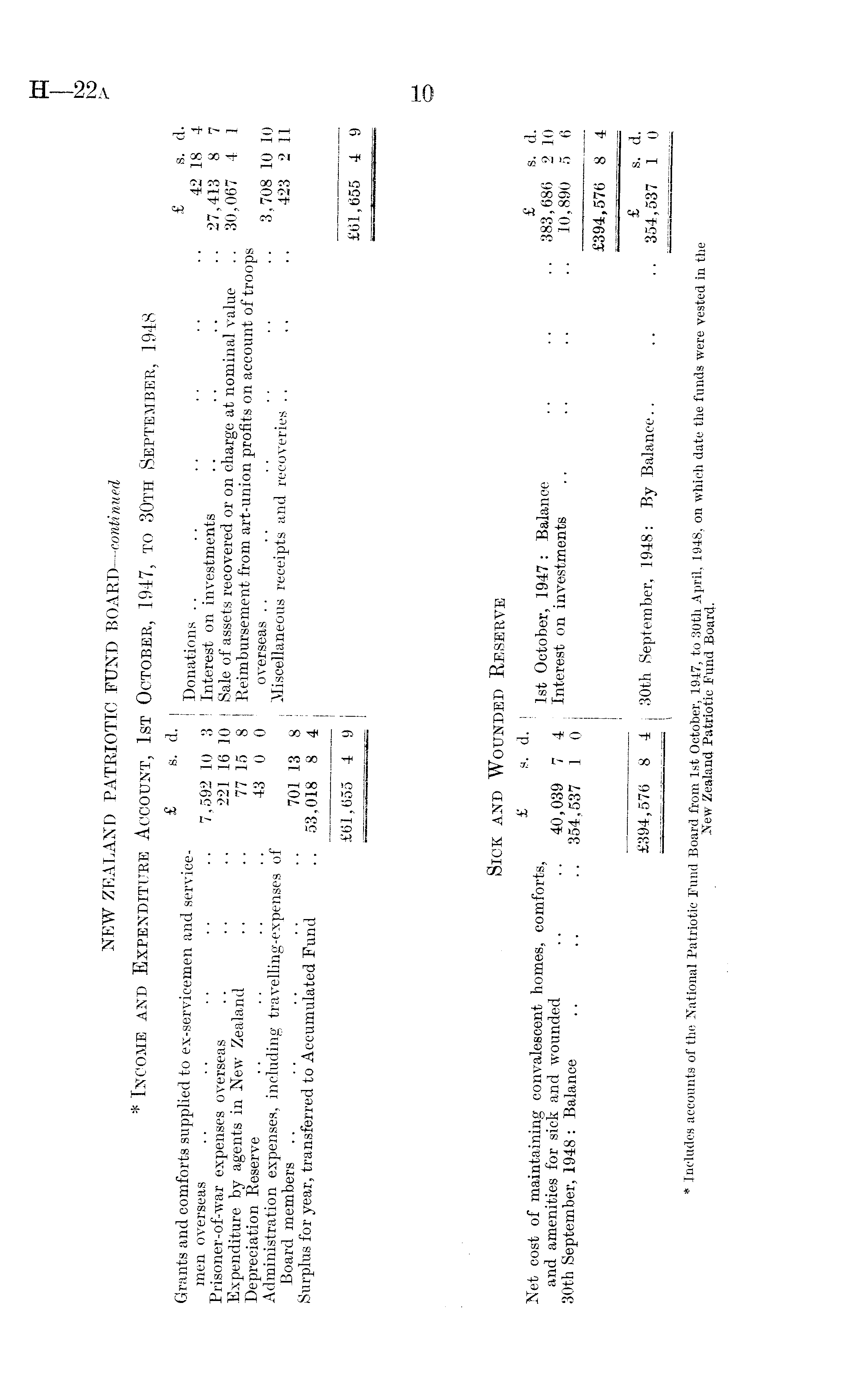 NEW ZEALAND PATRIOTIC FUND BOARD— continued * Income and Expenditure Account, Ist October, 1947, to 30th September, 1948 Grants and comforts supplied to ex-servicemen and service- &d " Donations £ 42 jg % eIiSSEl 6IP T 80 r 6i ? :: " £'£? 2 I tSZT m *" Zea,Bnd ■■ " II w „S e * m kursement from art-union profits on account ofTroops A St n ™ * 7oi m J Miscellaneous receipts and reverie, !.! " »'& 1i! Surplus for year, transferred to Accumulated Fund .. 53,018 8 4 £61,655 4 9 £61,655 4 9 Sick and Wounded Reserve Net cost of maintaining convalescent homes, comforts, " d ' Ist October, 1947: Balance Is/fISB oin andamemt.esfors'ckandu.eunded .. .. 40,039 7 4 Interest on investments . " " 8 ?o'S 30th September, 1948 : Balance .. .. .. 354537 10 ••••.. iu,«yu d b £394,576 8 4 ~~ I £ s d £394,576 8 4 | 30th September, 1948: By Balance.. .. .. 354,537 1 0 * Includes accounts of the National Patriotic Fund Board from Ist October 1947 to 30th April, 1948, on which date the funds were vested in the New Zealand Patriotic Fund Board.