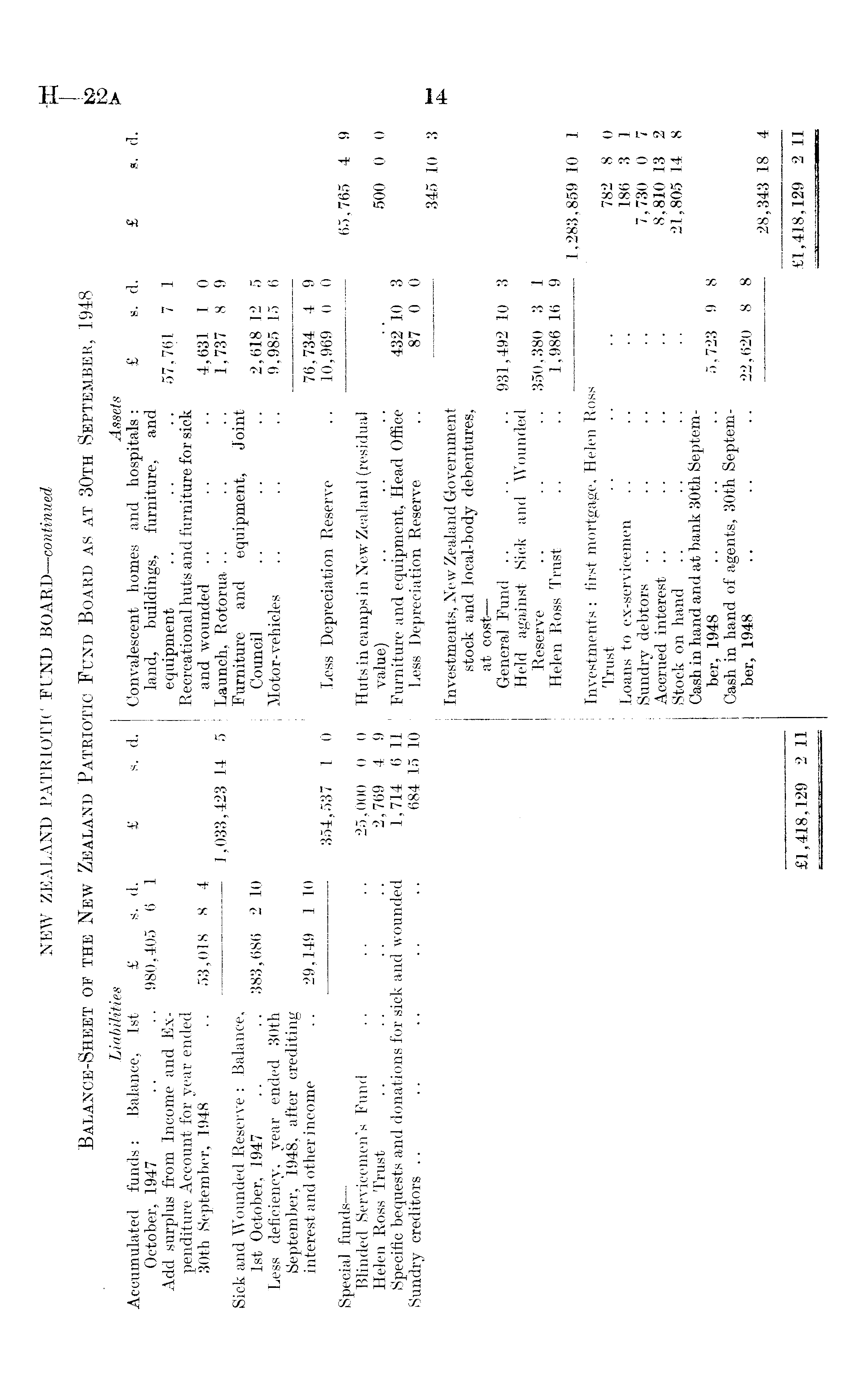 NEW ZEALAND PATRIOTIC FUND BOARD— continued Balance-Sheet of the New Zealand Patriotic Fund Board as at 30th September, 1948 Liabilities Assets Accumulated funds: Balance, Ist £ s. d. £ s. d. Convalescent homes and hospitals: £ s. d. £ s. d. October, 1947 . . .. 980,405 6 1 land, buildings, furniture, and Add surplus from Income and Ex- equipment .. .. .. 57,761 7 1 penditure Account for year ended Recreational huts and furniture for sick 30th September, 1948 .. 53,018 8 4 and wounded .. .. .. 4,631 1 0 1,033,423 14 5 Launch, Rotorua .. .. .. 1,737 8 9 Sick and Wounded Reserve : Balance, Furniture and equipment, Joint Ist October, 1947 .. .. 383,686 2 10 Council .. .. .. 2,618 12 5 Less deficiency, year ended 30th Motor-vehicles .. .. .. 9,985 15 6 September, 1948, after crediting interest and other income .. 29,149 1 10 76,734 4 9 354,537 1 0 Less Depreciation Reserve .. 10,969 0 0 Special funds— 65,765 4 9 Blinded Servicemen's Fund .. .. .. 25,000 0 0 Huts in camps in New Zealand (residual Helen Ross Trust .. .. .. .. 2,769 4 9 value) .. .. .. .. 500 0 0 Specific bequests and donations for sick and wounded 1,714 6 11 Furniture and equipment, Head Office 432 10 3 Sundry creditors .. .. .. .. .. 684 15 10 Less Depreciation Reserve .. 87 0 0 345 10 3 Investments, New Zealand Government stock and local-body debentures, at cost— General Fund .. .. .. 931,492 10 3 Held against Sick and Wounded | Reserve .. .. .. 350,380 3 1 Helen Ross Trust .. .. 1,986 16 9 — 1,283,859 10 1 Investments : first mortgage, Helen Ross Trust .. .. . . 782 8 0 Loans to ex-servicemen . . .. .. 186 3 1 Sundry debtors .. .. .. .. 7,730 0 7 Accrued interest .. .. .. .. 8,810 13 2 Stock on hand .. .. .. .. 21,805 14 8 Cash in hand and at bank 30th September, 1948 .. .. •• 5,723 9 8 Cash in hand of agents, 30th September, 1948 .. .. .. 22,620 8 8 28,343 18 4 £1,418,129 2 11 £1,418,129 2 11