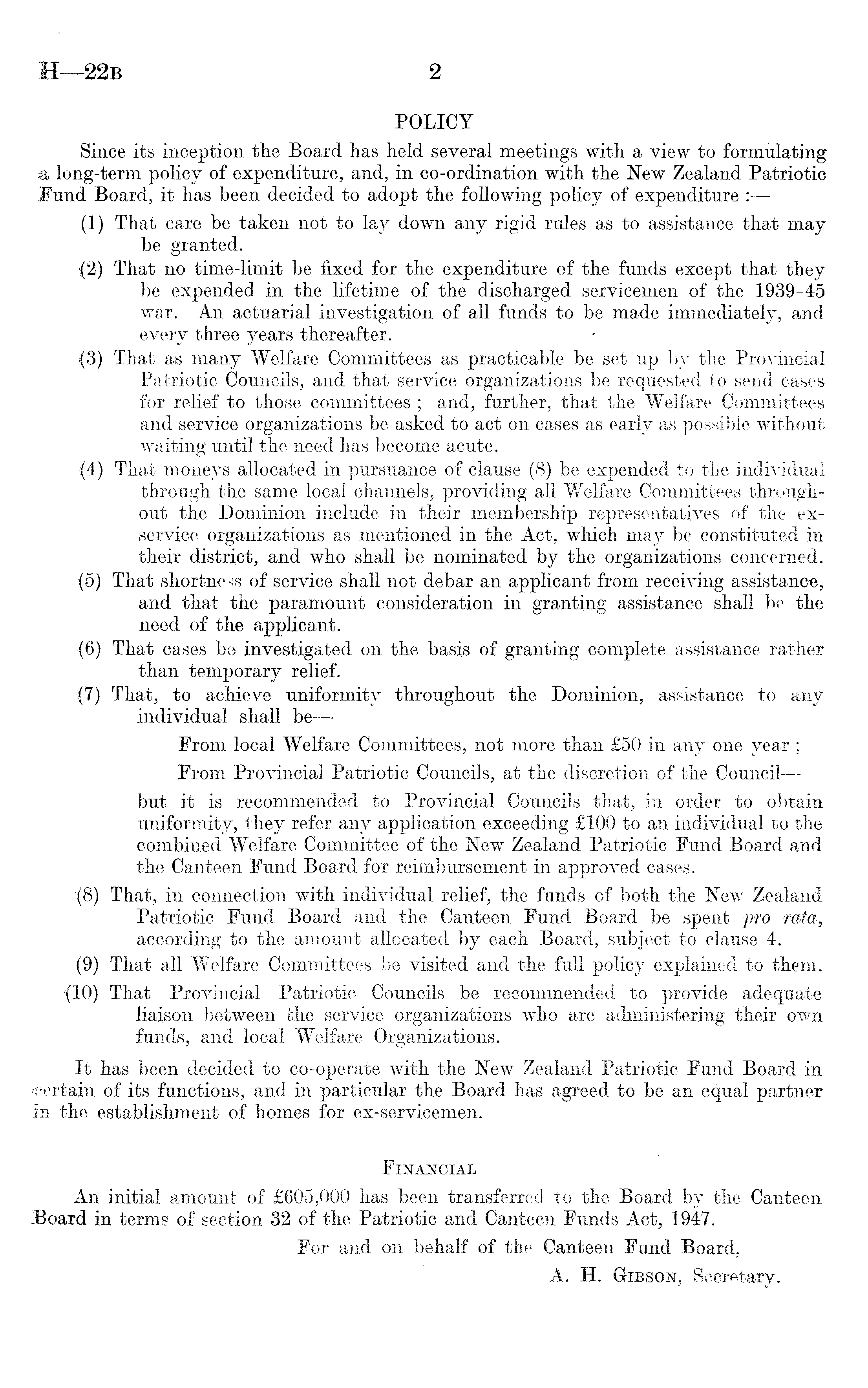 PQLICY Since its inception the Board has held several meetings with a view to formulating a long-term policy of expenditure, and, in co-ordination with the New Zealand Patriotic Fund Board, it has been decided to adopt the following policy of expenditure :■ — (1) That care be taken not to lay down any rigid rules as to assistance that may be granted. (2) That no time-limit be fixed for the expenditure of the funds except that they be expended in the lifetime of the discharged servicemen of the 1939-45 war. An actuarial investigation of all funds to be made immediately, and every three years thereafter. (3) That as many Welfare Committees as practicable be set up by the Provincial Patriotic Councils, and that service organizations be requested to send cases for relief to those committees ; and, further, that the Welfare Committees and service organizations be asked to act on cases as early as possible without waiting until the need has become acute. (4) That moneys allocated in pursuance of clause (8) be expended to the individual through the same local channels, providing all Welfare Committees throughout the Dominion include in their membership representatives of the exservice organizations as mentioned in the Act, which may be constituted in their district, and who shall be nominated by the organizations concerned. (5) That shortness of service shall not debar an applicant from receiving assistance, and that the paramount consideration in granting assistance shall be the need of the applicant. (6) That cases be investigated on the basis of granting complete assistance rather than temporary relief. (7) That, to achieve uniformity throughout the Dominion, assistance to any individual shall be — From local Welfare Committees, not more than £5O in any one year ; From Provincial Patriotic Councils, at the discretion of the Council—but it is recommended to Provincial Councils that, in order to obtain uniformity, they refer any application exceeding £lOO to an individual to the combined Welfare Committee of the New Zealand Patriotic Fund Board and the Canteen Fund Board for reimbursement in approved cases. •{8) That, in connection with individual relief, the funds of both the New Zealand Patriotic Fund Board and the Canteen Fund Board be spent pro rata, according to the amount allocated by each Board, subject to clause 4. (9) That all Welfare Committees be visited and the full policy explained to them. '(10) That Provincial Patriotic Councils be recommended to provide adequate liaison between the service organizations who are administering their own funds, and local Welfare Organizations. It has been decided to co-operate with the New Zealand Patriotic Fund Board in certain of its functions, and in particular the Board has agreed to be an equal partner in the establishment of homes for ex-servicemen. Financial An initial amount of £605,000 has been transferred to the Board by the Canteen Board in terms of section 32 of the Patriotic and Canteen Funds Act, 1947. For and on behalf of the Canteen Fund Board, A. H. Gibson, Secretary.