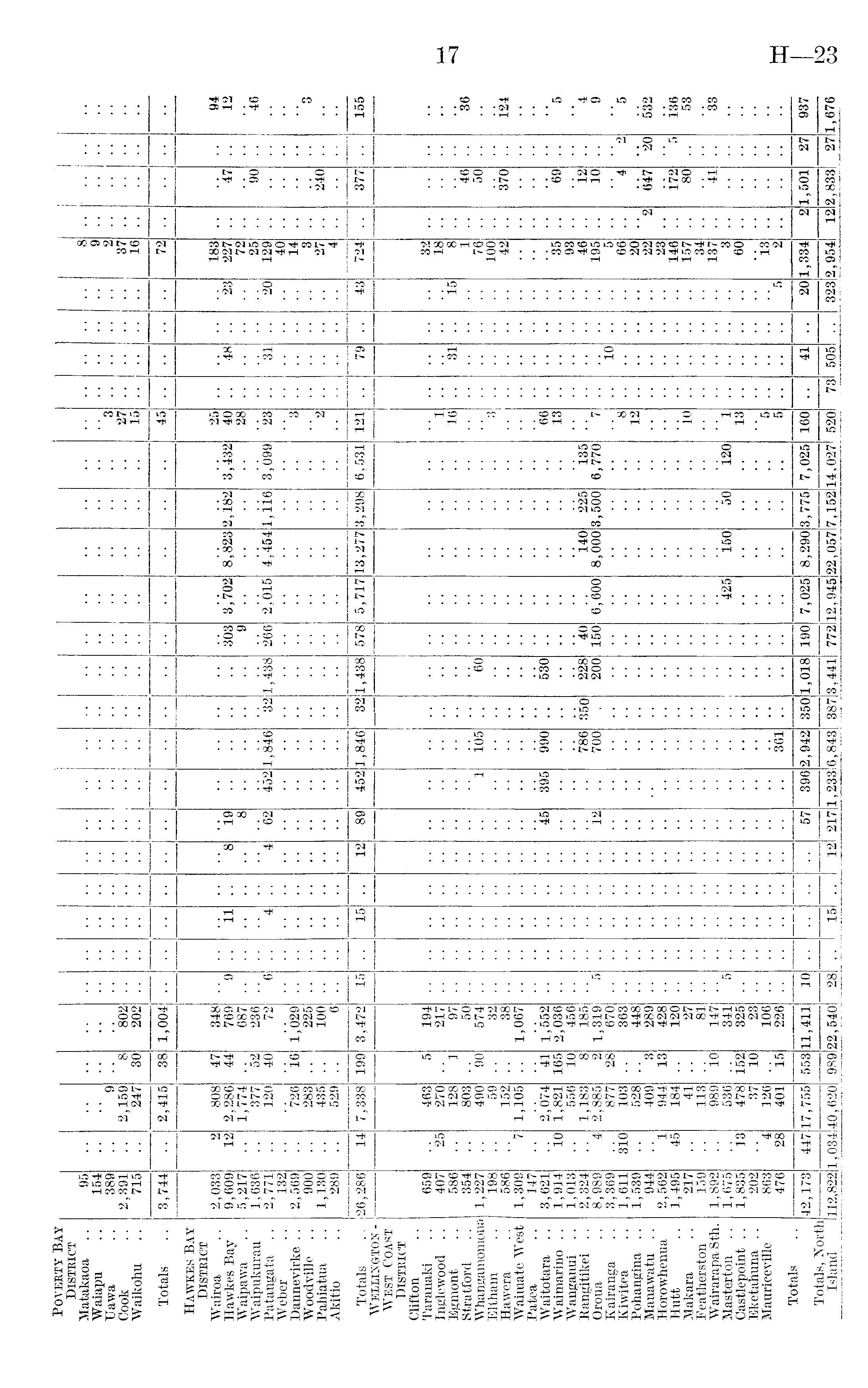 Poverty Bay District Matakaoa Waiapu TJawa Cook Waikohu Totals Hawkes Bay District Wairoa Hawkes Bay Waipawa Waipukurau Patangata .. Weber Dannevirke .. Woodville .. Pahiatua Akitio Totals Wellington - West Coast District Clifton Taranaki Inglewood .. Egmont Stratford Whangamomona Eltham Hawera Waimate West Patea Waitotara .. Waimarino .. Wanganui .. Rangitikei .. Oroua Kairanga Kiwitea Pohangina .. Manawatu .. Horowhenua Hutt Makara Featherston Wairarapa Sth. Masterton .. Castlepoint .. Eketahuna .. Mauriceville Totals Totals, North Island 95 154 389 2,391 715 9 2,159 247 8 30 802 202 3 27 15 8 9 2 37 16 3,744 2,415 38 1,004 45 72 2,033 9,609 5,217 1,636 2,771 132 2,569 900 1,130 289 12 808 2,286 1,774 377 120 726 283 435 529 47 44 52 40 16 348 769 687 236 72 1,029 225 100 6 9 6 11 4 8 4 19 8 62 452 1,846 32 1,438 303 9 266 3,702 2,015 4i 454 2,182 1,116 3 j 432 3,099 25 40 28 23 3 2 48 31 79 23 20 43 183 227 72 25 129 40 14 3 27 4 724 47 90 240 94 12 46 3 26,286 14 7,338 199 3,472 15 15 12 89 452 1,846 32 1,438 578 5,717 13,277 3,298 6,531 121 377 155 659 407 586 354 1,227 198 586 1,309 147 3,621 1,914 1,013 2,324 8,989 3,369 1,611 1,539 944 2,562 1,495 217 159 1,892 1,675 1,835 202 863 476 '25 7 'io ' '4 310 ' 1 45 is ' '4 28 463 270 128 803 490 59 152 1,105 2,074 1,821 556 1,183 2,885 877 103 528 409 944 184 41 113 989 536 478 37 126 401 5 "l 90 41 165 10 8 2 28 ' 3 13 io 152 10 15 194 217 97 50 574 32 38 1,067 1,552 2,036 456 185 1,319 670 363 448 289 428 120 27 81 147 341 325 23 106 226 5 5 45 12 1 395 105 990 786 700 361 350 60 530 228 200 40 150 425 i40 8,000 iso 225 3,500 50 135 6,770 120 1 16 3 66 13 7 8 12 10 1 13 5 5 31 10 15 5 32 18 8 1 76 100 42 35 93 46 195 5 66 20 22 23 146 157 34 137 3 60 13 2 2 46 50 370 69 12 10 4 647 1.72 80 '41 2 20 5 36 124 5 4 9 5 532 i.36 53 33 42,173 447 17,755 553 11,411 10 57 396 2,942 350 1,018 190 7,025 8,290 3,775 7,025 160 41 20 1,334 2 1,501 27 937 112,822 1,034 40,620 989 22,540 28 15 12 217 1,233 6,843 387 3,441 772 12,945 22,057 7,152 14,027 520 73 505 323 2,954 12 2,833 27 1,676