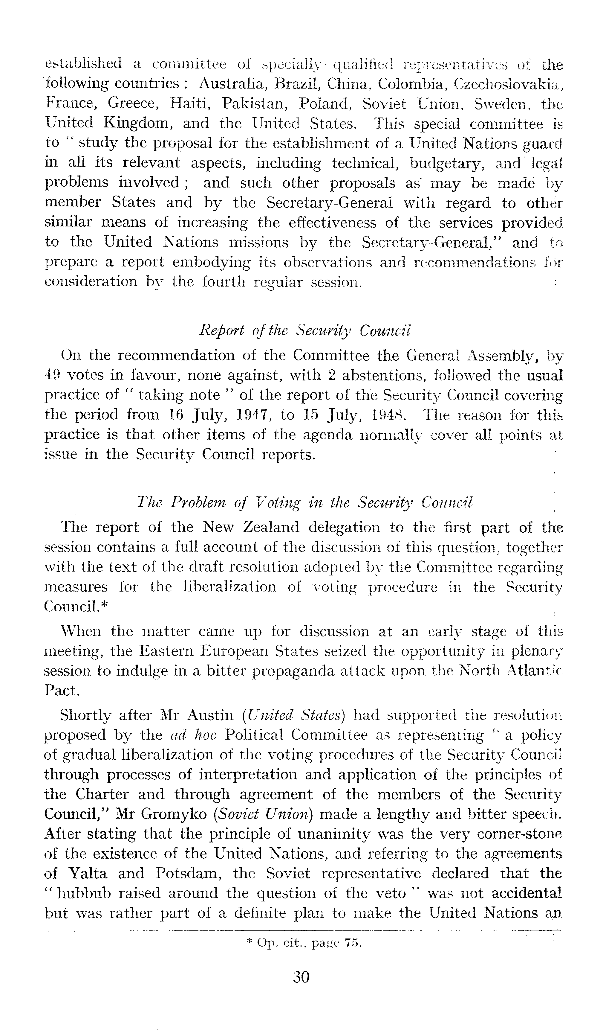 established a committee of specially qualified representatives of the following countries : Australia, Brazil, China, Colombia, Czechoslovakia, France, Greece, Haiti, Pakistan, Poland, Soviet Union, Sweden, the United Kingdom, and the United States. This special committee is to " study the proposal for the establishment of a United Nations guard in all its relevant aspects, including technical, budgetary, and legal problems involved; and such other proposals as' may be made by member States and by the Secretary-General with regard to other similar means of increasing the effectiveness of the services provided to the United Nations missions by the Secretary-General," and to prepare a report embodying its observations and recommendations for consideration by the fourth regular session. Report of the Security Council On the recommendation of the Committee the General Assembly, by 49 votes in favour, none against, with 2 abstentions, followed the usual practice of " taking note " of the report of the Security Council covering the period from 16 July, 1947, to 15 July, 1948. The reason for this practice is that other items of the agenda normally cover all points at issue in the Security Council reports. The Problem of Voting in the Security Council The report of the New Zealand delegation to the first part of the session contains a full account of the discussion of this question, together with the text of the draft resolution adopted by the Committee regarding measures for the liberalization of voting procedure in the Security Council.* When the matter came up for discussion at an early stage of this meeting, the Eastern European States seized the opportunity in plenary session to indulge in a bitter propaganda attack upon the North Atlantic Pact. Shortly after Mr Austin (United States) had supported the resolution proposed by the ad hoc Political Committee as representing " a policy of gradual liberalization of the voting procedures of the Security Council through processes of interpretation and application of the principles of the Charter and through agreement of the members of the Security Council," Mr Gromyko (Soviet Union) made a lengthy and bitter speech. After stating that the principle of unanimity was the very corner-stone of the existence of the United Nations, and referring to the agreements of Yalta and Potsdam, the Soviet representative declared that the " hubbub raised around the question of the veto " was not accidental but was rather part of a definite plan to make the United Nations an