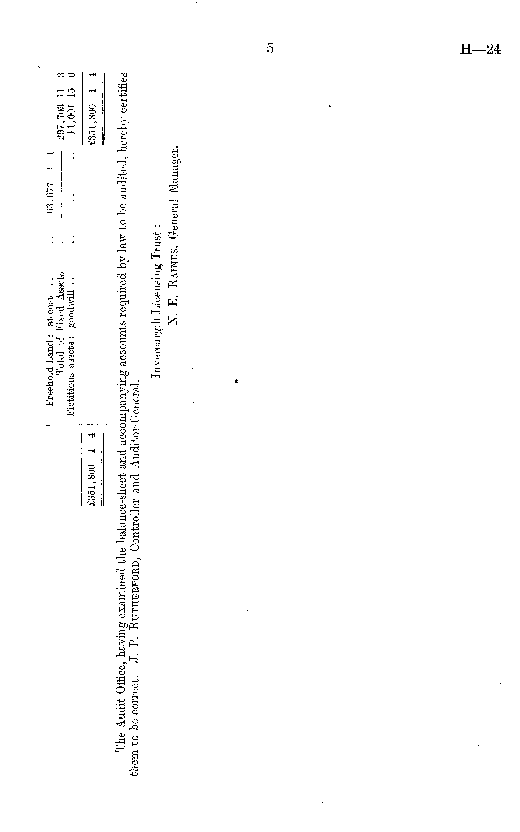 Freehold Land: at cost .. .. 63,677 1 1 Total of Fixed Assets .. 297,703 11 3 Fictitious assets: goodwill .. .. .. .. 11,001 15 0 £351,800 1 4 £351,800 1 4 The Audit Office, having examined the balance-sheet and accompanying accounts required by law to be audited, hereby certifies them to be correct.— J. P. Rutherford, Controller and Auditor-General. Invereargill Licensing Trust: N. E. Raines, General Manager.