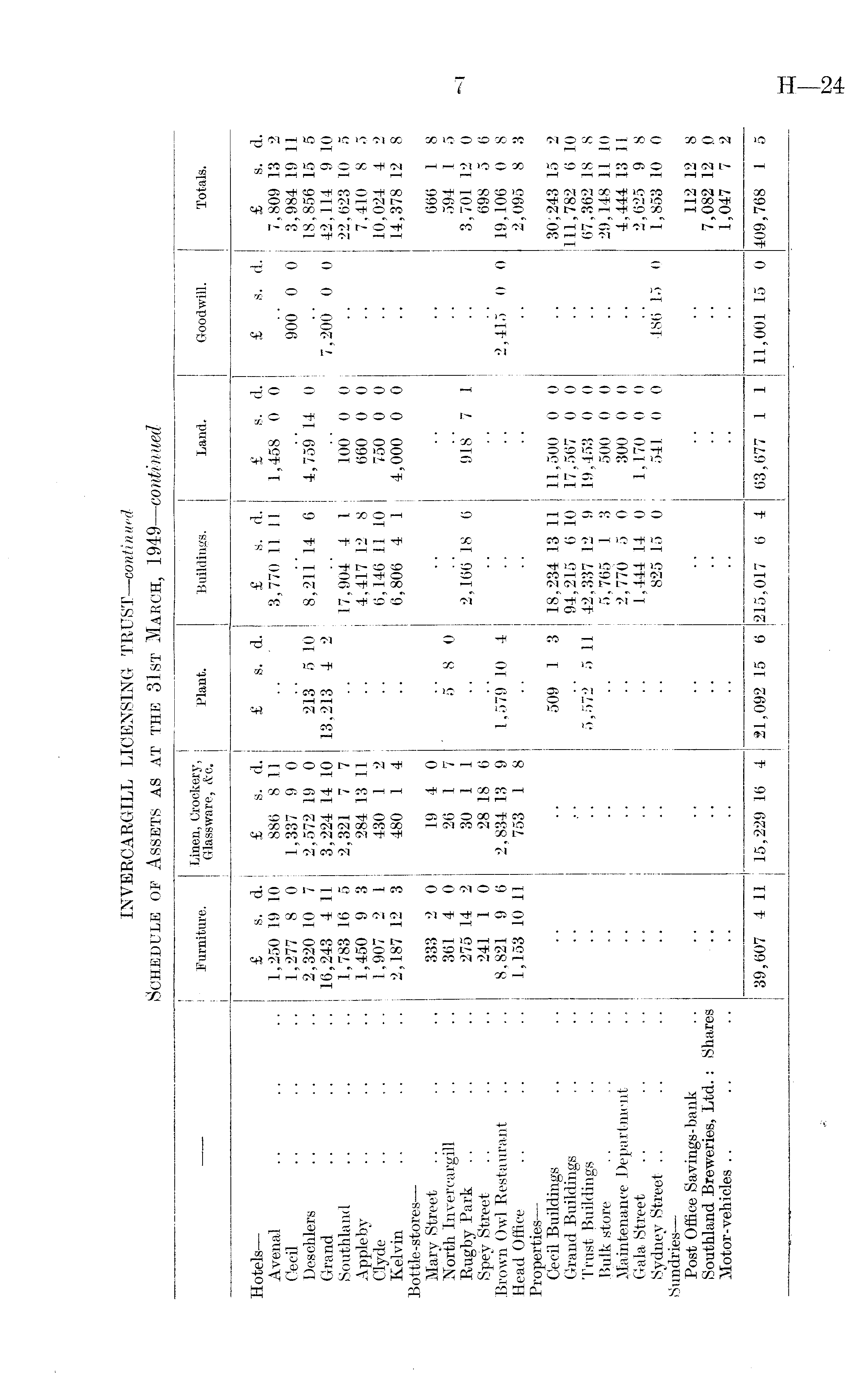 ■ Furniture. "^assware^&o'' PlaBt - Buildings. Land. Goodwill. Totals. Hotels — £ s. d. £ s. d. £ s. d. £ s. d. £ s. d. £ s. d. £ s. d. Avenal .. .. .. 1,250 19 10 886 8 11 .. * 3,770 1111 1,458 0 0 .. 7,809 13 2 Cecil .. .. .. 1,277 8 0 1,337 9 0 .. .. .. 900 0 0 3,984 19 11 Deschlers .. .. .. 2,320 10 7 2,572 19 0 213 5 10 8,211 14 6 4,759 14 0 .. 18,856 15 5 Grand .. .. .. 16,243 4 11 3,224 14 10 13,213 4 2 .. .. 7,200 0 0 42,114 9 10 Southland .. .. .. 1,783 16 5 2,321 7 7 .. 17,904 4 1 100 0 0 .. 22,623 10 5 Appleby .. .. .. 1,450 9 3 284 13 11 .. 4,417 12 8 660 0 0 .. 7,410 8 5 Clyde .. .. .. 1,907 2 1 430 1 2 .. 6,146 11 10 750 0 0 .. 10,024 4 2 Kelvin .. .. .. 2,187 12 3 480 1 4 .. 6,806 4 1 4,000 0 0 .. 14,378 12 8 Bottle-stores — Mary Street .. . . . . 333 2 0 19 4 0 . . .. . . .. 666 1 8 North Invercargill .. . . 361 4 0 26 1 7 ' 5 8 0 . . . . . . 594 1 5 Rugby Park .. .. .. 275 14 2 30 1 1 .. 2,166 18 6 918 7 1 .. 3,70112 0 Spey Street .. . . .. 241 1 0 28 18 6 . . .. . . . . 698 5 6 Brown Owl Restaurant .. .. 8,821 9 6 2,834 13 9 1,579 10 4 .. .. 2,415 0 0 19,106 0 8 Head Office .. .. .. 1,153 10 11 753 1 8 .. .. .. .. 2,095 8 3 Properties — Cecil Buildings .. .. .. .. 509 1 3 18,234 13 11 11,500 0 0 .. 30;243 15 2 Grand Buildings .. .. .. .. .. 94,215 6 10 17,567 0 0 .. 111,782 6 10 Trust Buildings .. .. .. .. 5,572 5 11 42,337 12 9 19,453 0 0 .. 67,362 18 8 Bulk store .. .. .. .. .. .. 5,765 1 3 500 0 0 .. 29,148 11 10 Maintenance Department .. .. .. .. 2,77050 300 0 0 .. 4,444 13 11 Gala Street .. .. .. .. .. .. 1,444 14 0 1,170 0 0 .. 2,625 9 8 Sydney Street .. .. .. .. .. .. 825 15 0 541 0 0 486 15 0 1,853 10 0 Sundries — Post Office Savings-bank . . .. .. .. .. . . .. 112 12 8 Southland Breweries, Ltd. : Shares .. .. .. .. .. .. 7,082 12 0 Motor-vehicles .. .. .. .. .. .. .. . . .. 1,047 7 2 39,607 4 11 15,229 16 4 21,092 15 6 215,017 6 4 63,677 1 1 11,001 15 0 409,768 1 5