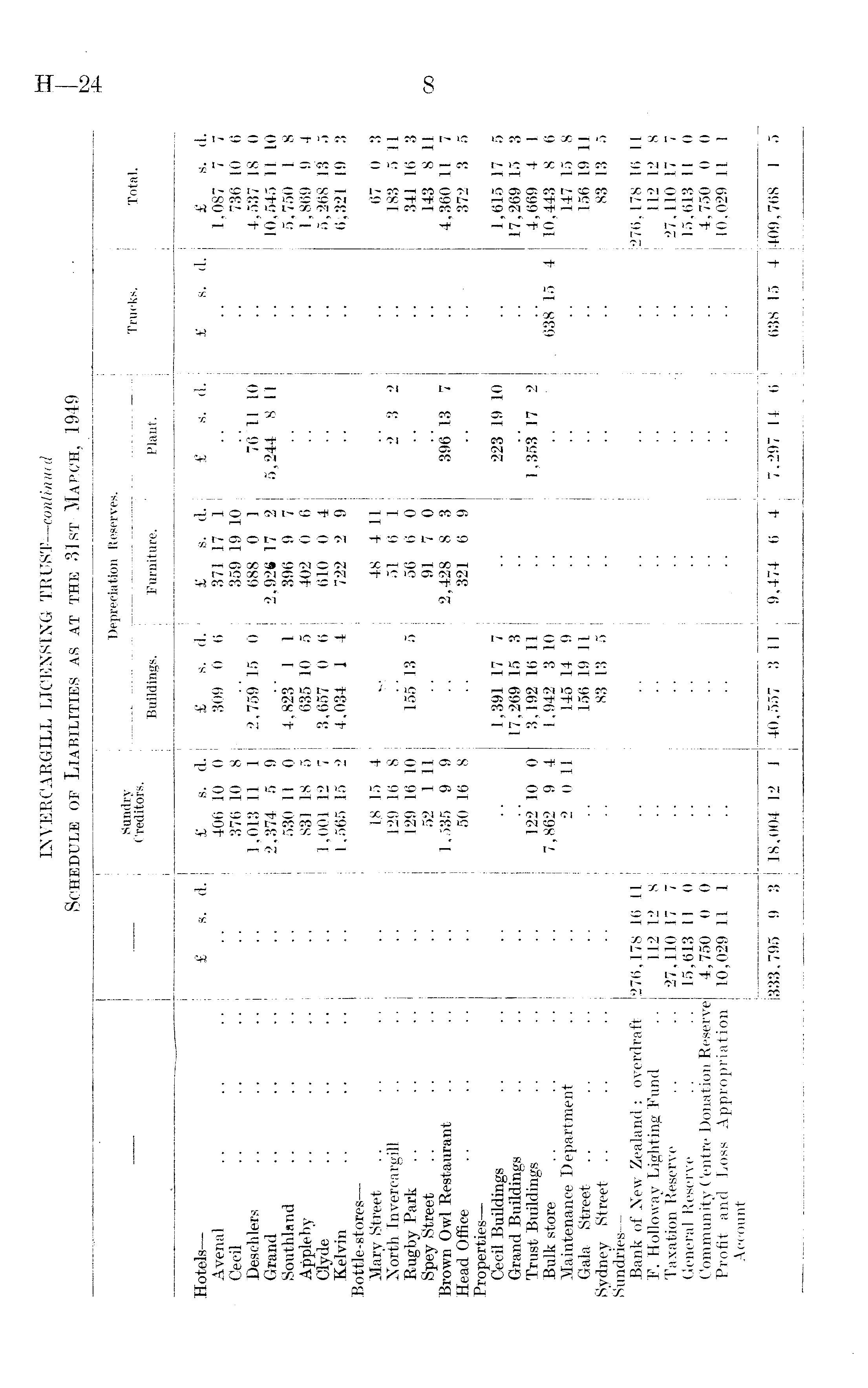 Sundry Creditors. Depreciation Reserves. Trucks. Total. Buildings. Furniture. Plant. Hotels — £ s. d. £ s. d. £ s. d. £ s. d» £ s. d. £ s. d. £ s. d. Avenal 406 10 0 309 0 6 371 17 1 1,087 7 7 Cecil 376 10 8 359 19 10 736 10 6 Deschlers 1,013 11 1 2,759 15 0 688 0 1 76 11 10 4,537 18 0 Grand 2,374 5 9 2,926 17 2 5,244 8 11 10,545 11 10 Southland , . 530 11 0 4,823 1 1 396 9 7 5,750 1 8 Appleby .. 831 1-8 5 635 10 5 402 0 6 1,869 9 4 Clyde 1,001 12 7 3,657 0 6 610 0 4 5,268 13 5 Kelvin 1,565 15 2 4,034 1 4 722 2 9 6,321 19 3 Bottle-stores — Mary Street .. 18 15 4 ,, 48 4 11 67 0 3 North Invercargill 129 16 8 51 6 1 2 3 2 183 5 11 Rugby Park .. 129 16 10 155 13 5 56 6 0 341 16 3 Spey Street 52 1 11 91 7 0 143 8 11 Brown Owl Restaurant 1,535 9 9 2,428 8 3 396 13 7 4,360 11 7 Head Office 50 16 8 321 6 9 372 3 5 Properties — Cecil Buildings 1,391 17 7 223 19 10 1,615 17 5 Grand Buildings 17,269 15 3 17,269 15 3 Trust Buildings 122 10 0 3,192 16 11 1,353 17 2 4,669 4 1 Bulk store 7,862 9 4 1,942 3 10 . 638 15 4 10,443 8 6 Maintenance Department 2 0 11 145 14 9 147 15 8 Gala Street 156 19 11 156 19 11 Sydney Street 83 13 5 83 13 5 Sundries — Bank of New Zealand : overdraft 276,178 16 11 276,178 16 11 F. Holloway Lighting Fund 112 12 8 112 12 8 Taxation Reserve 27,110 17 7 . 27,110 17 7 General Reserve ... 15,613 11 0 15,613 11 0 Community Centre Donation Reserve; 4,750 0 0 4,750 0 0 Profit and Loss Appropriation 10,029 11 1 10,029 11 1 Account 333,795 9 3 18,004 12 1 40,557 3 11 9,474 6 4 7,297 14 6 638 15 4 409,768 1 5