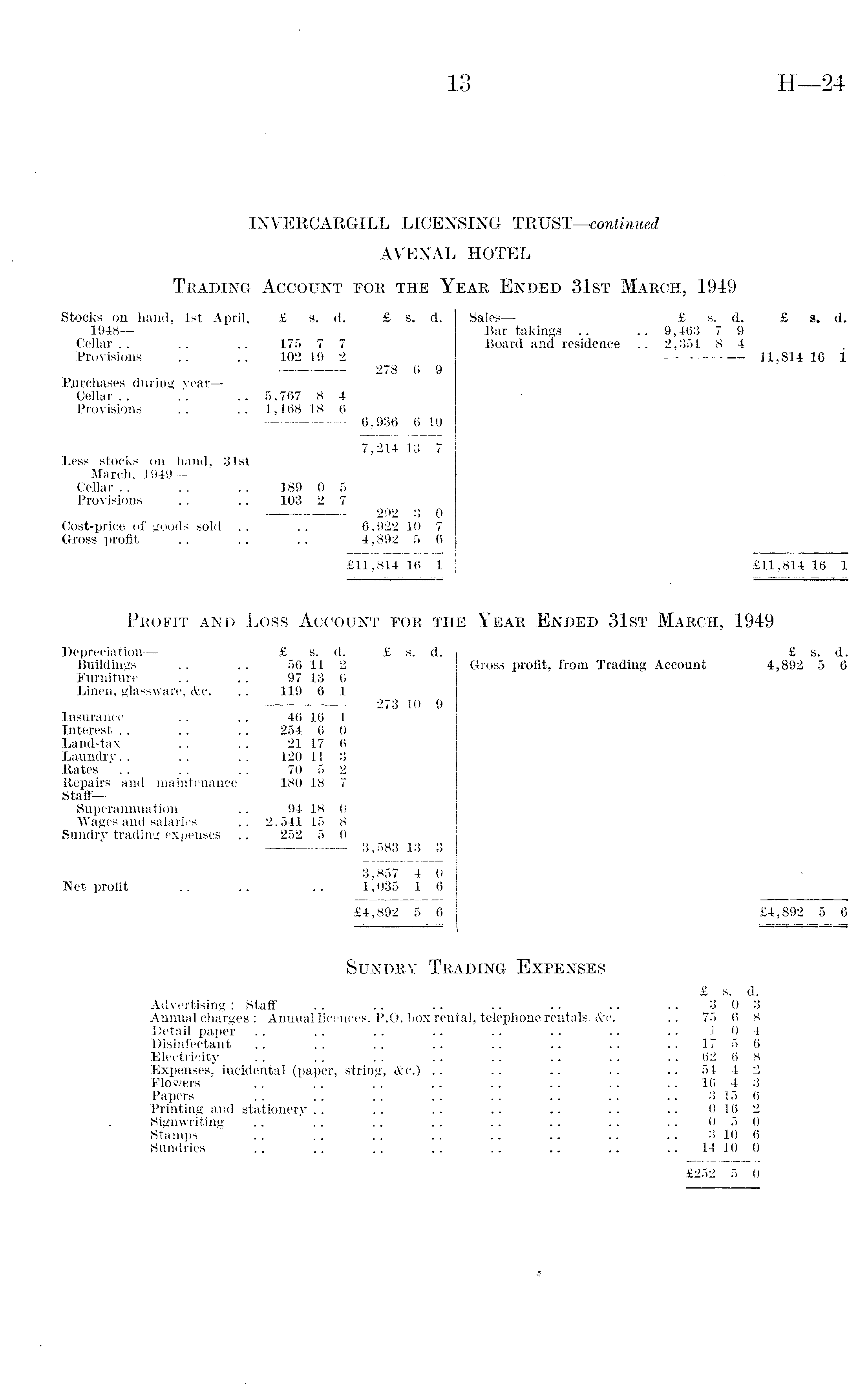 INVERCARGILL LICENSING TRUST —continued AVENAL HOTEL Trading Account for the Year Ended 31st March, 1949 Stocks oil hand, Ist April, £ s. d. £ s. d. Sales — £ s. d. £ s. d. 1948 — Bar takings .. .. 9,463 7 9 Cellar .. .. .. 175 7 7 Board and residence .. 2,351 8 4 Provisions .. .. 102 19 2 11,814 16 1 278 6 9 Purchases during yearCellar .. .. .. 5,767 8 4 Provisions .. .. 1,168 18 6 6,936 6 10 7,214 13 7 Less stocks on hand, 31st March. 1949 Cellar.. .. .. 189 0 5 Provisions .. .. 103 2 7 292 3 0 Cost-price of goods sold .. .. 6,922 10 7 Gross profit .. .. .. 4,892 5 6 £11,814 16 1 £11,814 16 1 Profit and Loss Account for the Year Ended 31st March, 1949 Depreciation— £ s. d. £ s. d. £ s. d. Buildings .. .. 56 11 2 Gross profit, from Trading Account 4,892 5 6 Furniture .. .. 97 13 6 Linen, glassware, &c. .. 119 6 1 273 10 9 Insurance .. .. 46 16 1 Interest .. .. .. 254 6 0 Land-tax .. .. 21 17 6 Laundry.. .. .. 120 11 3 Rates . . .. .. 70 5 2 Repairs and maintenance 180 18 7 Staff— Superannuation .. 94 18 0 Wages and salaries .. 2,541 15 8 • Sundry trading expenses .. 252 5 0 , 3,583 13 3 3,857 4 0 Net profit .. .. .. 1,035 1 6 £4,892 5 6 " £4,892 5 6 Sundry Trading Expenses £ s. d. Advertising : Staff .. .. .. .. .. .. .. 303 Annual charges : Annual licences, P.O. box rental, telephone rentals, <frc. .. 75 6 8 Detail paper .. .. .. .. .. .. .. .. 104 Disinfectant .. .. .. .. .. .. .. 17 5 6 Electricity . . .. . . .. .. .. .. 62 6 8 Expenses, incidental (paper, string, &e.) .. .. .. .. 54 4 2 Flowers .. .. .. .. .. .. .. 16 4 3 Papers .. .. .. .. .. .. .. • 3 15 6 Printing and stationery .. .. .. .. .. .. .. 0 16 2 Signwriting .. .. .. .. .. .. .. .. 050 Stamps .. .. .. .. .. .. .. .. 3 10 6 Sundries .. .. .. .. .. .. .. 14 10 0 £252 5 0