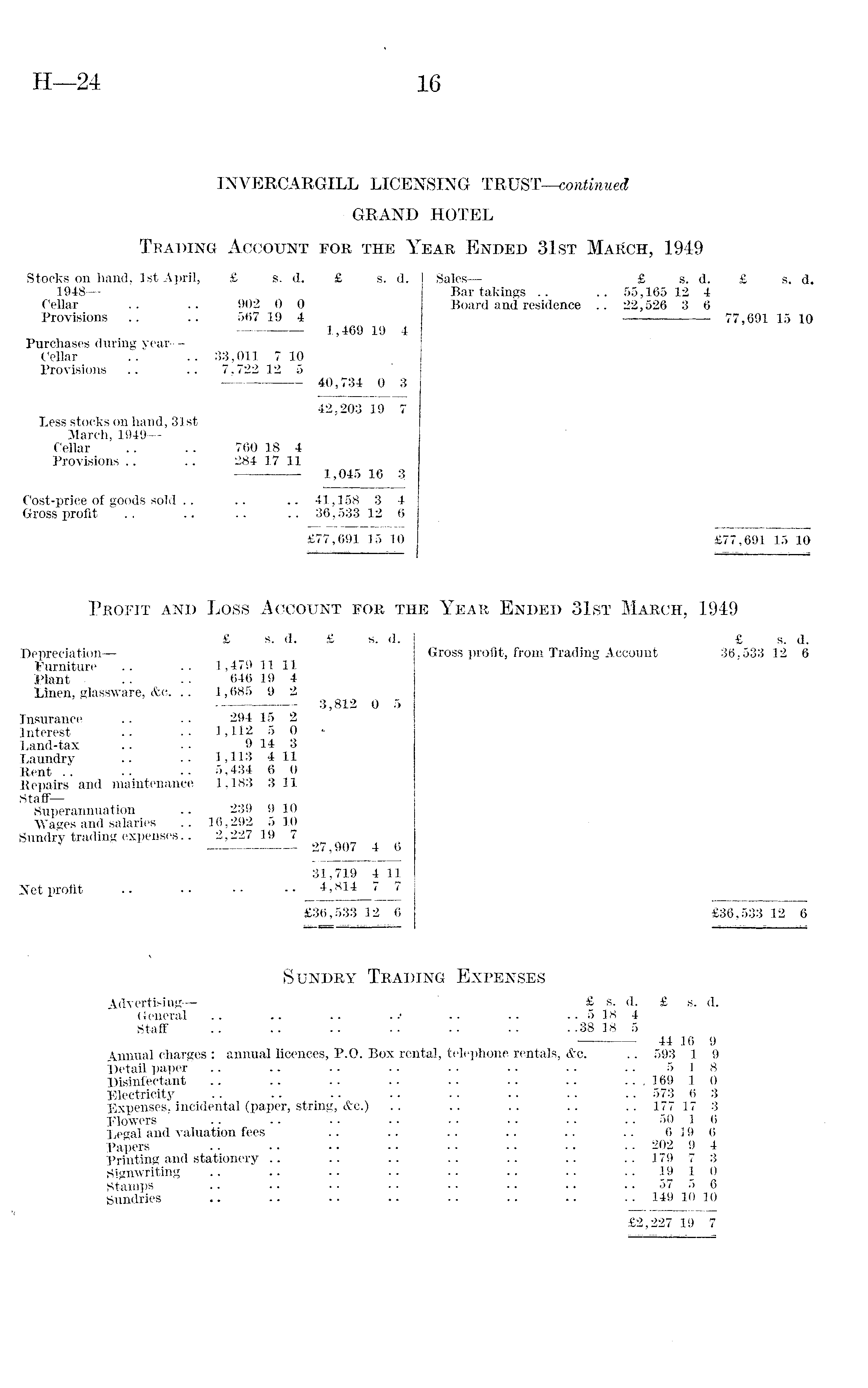 INVERCARGILL LICENSING TRUST—continued GRAND HOTEL Trading Account for the Year Ended 31st March, 1949 Stocks, on hand, Ist April, £ s. d. £ s. d. Sales — £ s. d. £ s. d. 1948 Bar takings .. .. 55,165 12 4 Cellar .. .. 902 0 0 Board and residence .. 22,526 3 6 Provisions .. .. 567 19 4 77,691.15 10 1,469 19* 4 Purchases during year— Cellar .. .. 33,011 710 Provisions .. .. 7,722 12 5 40,734 0 3 42,203 19 7 Less stocks on hand, 31st March, 1949 Cellar .. .. 760 18 4 Provisions .. .. 284 17 11 1,045 16 a Cost-price of goods sold .. .. .. 41,158 3 4 Gross profit .. .. .. .. 36,533 12 6 £77,691 15 10 £77,691 15 10 Profit and Loss Account for the Year Ended 31st March, 1949 £ s. d. £ s. d. £ s. d. Depreciation— Gross profit, from Trading Account 36,533 12 6 Furniture .. .. 1,479 11 11 Plant 646 19 4 Linen, glassware, &c. .. 1,685 9 2 3,812 0 5 Insurance .. .- 294 15 2 Interest .. . ■ 1,112 5 0 Land-tax .. .. 9 14 3 Laundry .. •• 1,113 411 Rent 5,434 6 0 Repairs and maintenance 1,183 311 Staff — Superannuation .. 239 9 10 Wages and salaries .. 16, 292 510 Sundry trading expenses.. 2,227 19 7 — 27,907 4 6 31,719 4 11 Net profit .. •• •• -- 4,814 7 7 £36,533 12 6 £36,533 12 6 Sundry Trading Expenses £ s. d. £ s. d. General .. .. .. ■■ ■ - ■ .. 5 18 4 Staff .. -. .• •• •• •■ ..38 18 5 44 16 9 Annual charges : annual licences, P.O. Box rental, telephone rentals, &c. .. 593 1 9 Detail paper .. .. .. .. .. ••. .. .. 5 18 Disinfectant .. .. .. .. .. .. .. ... 169 1 0 Electricity .. .. .. .. .. .. .. .. 573 6 3 Expenses, incidental (paper, string, &c.) .. .. .. .. .. 177 17 3 Flowers .. .. •. .. . • • • .. 50 1 6 Legal and valuation fees .. .. .. .. .. .. 6 19 6 Papers .. 202 9 4 Printing and stationery .. .. .. .. .. .. .. 179 7 3 Signwriting .. .. .. .. .. .. .. 19 1 0 Stamps .. .. • • • • • • • - • • 57 5 6 Sundries .. . - • • • • • • • • • • • • 149 10 10 £2,227 19 7