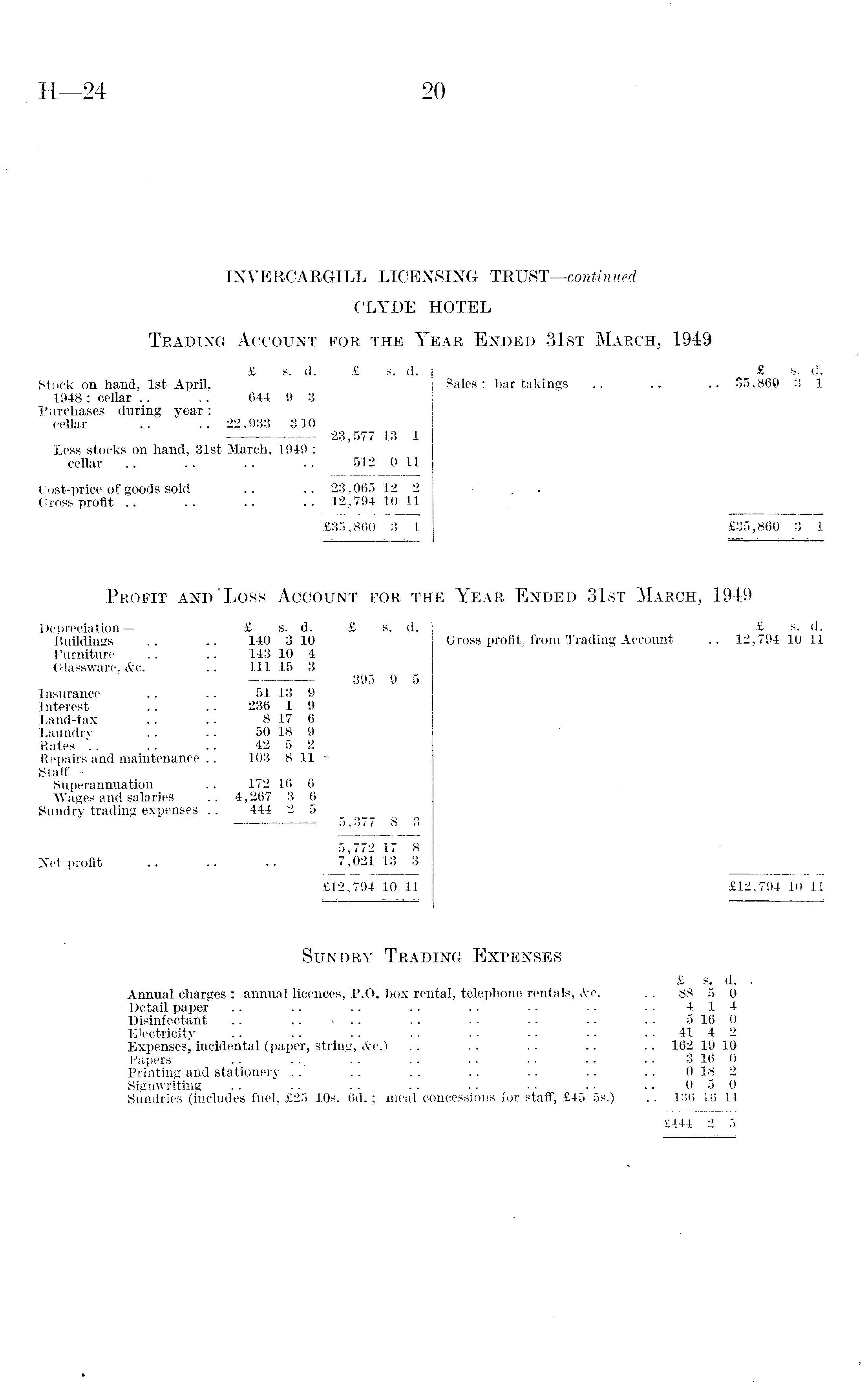 INVERCARGILL LICENSING TRUST —continued CLYDE HOTEL Trading Account for the Year Ended 31st March, 1949 £ s. d. £ s. d. £ s. d. Stock oil hand, Ist April, Sales t bar takings .. .. .. 35,860 3 1 1948 : cellar .. .. 644 9 3 Purchases during year: cellar .. .. 22,933 310 23,577 13 1 Less stocks on hand, 31st March, 1949 : cellar .. 512 0 11 Cost-price of goods sold .. .. 23,065 12 2 - . Gross profit .. .. .. .. 12,794 10 11 £35,860 3 1 £35,860 3 1 Profit and' Loss Account for the Year Ended 31st March, 1949 Depreciation— £ 's. d. £ s. d. £ s. d. Buildings .. .. 140 3 10 Gross profit, from Trading Account .. 12,794 10 11 Furniture .. .. 143 10 4 Glassware. &c. .. 11l 15 3 395 9 5 Insurance .. .. 51 13 9 Interest .. .. 236 1 9 Land-tax .. .. 8 17 6 Laundry .. .. 50 18 9 Rates .. .. .. 42 5 2 Repairs and maintenance .. 103 8 11 - StaffSuperannuation .. 172 16 6 Wages and salaries .. 4,267 3 6 Sundry trading expenses .. 444 2 5 5,377 8 3 5,772 17 8 ' Net profit .. .. .. 7,021 13 3 £12,794 10 11 £12,794 10 11 Sundry Trading Expenses £ s. d. . Annual charges : annual licences, P.O. box rental, telephone rentals, &c. .. 88 5 0 Detail paper .. .. .. .. .. -. -- 414 Disinfectant .. .. < .. ~ .. .. ■ ■ .. 516 0 Electricity .. .. .. .. .. ■. . ■ 41 4 2 Expenses, incidental (paper, string, <frc.) .. .. .. .. .. 162 19 10 Papers .. ... .. .. .. ■. .. .. 3 16 0 Printing and stationery .. .. .. .. .. .. .. 0 18 2 Sigmvriting .. .. .. .. .. .. .. .. 050 Sundries (includes fuel, £25 10s. 6d.; meal concessions for staff, £45 55.) .. 136 16 11 £444 2 5
