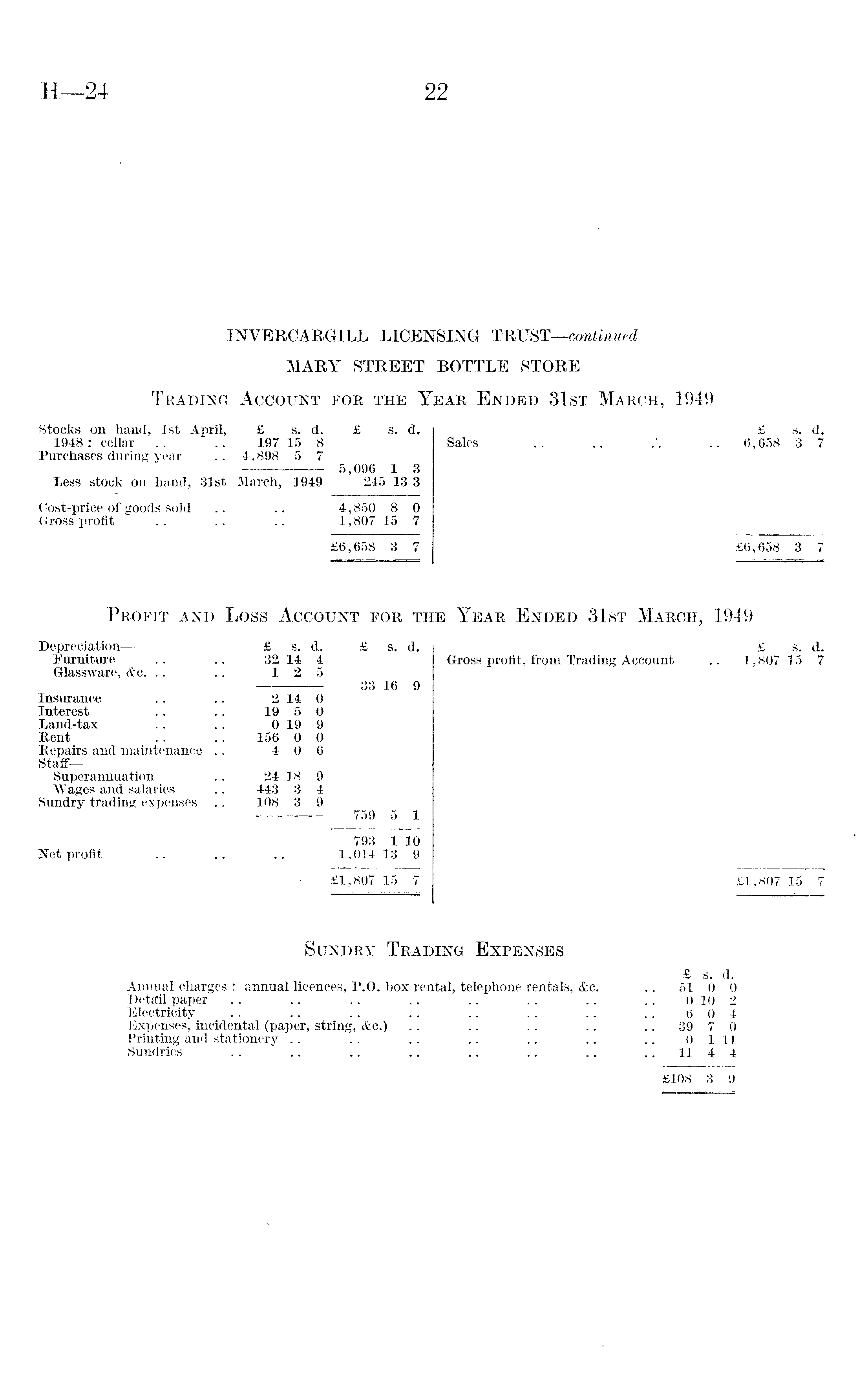INVERCARGILL LICENSING TRUST—continued MARY STREET BOTTLE STORE Trading Account for the Year Ended 31st March, 1949 Stocks on hand, Ist April, £ s. d. £ s. d. £ s. d. 1948: cellar .. .. 197 15 8 Sales .. .. .. 6,658 3 7 Purchases during year .. 4,898 5 7 5,096 1 3 Less stock on hand, 31st March, 1949 245 13 3 Cost-price of goods sold .. .. 4,850 8 0 Gross profit .. .. .. 1,807 15 7 £6,658 3 7 £6,658 3 7 Profit and Loss Account for the Year Ended 31st March, 1949 Depreciation— £ s. d. £ s. d. £ s. d. Furniture .. .. 32 14 4 Gross profit, from Trading Account .. 1,807 15 7 Glassware, &c. .. .. 12 5 33 16 9 Insurance .. .. 2 14 0 Interest .. .. 19 5 0 Land-tax .. .. 0 19 9 Rent .. .. 156 0 0 Repairs and maintenance .. 4 0 6 StaffSuperannuation .. 24 18 9 Wages and salaries .. 443 3 4 Sundry trading expenses .. 108 3 9 759 5 1 793 1 10 Net profit .. .. .. 1,014 13 9 £1,807 15 7 £1,807 15 7 Sundry Trading Expenses £ s. d. Annual charges r annual licences, P.O. box rental, telephone rentals, &e. .. 51 0 0 Detail paper .. .. .. .. .. .. .. .. 010 2 Electricity .. .. .. .. .. .. .. .. 604 Expenses, incidental (paper, string, &c.) .. .. .. .. .. 39 7 0 Printing and stationery .. .. .. .. .. .. .. 0 1 11 ■ Sundries .. .. .. .. .. .. .. .. 11 4 4 £lOB 3 9