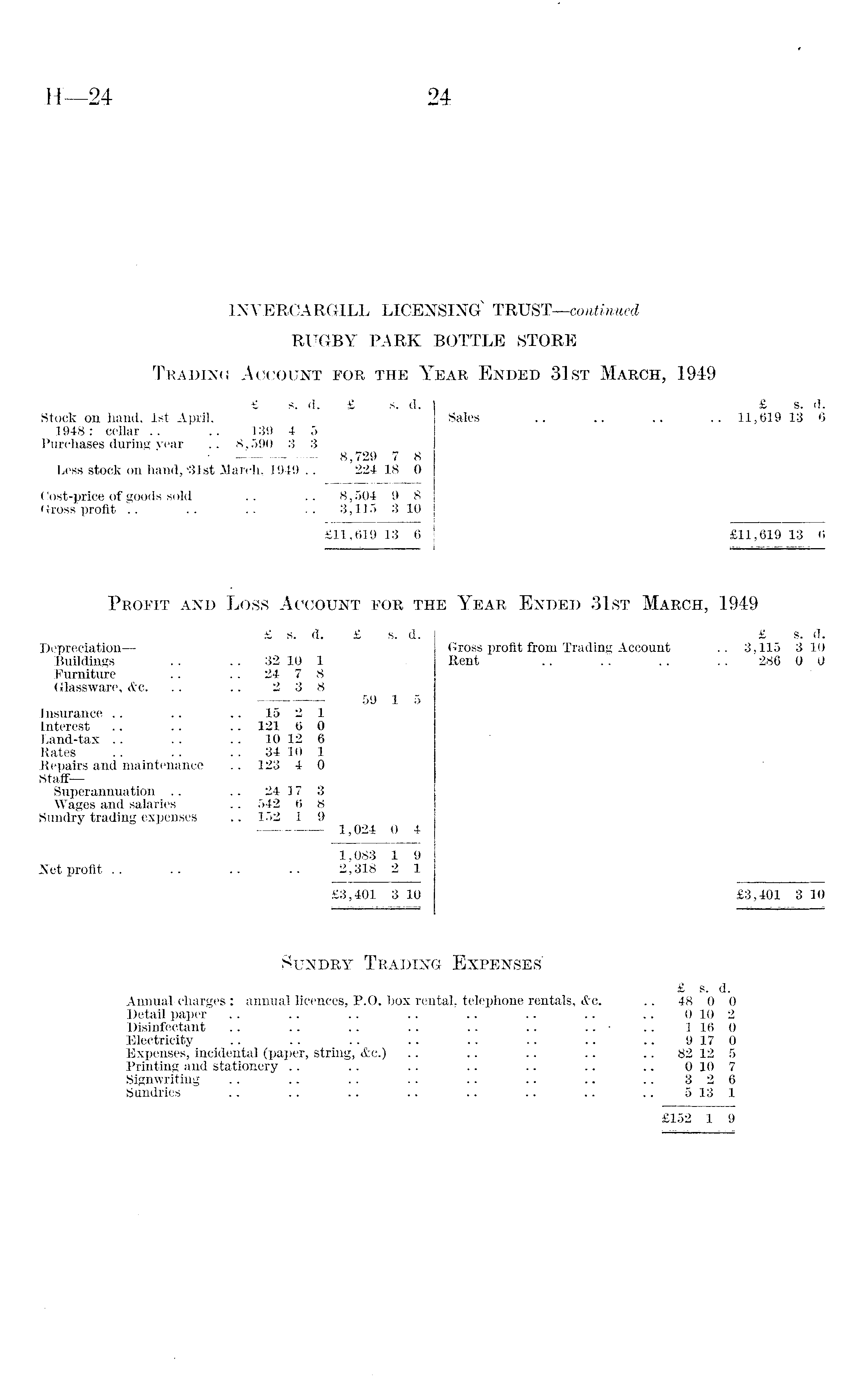 INVERCARGILL LICENSING' TRUST—continued RUGBY PARK BOTTLE STORE Trading Account for the Year Ended 31st March, 1949 £ s. d. £ s. d. £ s. d. Stock on hand, Ist April, Sales .. .. .. .. 11,619 13 6 1948 : cellar .. .. 139 4 5 Purchases during year .. 8,590 3 3 8,729 7 8 Less stock on hand, >3lst March, 1949 .. 224 18 0 Cost-price of goods sold .. .. 8,504 9 8 Gross profit ". .. .. .. 3,115 310 £11,619 13 6 £11,619 13 0 Profit and Loss Account for the Year Ended 31st March, 1949 £ s. d. £ s. d. . £ s. A. Depreciation— Gross profit from Trading Account .. 3,115 310 Buildings .. 32 10 1 . Rent .. .. .. .. 286 0 0 Furniture . . . . 24 7 8 Glassware, &c. .. .. 2 3 8 59 1 5 Insurance .. .. .. 15 2 1 Interest .. .. .. 121 6 0 Land-tax .. .. .. 10 12 6 Rates .. .. .. 34 10 1 Repairs and maintenance .. 123 4 0 StaffSuperannuation .. .. 24 17 3 Wages and salaries .. 542 6 8 Sundry trading expenses .. 152 1 9 1,024 0 4 1,083 1 9 Net profit .. .. .. .. 2,318 2 1 £3,401 3 10 £3,401 3 10 Sundry Trading Expenses" £ s. d. Annual charges : annual licences, P.O. box rental, telephone rentals, &c. .. 48 0 0 Detail paper .. .. .. .. .. .. .. .. 010 2 Disinfectant .. .. .. .. .. .. .. - .. 116 0 Electricity .. .. .. .. .. .. .. .. 9 17 0 Expenses, incidental (paper, string, &c.) .. .. .. .. .. 82 12 5 Printing and stationery .. .. .. .. .. .. .. 0 10 7 Signwriting .. .. .. .. .. .. .. .. 326 Sundries .. .. .. .. .. .. .. .. 5 13 1 £152 1 9