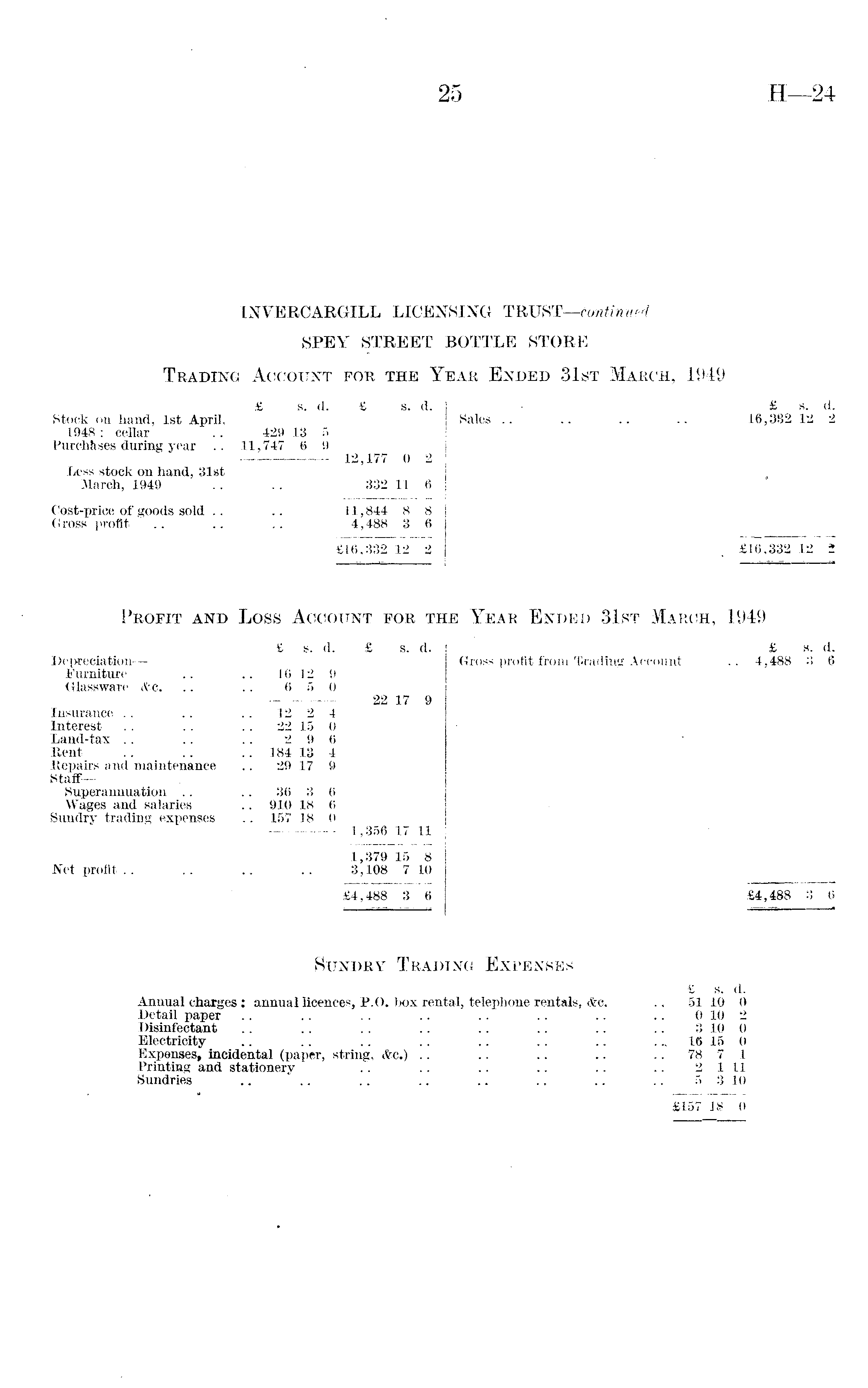 INVERCARGILL LICENSING TRUST —continued SPEY STREET BOTTLE STORE Trading Account for the Year Ended 31st March, 1949 £ s. d. £ s. d. £ s. d. Stock on hand, Ist April, Sales .. .. .. .. 16,382 12 2 1948: cellar .. 429 IS 5 Purchases during year .. 11,747 6 9 12,177' 0 2 Less stock on hand, 31st March, 1949 .. .. 332 11 6 Cost-price of goods sold .. .. 11,844 8 8 Cross profit .. .. .. 4,488 3 6 £16,332 12 2 . £16,332 12 2 Profit and Loss Account for the Year Ended 31st March, 1949 £ s. d. £ s. d. £ s. d. Depreciation— Gross profit from Trading Account .. 4,488 3 6 Furniture .. .. 16 12 9 Glassware &c. .. .. 6 5 0 22 17 9 Insurance ...... 12 2 4 Interest .. .. 22 15 0 i Land-tax ...... 2 9 6 Rent .. .. .. 184 13 4 Repairs and maintenance .. 29 17 9 Staff— Superannuation .. .. 36 3 6 Wages and salaries .. 910 18 6 Sundry trading expenses .. 157 18 0 1,356 17 11 1,379 15 8 Net profit . . .. .. .. 3,108 7 10 £4,488 3 6 £4,488 3 6 Sundry Trading Expenses £ s. d. Annual charges : annual licences, P.O. box rental, telephone rentals, <fte. .. 51 10 0 Detail paper .. .. .. .. .. .. .. .. 010 2 Disinfectant .. .. .. .. .. .. .. .. 3 10 0 Electricity .. .. .. .. .. .. .. ... 16 15 0 Expenses, incidental (paper, string, &c.) .. .. .. .. 78 7 1 Printing and stationery .. .. .. .. .. .. 2 1 11 Sundries .. .. .. .. .. .. .. .. 5 3 10 £157 18 0