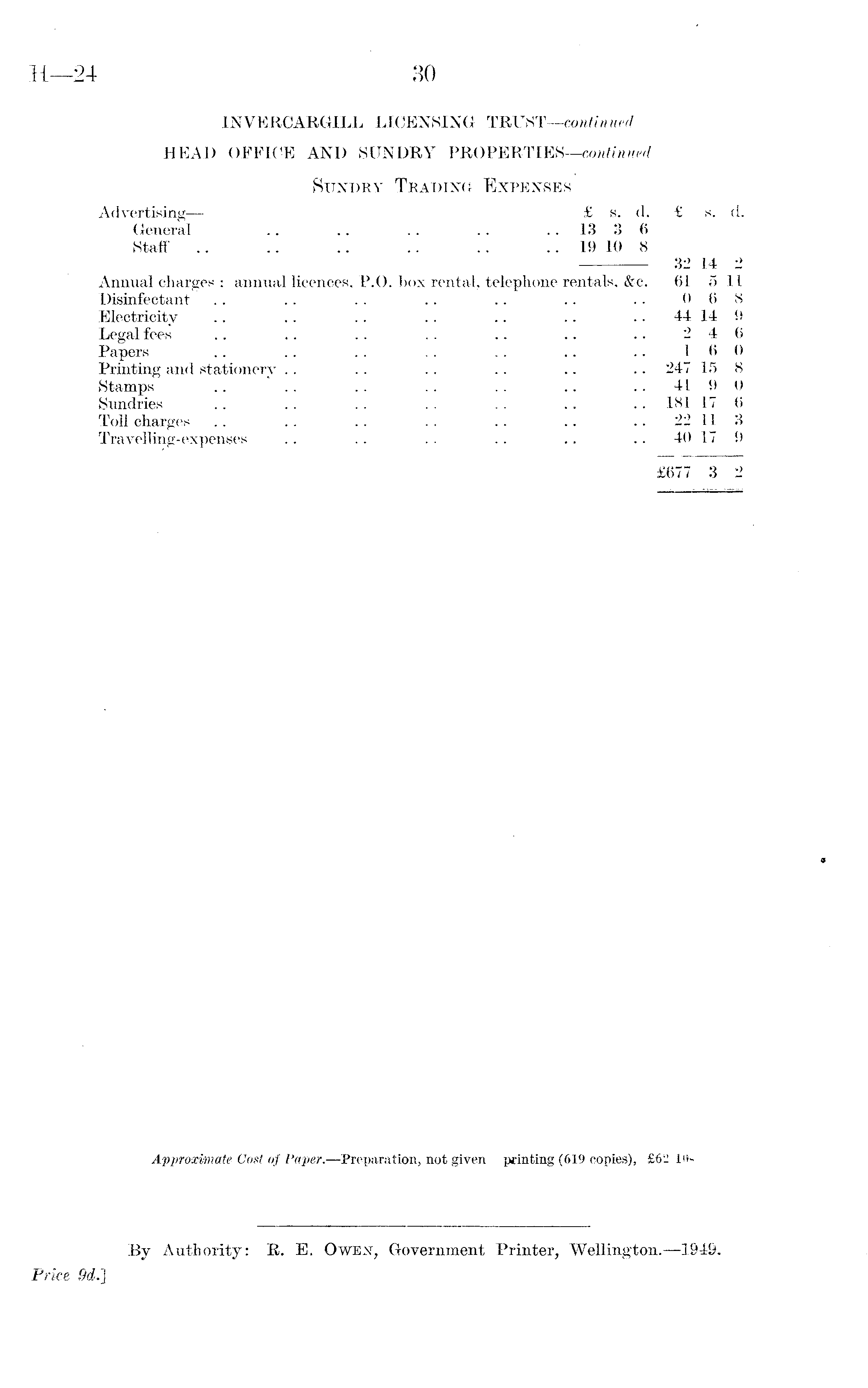 INVERCARGILL LICENSING TRUST —continued HEAD OFFICE AND SUNDRY PROPERTlES—continued Sundry Trading Expenses Advertising— £ s. d. £ s. d. General .. .. .. .. 13 3 6 Staff .. .. .. .. .. .. 19 10 8 32 14 2 Annual charges : annual licences, P.O. box rental, telephone rentals, &c. 61 511 Disinfectant .. .. .. .. .. .. .. 068 Electricity .. .. .. .. .. .. 44 14 9 Legal fees .. .. .. .. .. .. .. 246 Papers .. .. .. .. .. .. .. 160 Printing and stationery .. . . .. .. .. .. 247 15 8 Stamps .. .. .. . . . . .. 41 9 0 Sundries .. .. .. .. .. .. -. 181 17 6 Toll charges .. .. .. .. .. .. 22 11 3 Travelling-expenses .. .. .. .. .. 40 17 9 £677 3 2 Approximate Cost of Paper.—Preparation, not given printing (619 copies), £62 l(t<