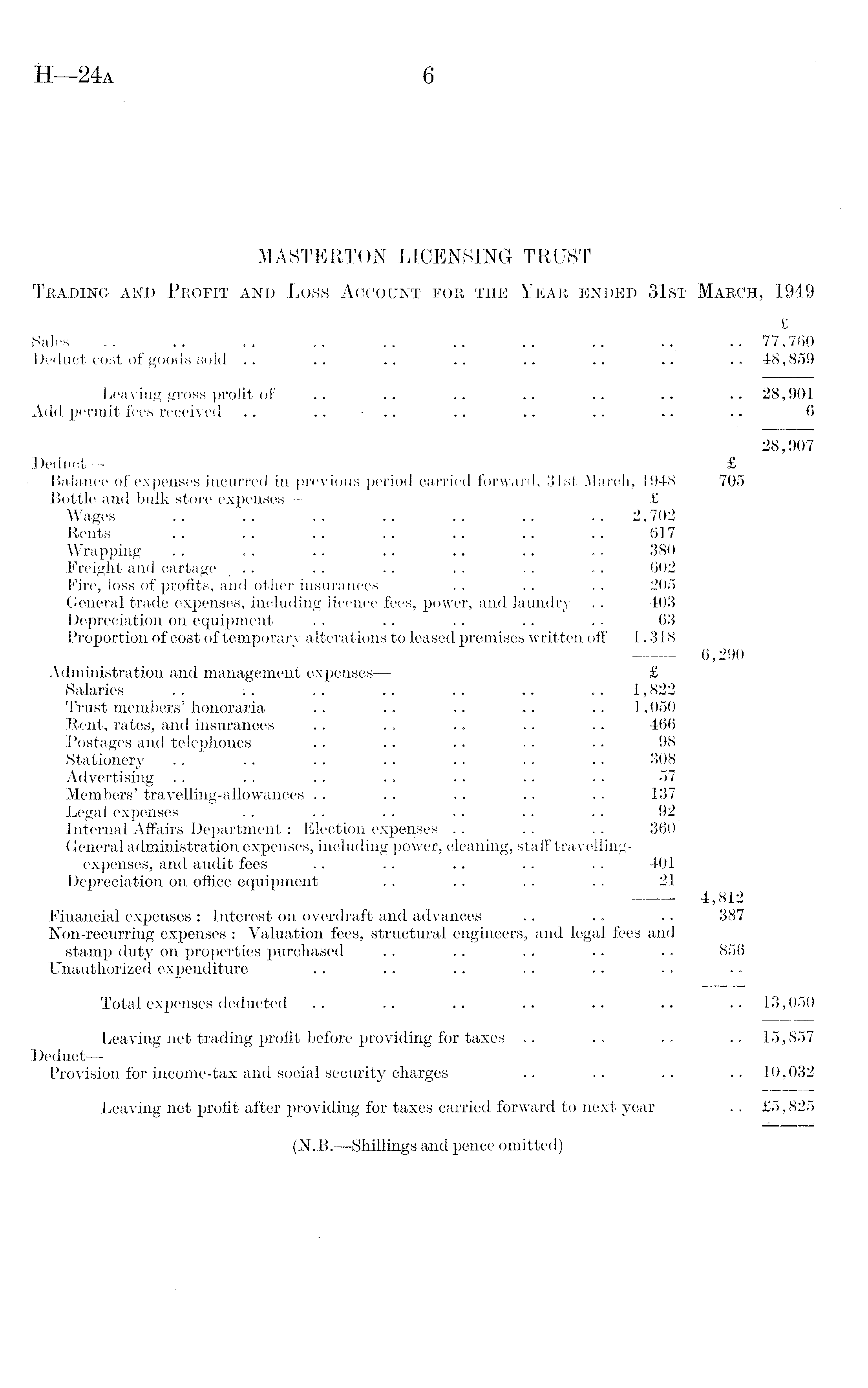 MASTERTON LICENSING TRUST Trading and Profit and Loss Account for the Year ended 31st March, 1949 £ Sales .. .. .. .. .. .. .. .. 77,760 Deduct cost of goods sold .. .. .. .. .. .. .. 48,859 Leaving gross profit of .. .. .. .. .. .. .. 28,901 Add permit fees received .. .. .. .. .. .. .. .. 6 28,907 Deduct — £ Balance of expenses incurred in previous period carried forward, 31st March, 1948 705 Bottle and bulk store expenses— £ Wages .. .. .. .. .. .. .. 2,702 Rents .. .. .. .. .. .. .. 617 Wrapping .. .. .. .. .. .. .. 380 Freight and cartage .. .. .. .. ~ .. 602 Fire, loss of profits, and other insurances .. .. .. 205 General trade expenses, including licence fees, power, and laundry .. 403 Depreciation on equipment . . .. . . .. .. 63 Proportion of cost of temporary alterations to leased premises written off 1,318 6,290 Administration and management expenses— £ Salaries .. .. .. .. .. .. .. 1,822 Trust members' honoraria .. .. .. .. 1,050 Rent, rates, and insurances .. .. .. .. .. 466 Postages and telephones .. .. .. T. .. 98 Stationery .. .. .. .. .. .. .. 308 Advertising .. .. .. .. .. .. .. 57 Members' travelling-allowances .. .. .. ;. .. 137 Legal expenses .. .. .. .. .. .. 92 Internal Affairs Department: Election expenses .. .. .. 360 General administration expenses, including power, cleaning, stalf travellingexpenses, and audit fees .. .. .. .. .. 401 Depreciation on office equipment .. .. .. .. 21 4,812 Financial expenses : Interest on overdraft and advances .. .. .. 387 Non-recurring expenses : Valuation fees, structural engineers, and legal fees and stamp duty on properties purchased .. . . .. .. .. 856 Unauthorized expenditure Total expenses deducted .. .. .. .. .. .. .. 13,050 Leaving net trading profit before providing for taxes .. .. .. .. 15,857 Deduct — Provision for income-tax and social security charges .. .. .. .. 10,032 Leaving net profit after providing for taxes carried forward to next year .. £5,825 (N.B. —Shillings and pence omitted)