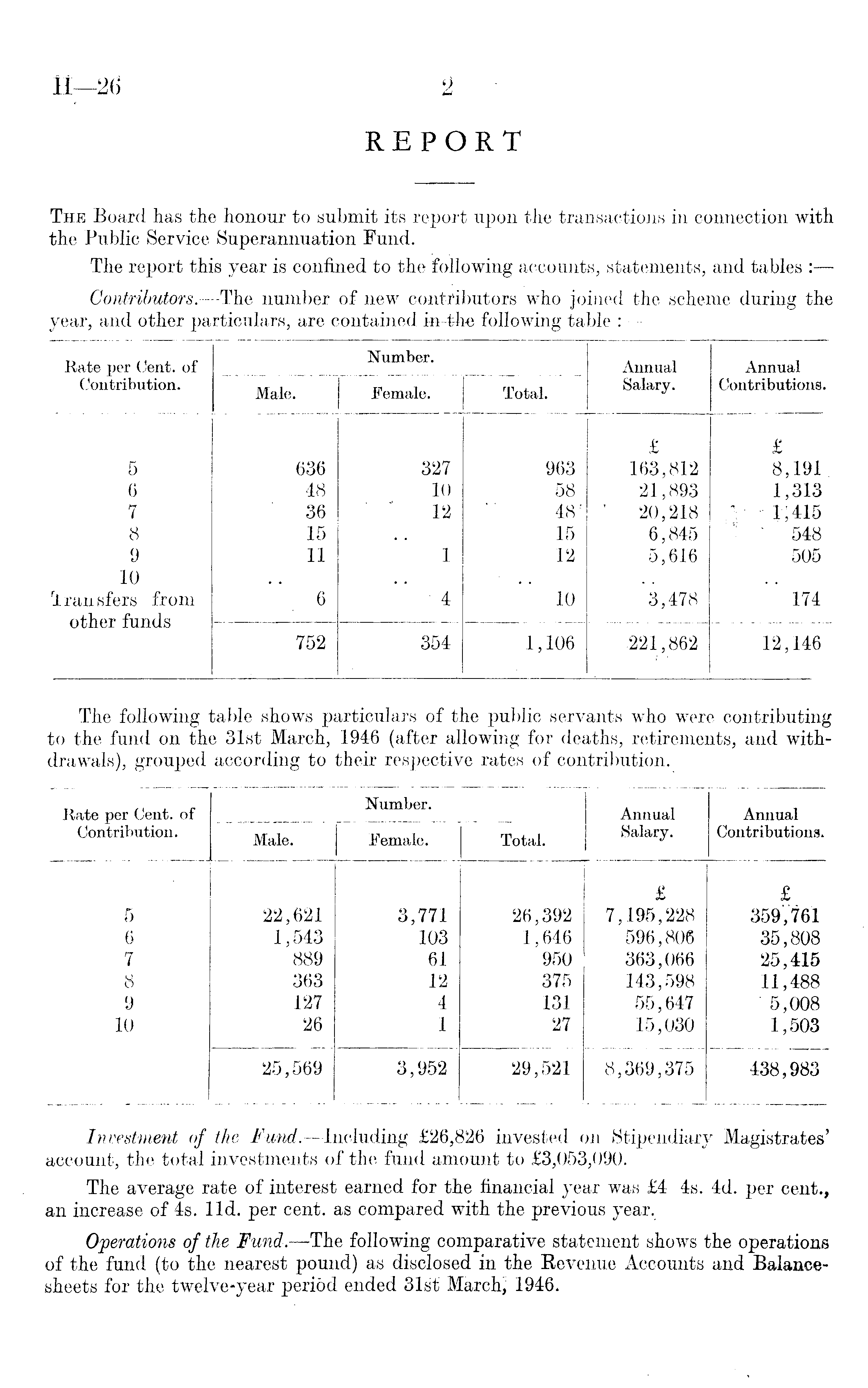 REPORT The Board has the honour to submit its report upon the transactions in connection with the Public Service Superannuation Fund. The report this year is confined to the following accounts, statements, and tables : Contributors. —The number of new contributors who joined the scheme during the year, and other particulars, are contained in-the following table :