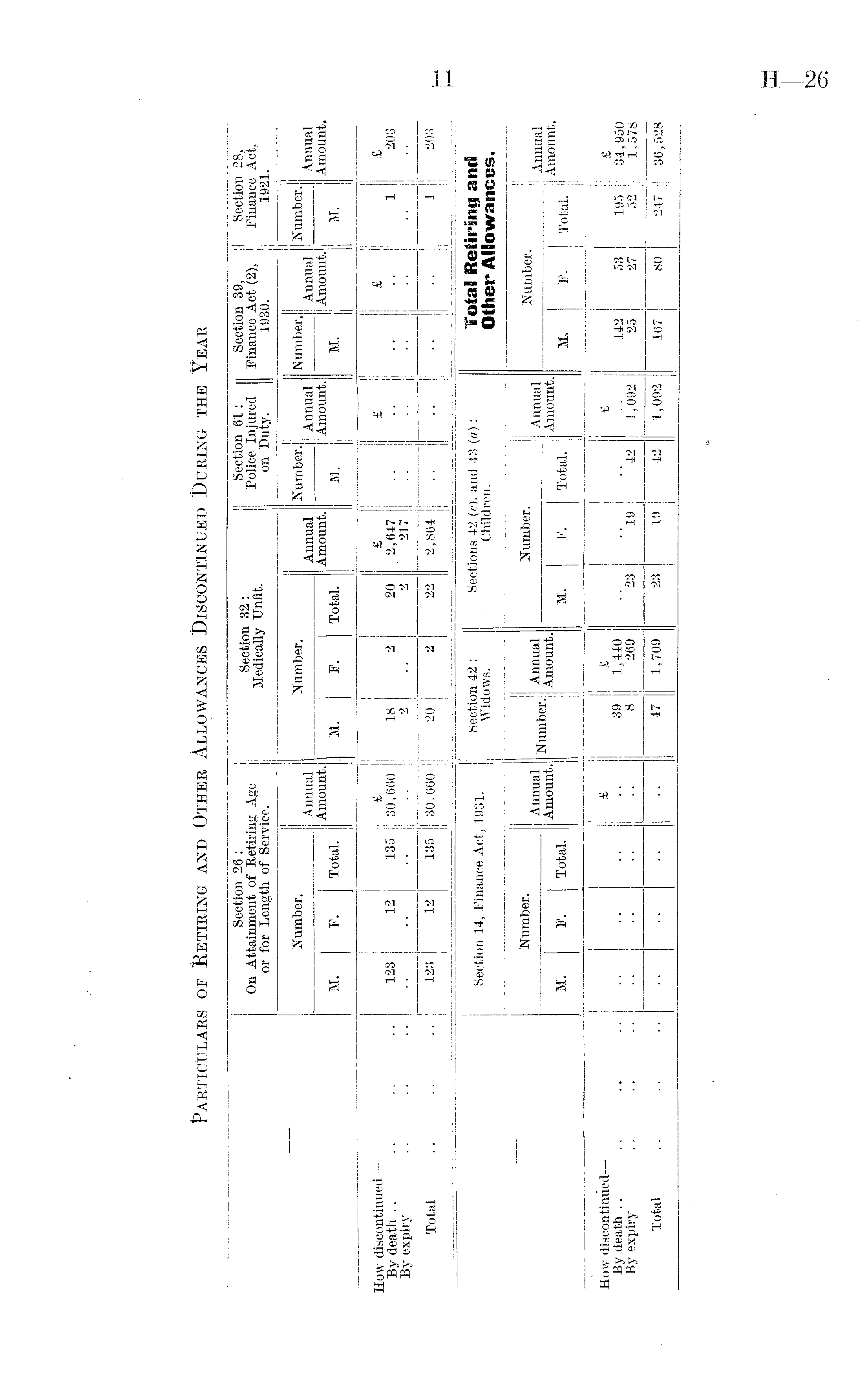 — Section 26 : On Attainment of Retiring Age or for Length of Service. Section 32 : Medically Unfit. Section 61: Police Injured on Duty. Section 39, Finance Act (2), 1930. Section 28, Finance Act, 1921. Number. Annual Amount. Number. Annual Amount. 1 Number. Annual Amount. Number. Annua] Amount. Number. Annual Amount. M. F. Total. M. F. Total. M. M. M. How discontinued — By death By expiry Total 123 12 135 £ 30,660 18 2 2 20 2 £ 2,647 217 £ £ 1 £ 203 123 12 135 30,660 ' 20 2 22 2,864 1 203 Section 14, Finance Act, 1931. Section 42 : Widows. Sections 42 (c), and 43 (a): Children. Total Retiring and Other* Allowances. Number. Annual Amount. Number. Annual Amount. Number. Annual Amount. Number, Annual Amount. M. F. Total. M. F. Total. M. F. Total. How discontinued —- By death By expiry . Total £ 39 8 £ 1,440 269 "23 19 ' '42 £ 1,092 142 25 53 27 195 52 £ 34,950 J 1,578 47 1,709 23 19 42 •1,092 167 80 247 36,628 1