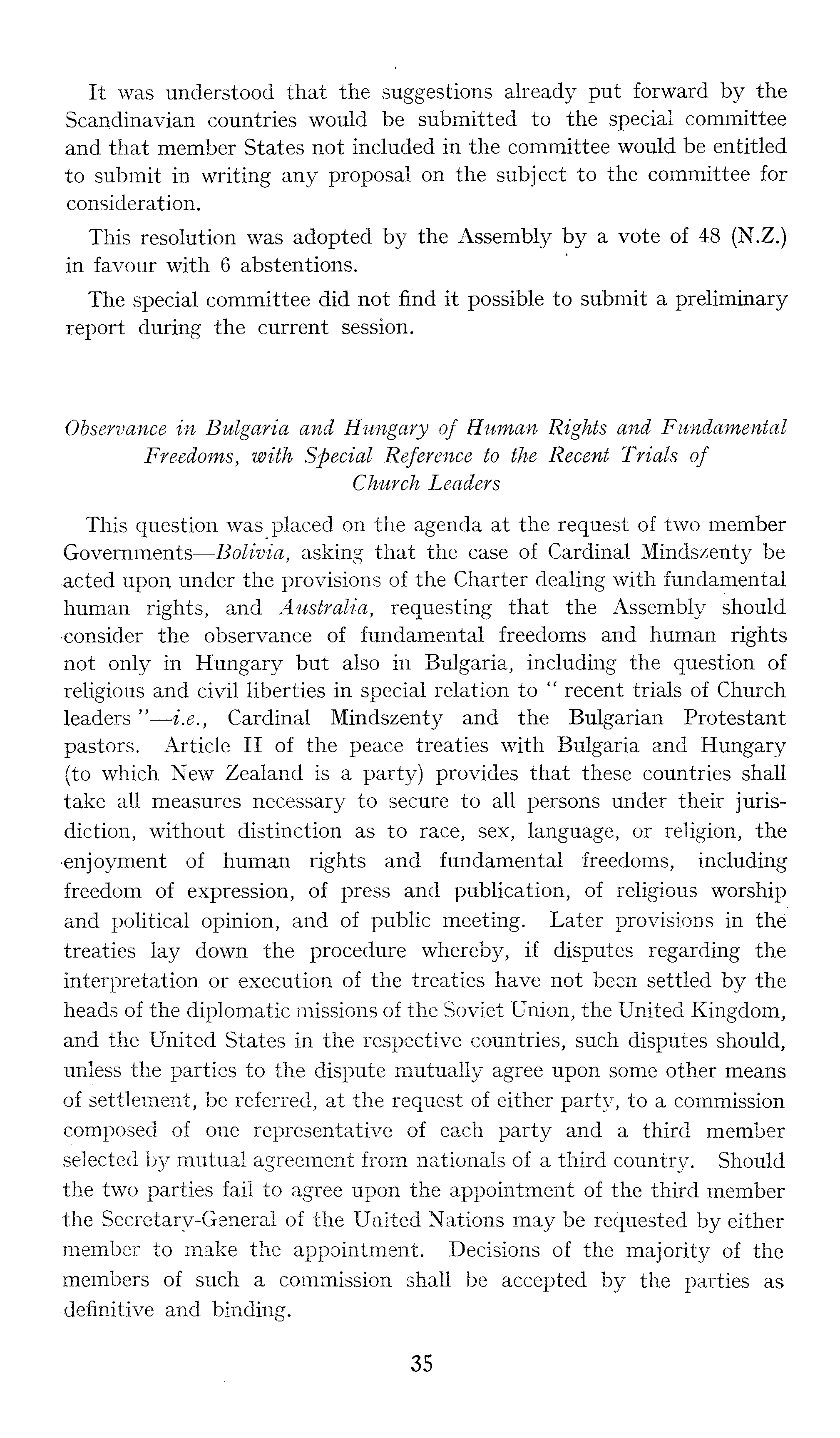It was understood that the suggestions already put forward by the Scandinavian countries would be submitted to the special committee and that member States not included in the committee would be entitled to submit in writing any proposal on the subject to the committee for consideration. This resolution was adopted by the Assembly by a vote of 48 (N.Z.) in favour with 6 abstentions. The special committee did not find it possible to submit a preliminary report during the current session. Observance in Bulgaria and Hungary of Human Rights and Fundamental Freedoms, with Special Reference to the Recent Trials of Church Leaders This question was placed on the agenda at the request of two member Governments —Bolivia, asking that the case of Cardinal Mindszenty be acted upon under the provisions of the Charter dealing with fundamental human rights, and Australia, requesting that the Assembly should ■consider the observance of fundamental freedoms and human rights not only in Hungary but also in Bulgaria, including the question of religious and civil liberties in special relation to " recent trials of Church leaders"—i.e., Cardinal Mindszenty and the Bulgarian Protestant pastors. Article II of the peace treaties with Bulgaria and Hungary (to which New Zealand is a party) provides that these countries shall lake all measures necessary to secure to all persons under their jurisdiction, without distinction as to race, sex, language, or religion, the -enjoyment of human rights and fundamental freedoms, including freedom of expression, of press and publication, of religious worship and political opinion, and of public meeting. Later provisions in the treaties lay down the procedure whereby, if disputes regarding the interpretation or execution of the treaties have not been settled by the heads of the diplomatic missions of the Soviet Union, the United Kingdom, and the United States in the respective countries, such disputes should, unless the parties to the dispute mutually agree upon some other means of settlement, be referred, at the request of either party, to a commission composed of one representative of each party and a third member selected by mutual agreement from nationals of a third country. Should the two parties fail to agree upon the appointment of the third member the Secretary-General of the United Nations may be requested by either member to make the appointment. Decisions of the majority of the members of such a commission shall be accepted by the parties as definitive and binding.